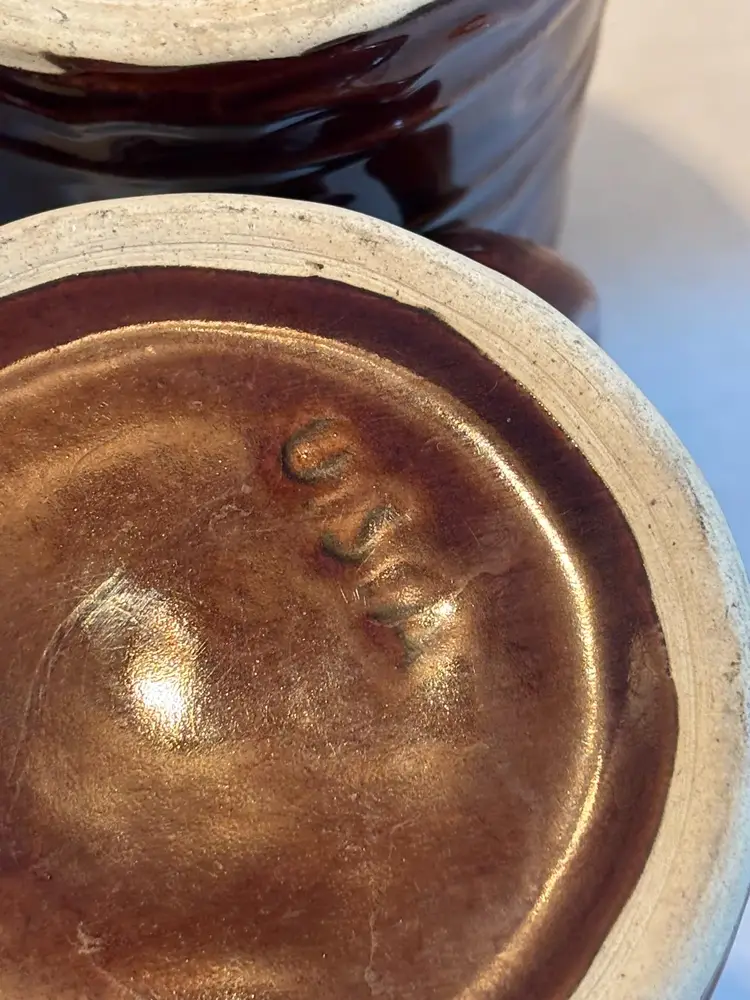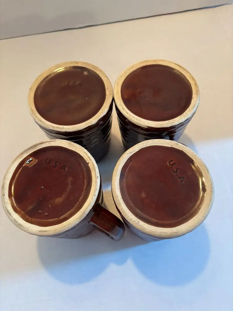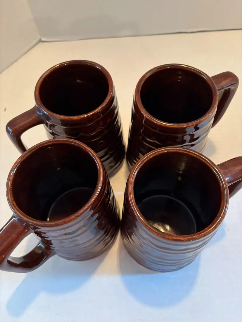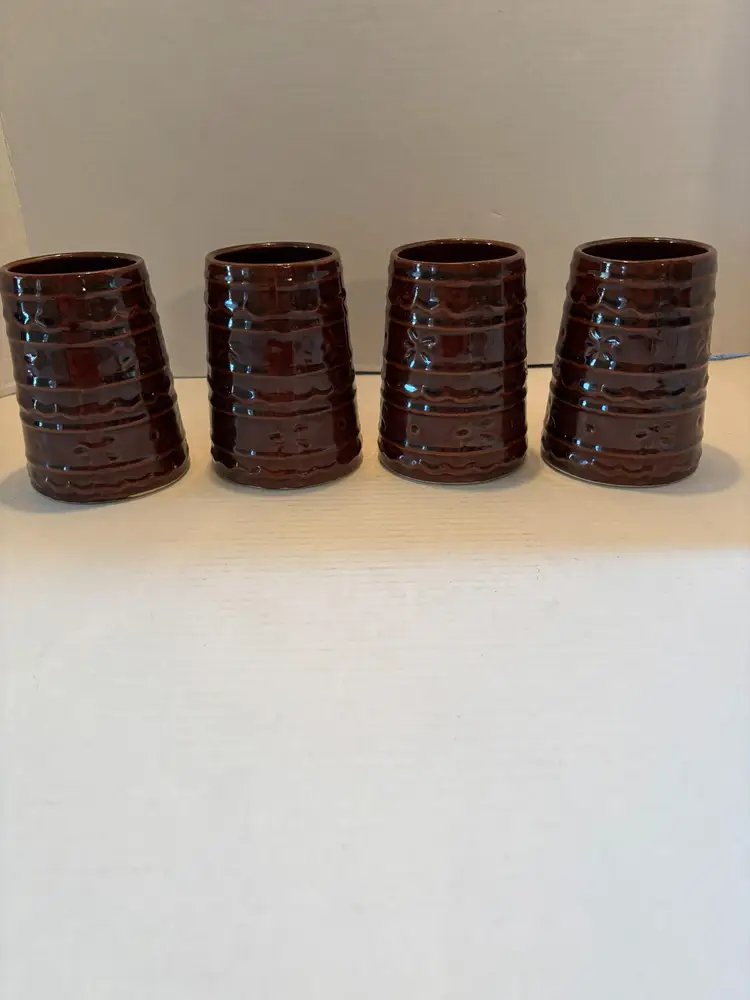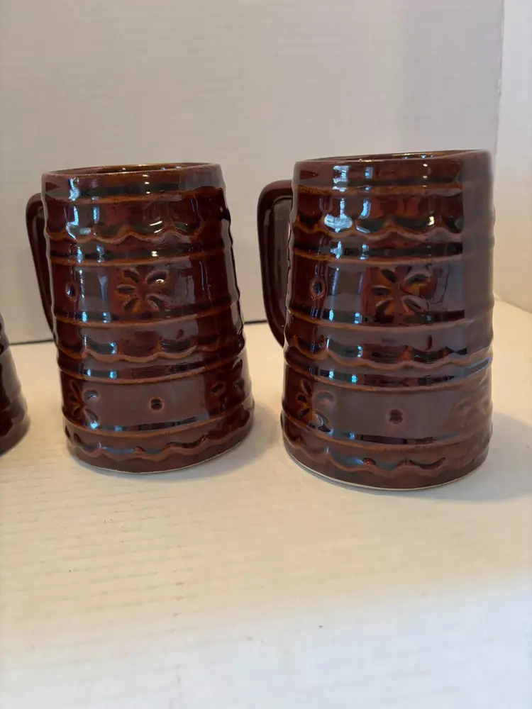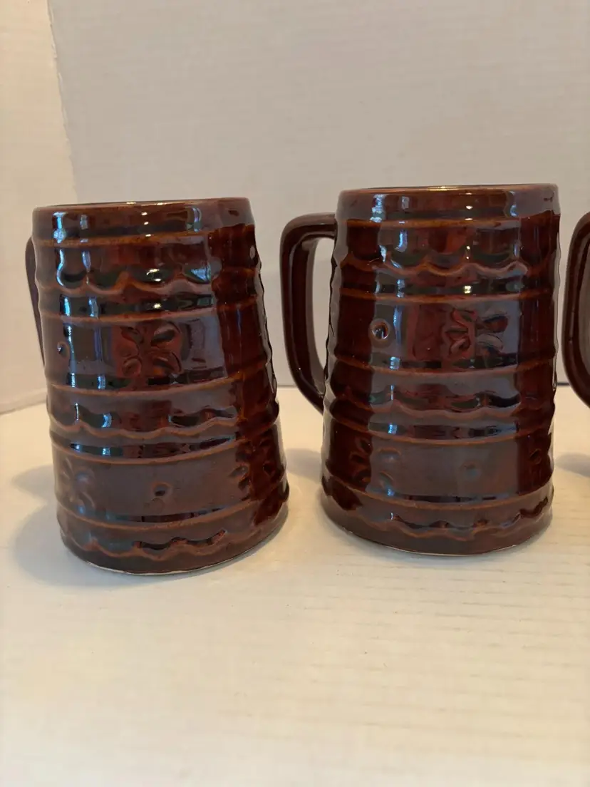 The Vintage MCM Marcrest Set of 4 Daisy & Dot Pattern Mugs in Dark Brown from Colorado, USA, showcases a classic Mid-Century Modern design. The mugs are made of stoneware with an art pottery production style, reflecting a vintage aesthetic. These original mugs feature a charming daisy and dot pattern, adding a touch of retro elegance to any kitchen or dining setting. There is a small flea bite chip in one of the mugs SEE PICTURE FOR DETAIL