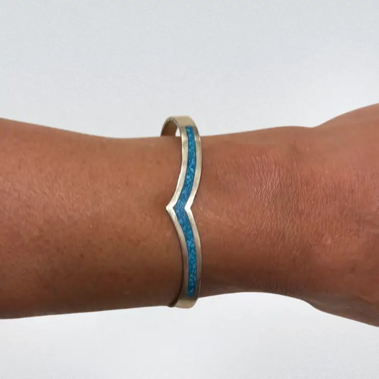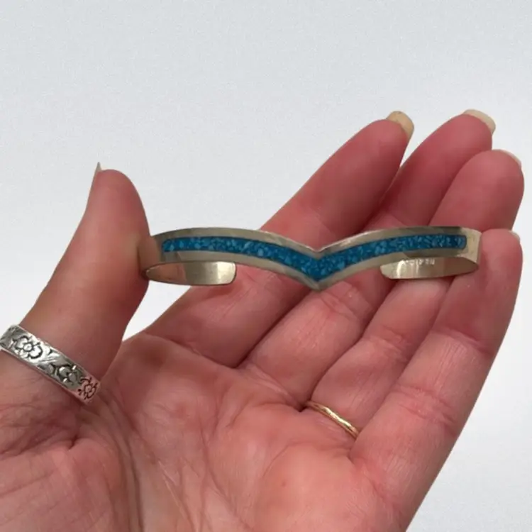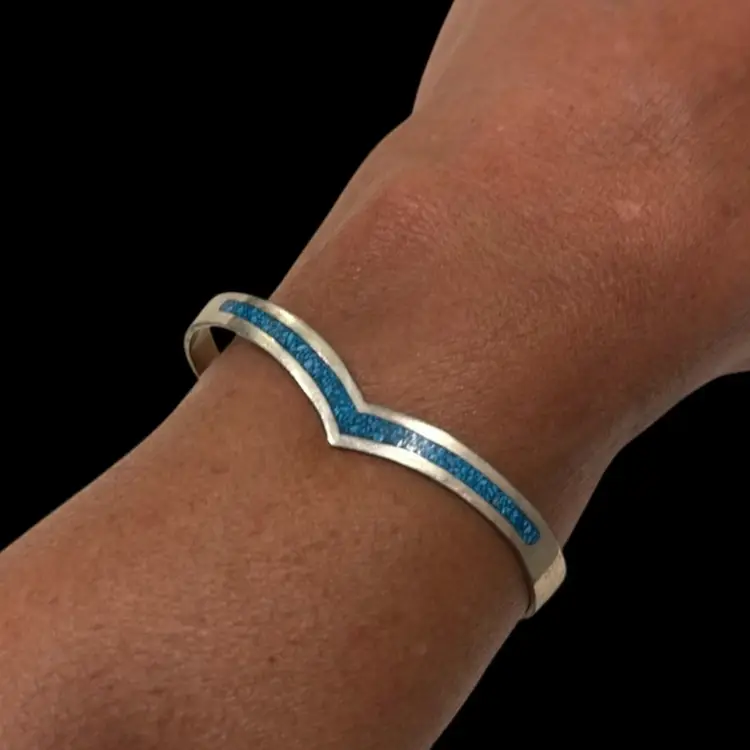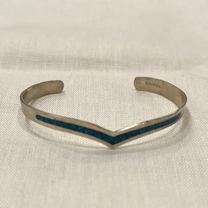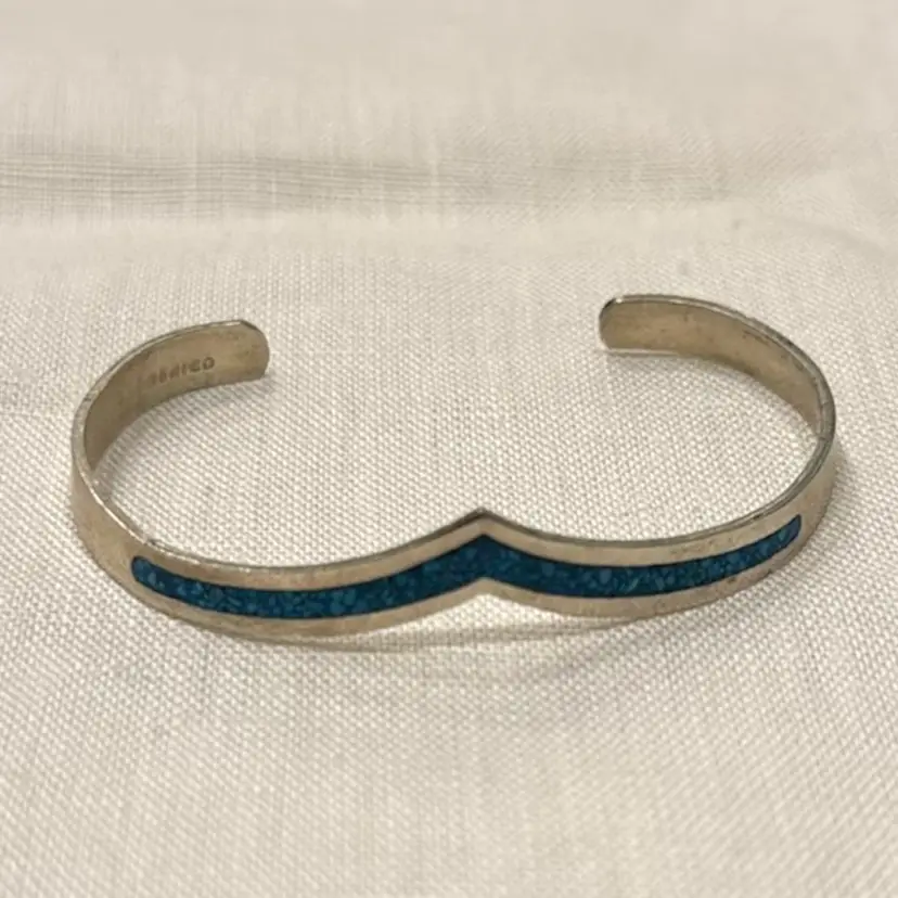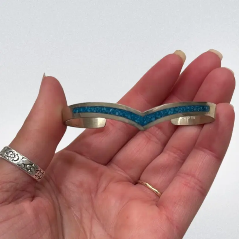 Vintage MCM Mexican Modernist Nickel Silver (SilverTone) Crushed Turquiose Chip Inlay Dainty Arrow Bangle