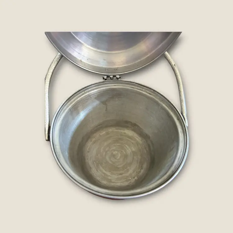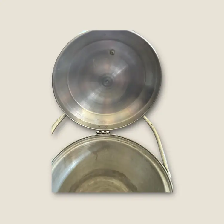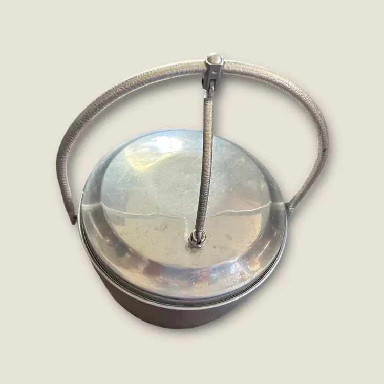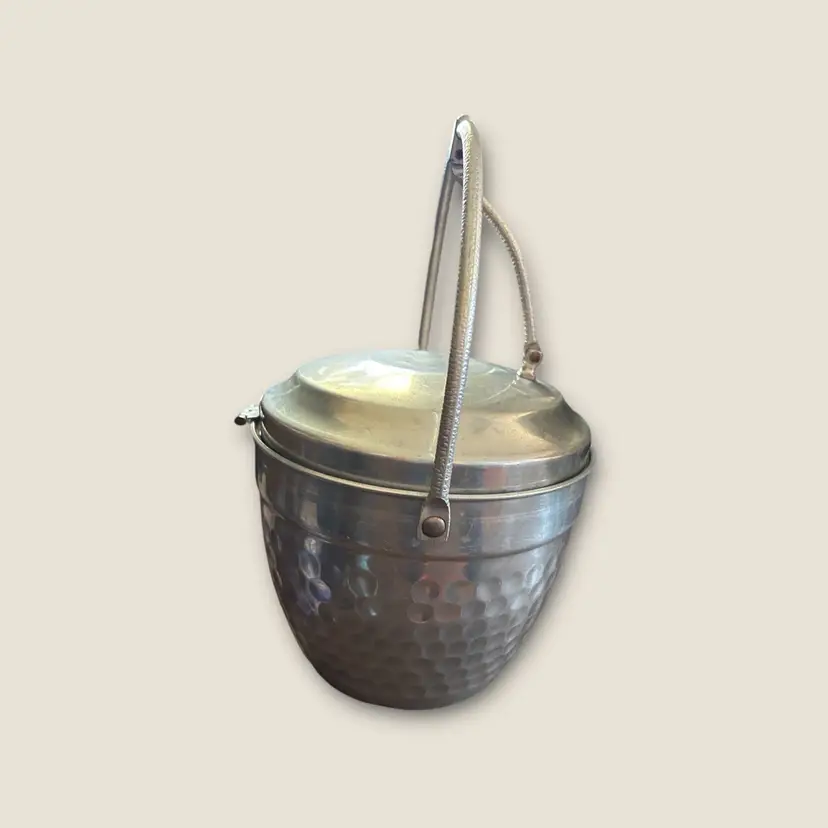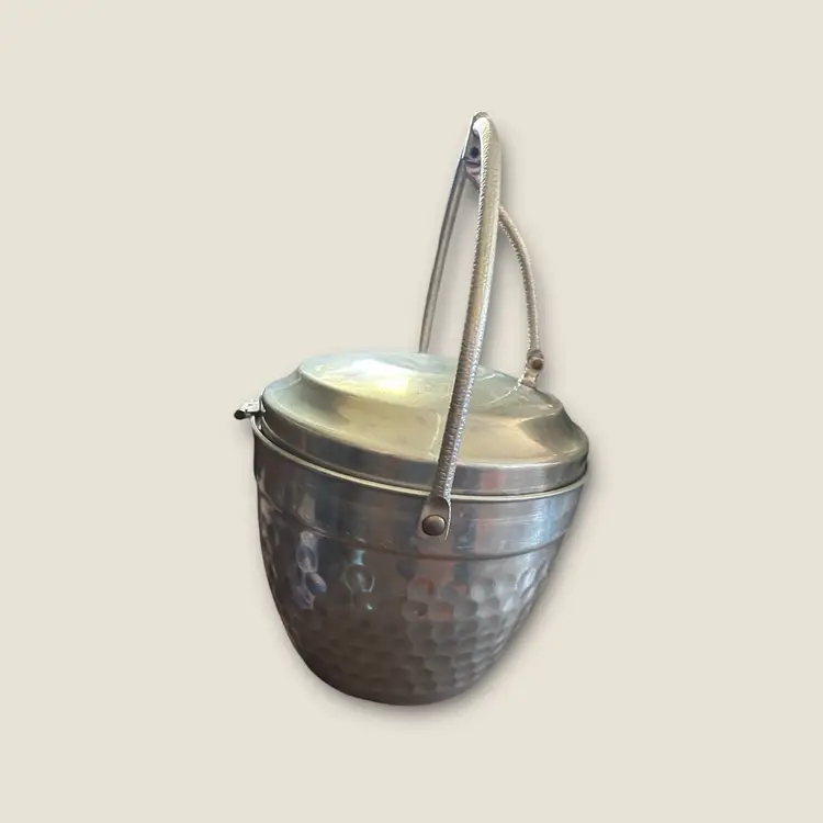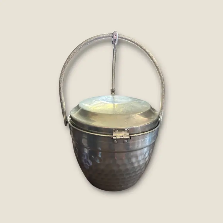 Shows cosmetic wear (see photos). No dents or bends. Could polish up nicely. 13” tall from bottom to handle. Unique feature of attached handle and lid combo. Prevents melting by ensuring lid is always handy to close ice bucket. This item is 60-65 years old! How ❄️COOL❄️ is that?