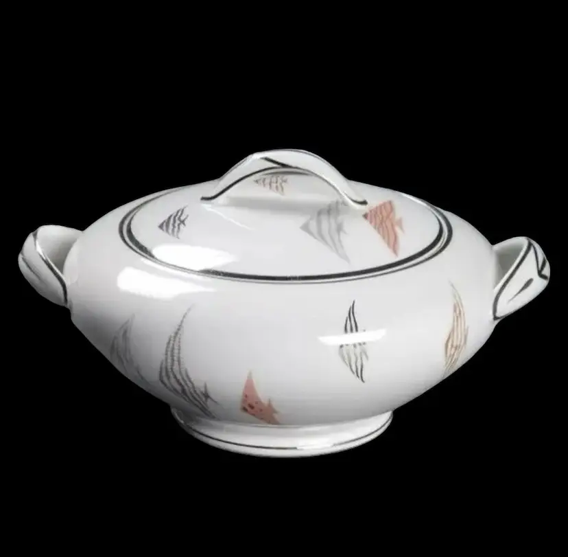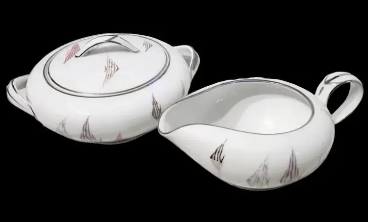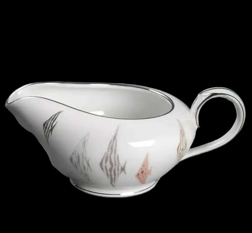 Vintage Noritake Tropica Covered Sugar And Creamer Set Atomic- Style Fish, Platinum Trim. Set includes sugar bowl, lid, creamer.