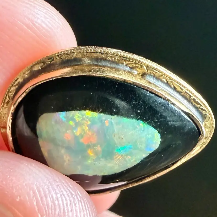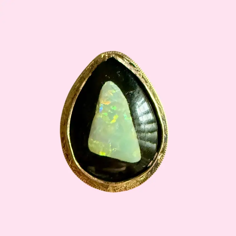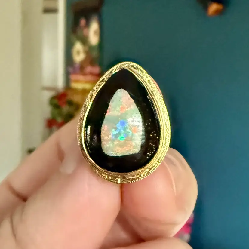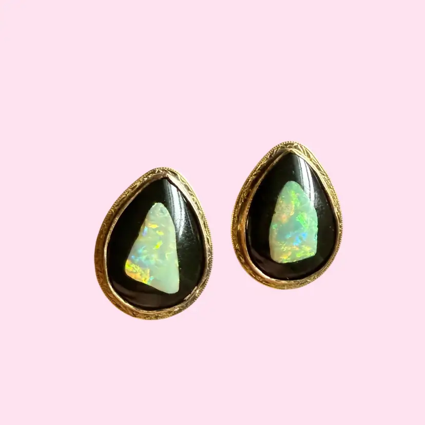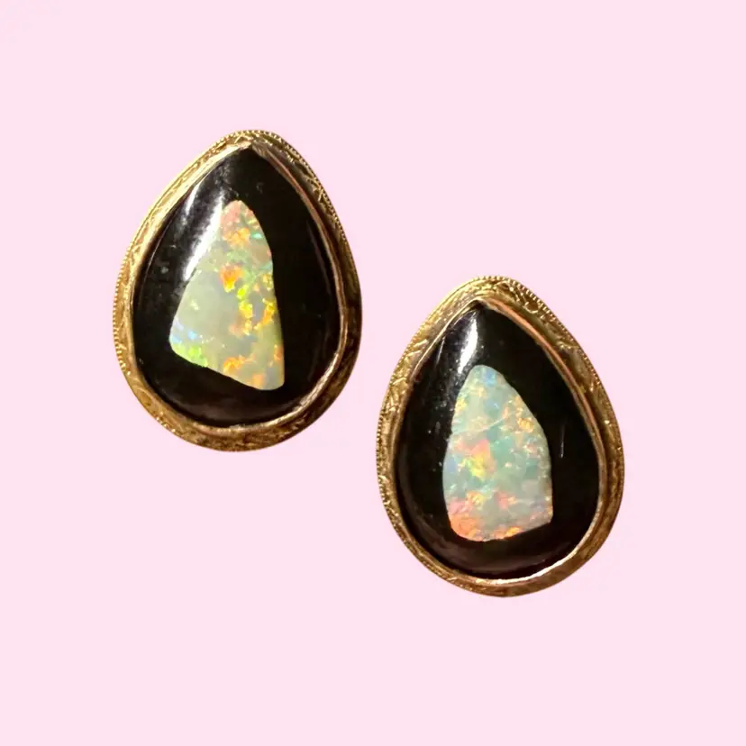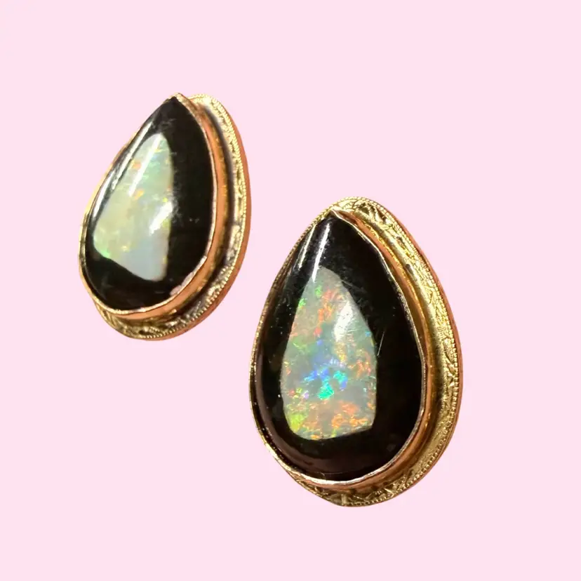 Beautiful vintage teardrop earrings featuring vibrant opal triplets with strong flashes of green, blue, and orange fire. The opals are set against a black backing with a domed clear top, enhancing depth and color.