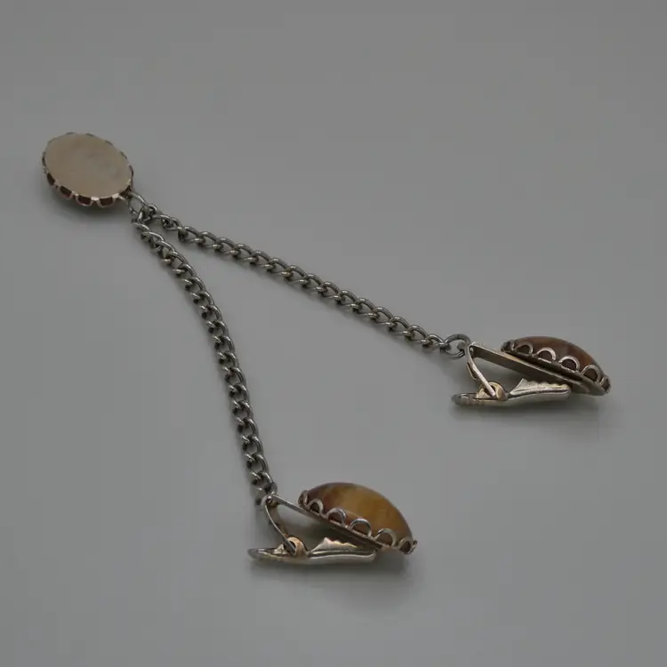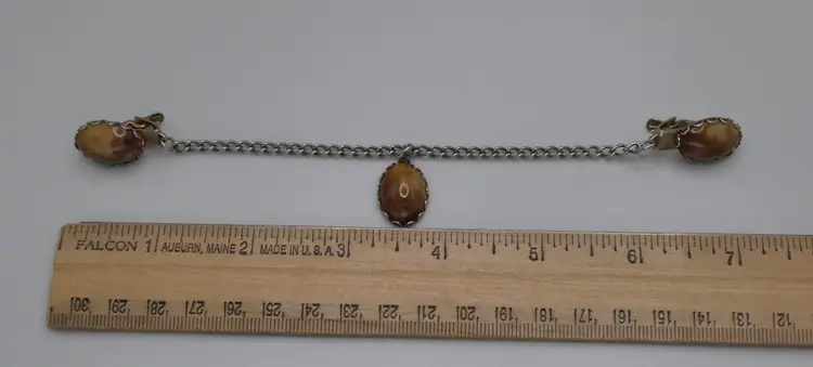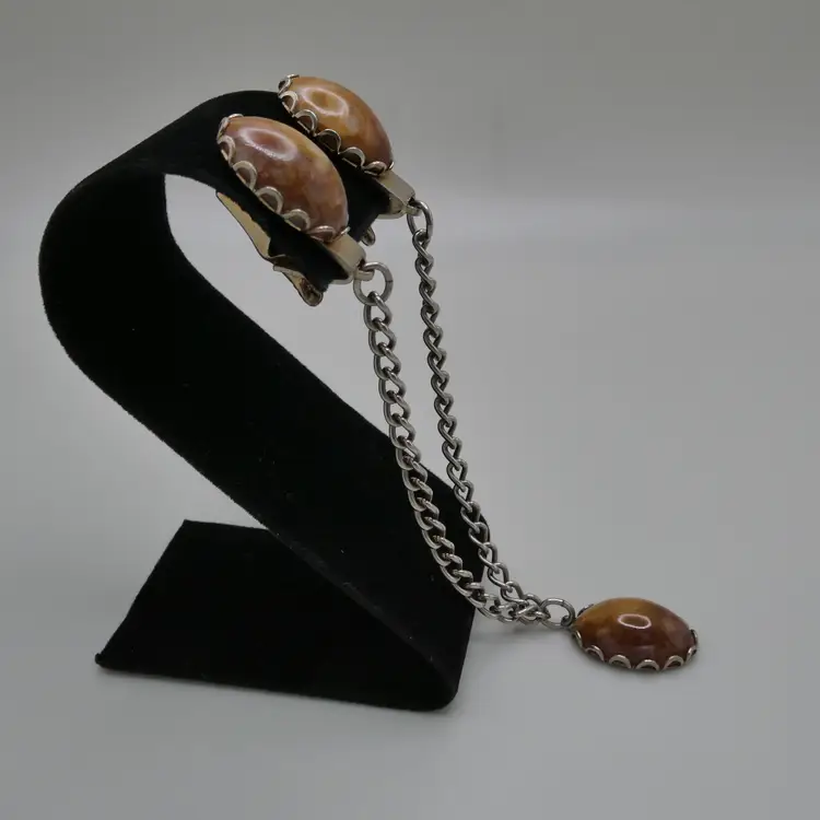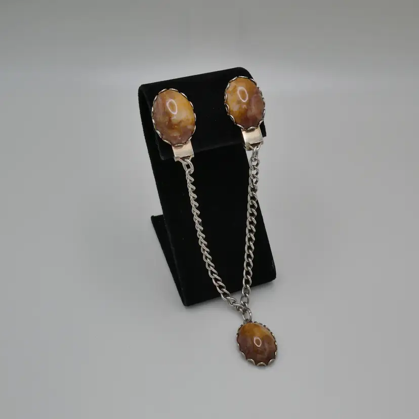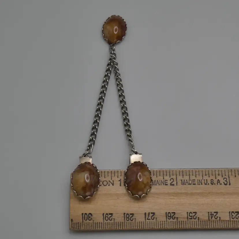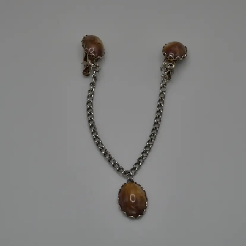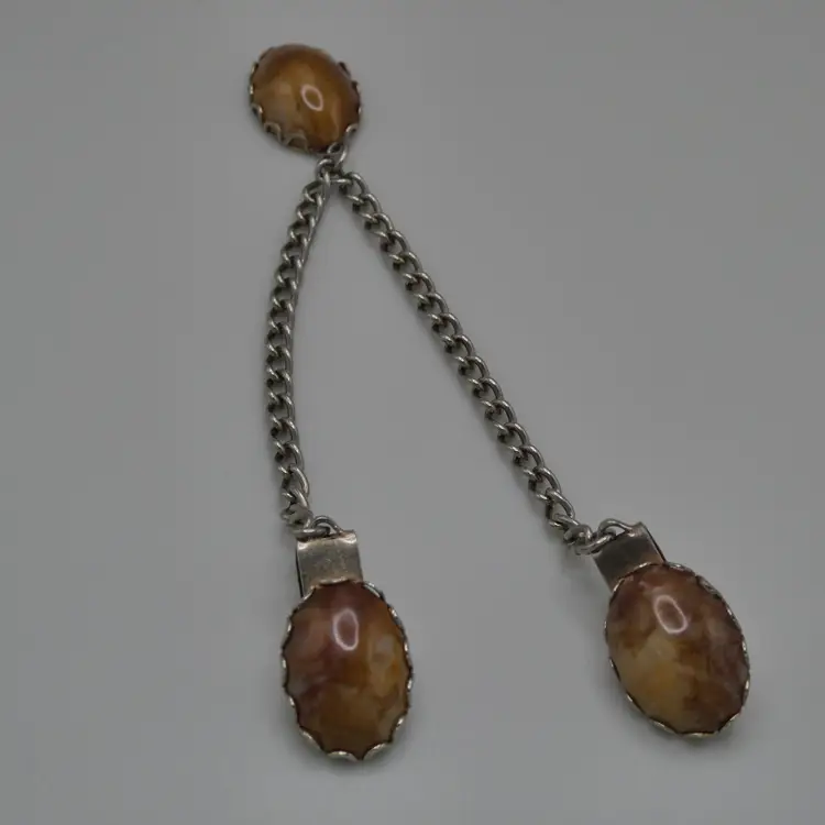 Featuring three natural mottled brown jasper gemstone cabochons Two oval stones on the clips and one oval stone dangles Silver toned metal with a 3mm curb chain Open scalloped edging around the cab stones Square alligator guard clips hold securely (one clip is a little wonky) Unmarked designer piece Chain itself measures about 5" long x 3mm wide Sweater clips measure overall about 7-1/4" long tip to tip Cabochons themselves measure about 18mm long x 13mm wide x 6mm deep Weigh about 14.0 grams