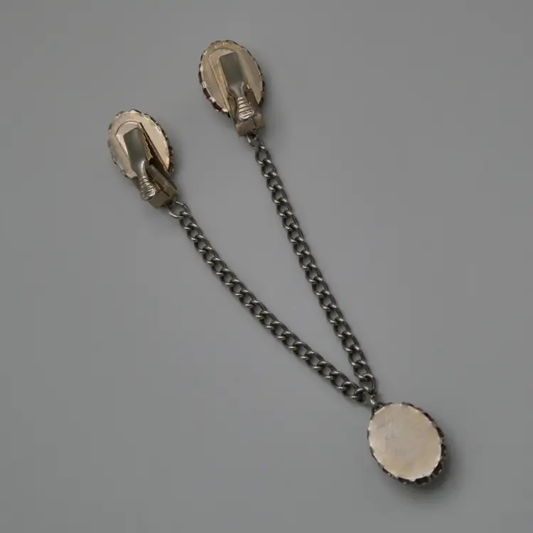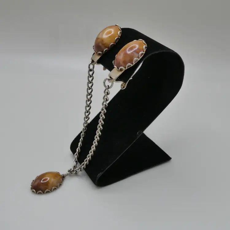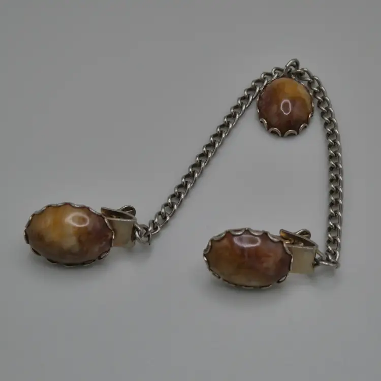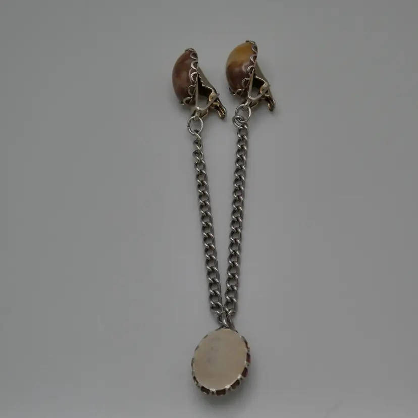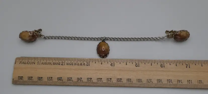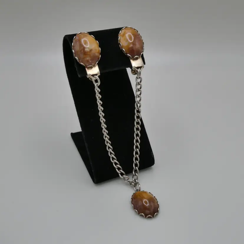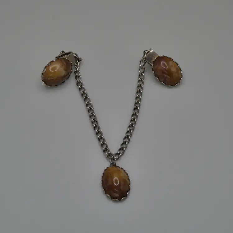 Featuring three natural mottled brown jasper gemstone cabochons Two oval stones on the clips and one oval stone dangles Silver toned metal with a 3mm curb chain Open scalloped edging around the cab stones Square alligator guard clips hold securely (one clip is a little wonky) Unmarked designer piece Chain itself measures about 5" long x 3mm wide Sweater clips measure overall about 7-1/4" long tip to tip Cabochons themselves measure about 18mm long x 13mm wide x 6mm deep Weigh about 14.0 grams