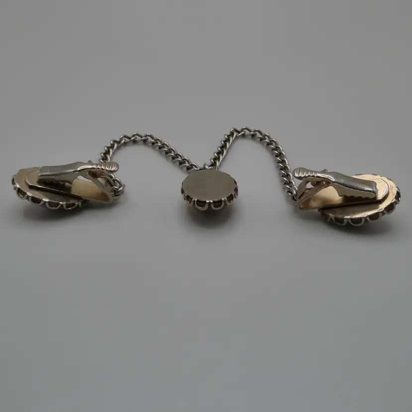Overall, good to very good vintage condition with signs of age/use/wear to include mild surface scratches/scuffs and one clip is a little wonky but holds securely. Metal is in original unpolished condition with patina/tarnish.