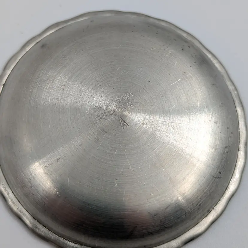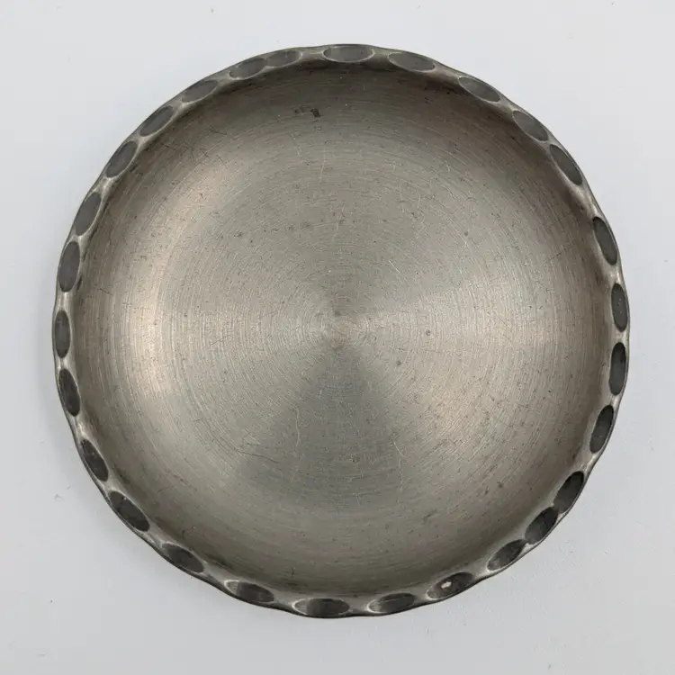 Charming set of vintage pewter coasters or trinket dishes featuring MCM scalloped edges. Perfect for adding a touch of classic style to your drinkware collection or dresser. Has some patina (see photos)