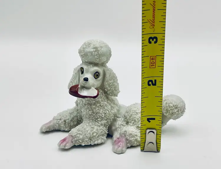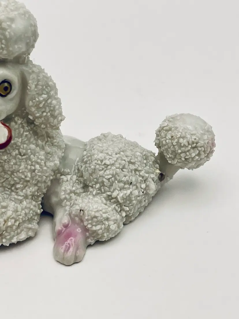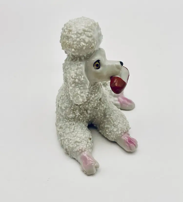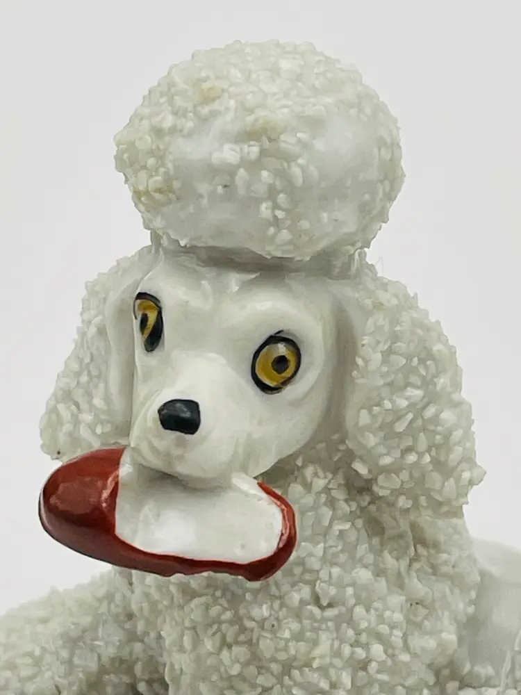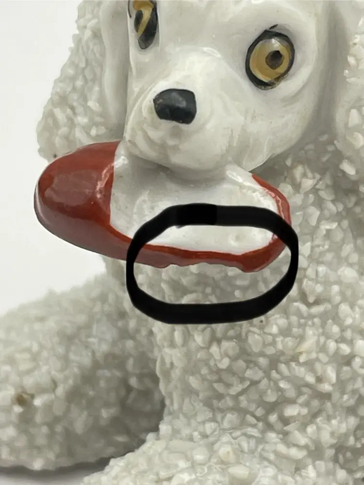 Vintage, MCM, Porcelain, Sugar/Spaghetti French Poodle, White/Pink, Holding Shoe (Shoe jagged, circled in last picture)