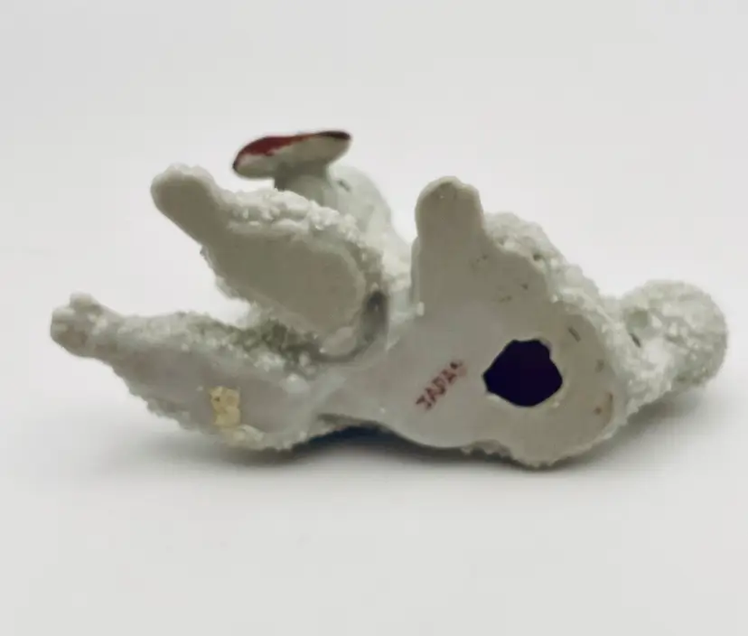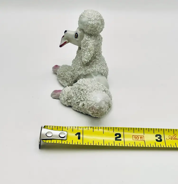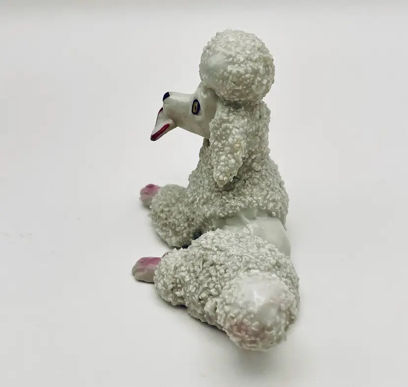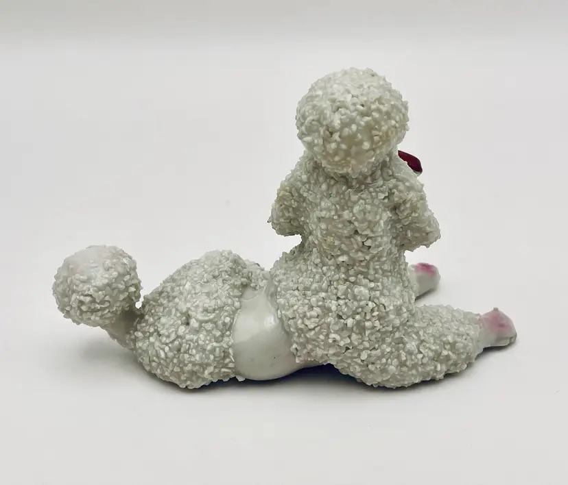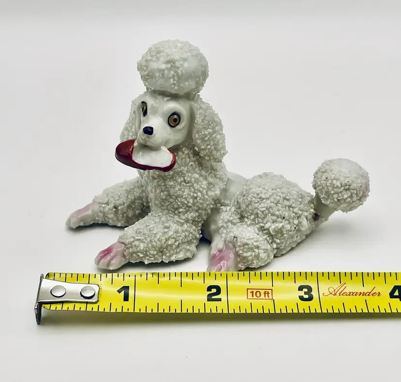 Vintage, MCM, Porcelain, Sugar/Spaghetti French Poodle, White/Pink, Holding Shoe (Shoe jagged, circled in last picture)