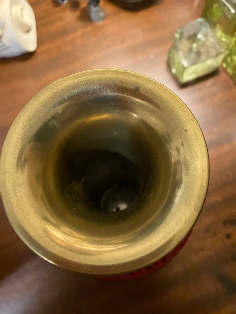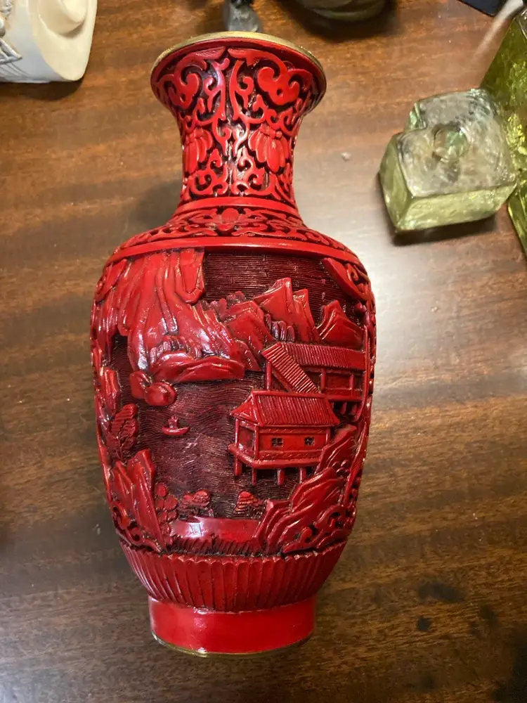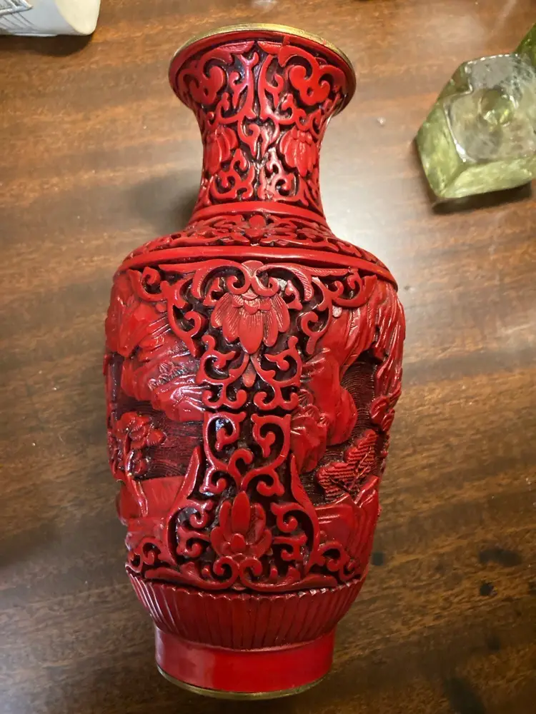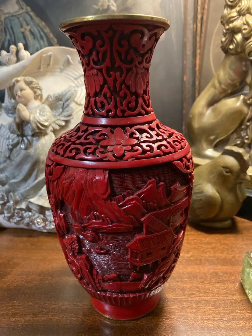 Vintage MCM Red Carved Lacquered Vase - Brought Back From Singapore - Asian - Chinese - RARE - HTF Art