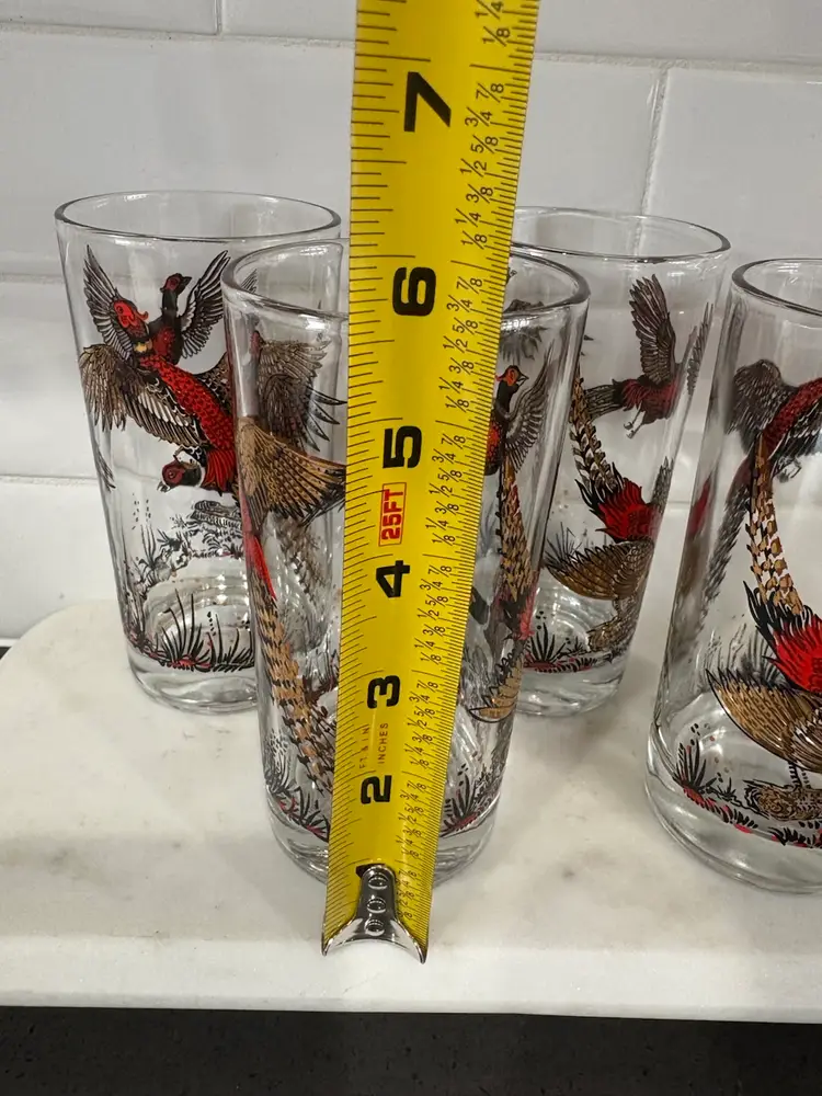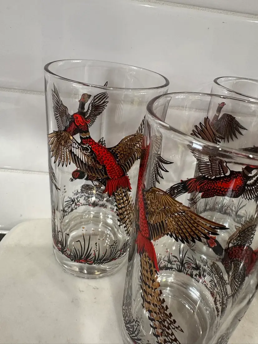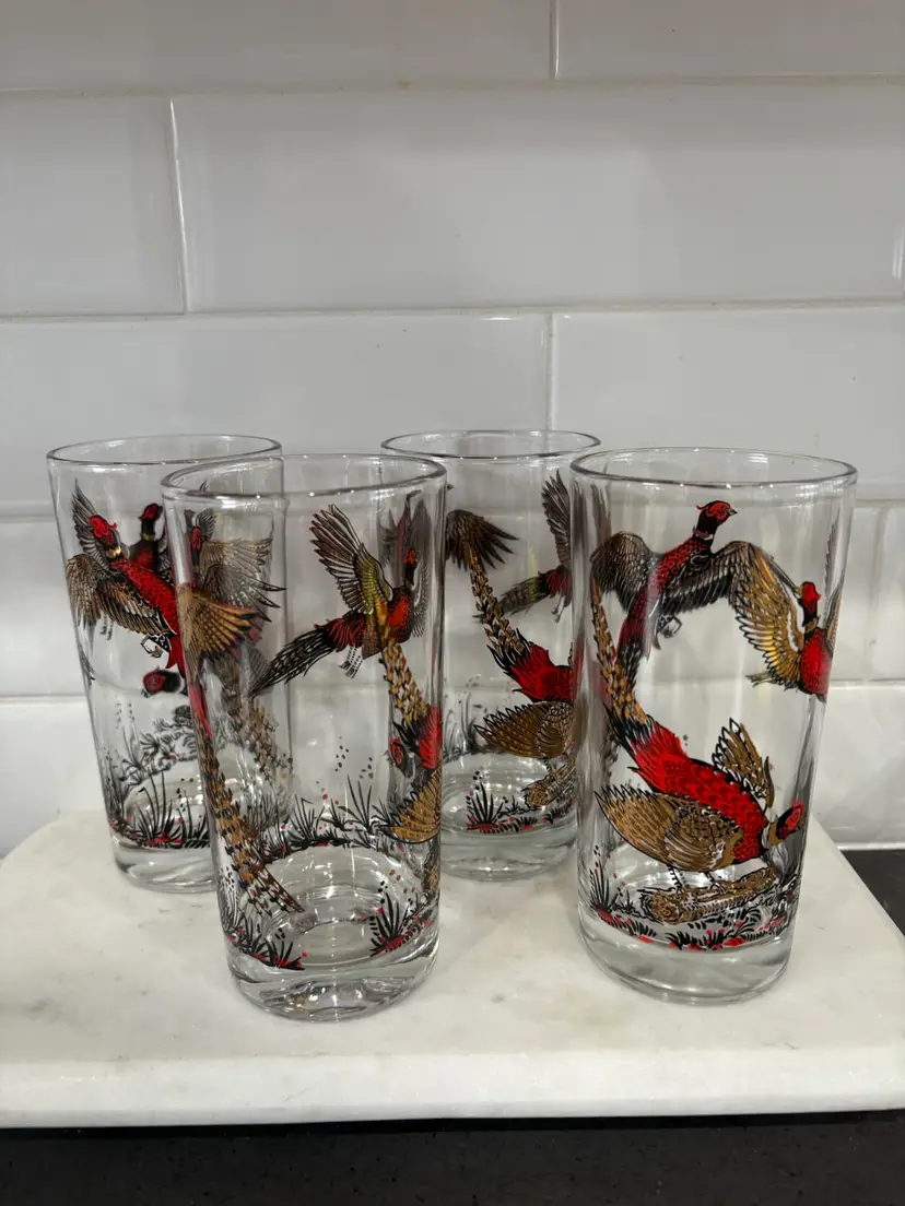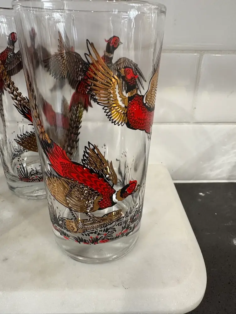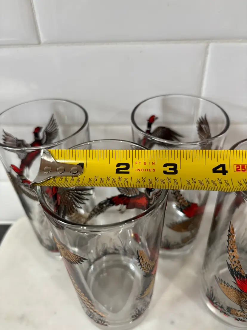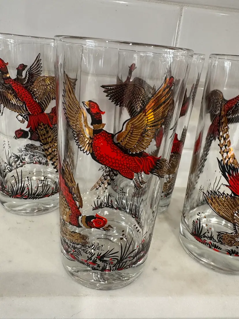 Vintage MCM Red Gold Ringneck Pheasant Tall Barware Glasses Set Of 4