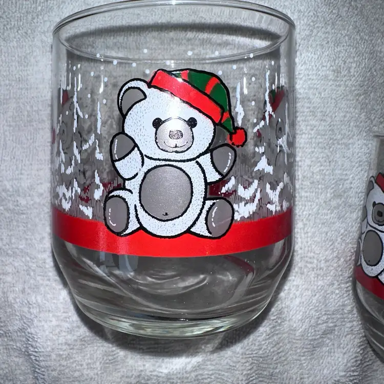 Vintage MCM Retro Libbey Christmas Teddy Bears Low Ball Drinking Glasses Set 4. Excellent Vintage Condition Free Of Chips Or Cracks. Paint is in very good condition. Smoke Free Home. #vintagechristmas #libbeyglass #lowballglasses #drinkingglasses #mcm #retro