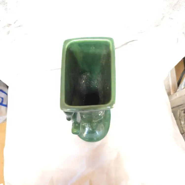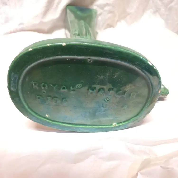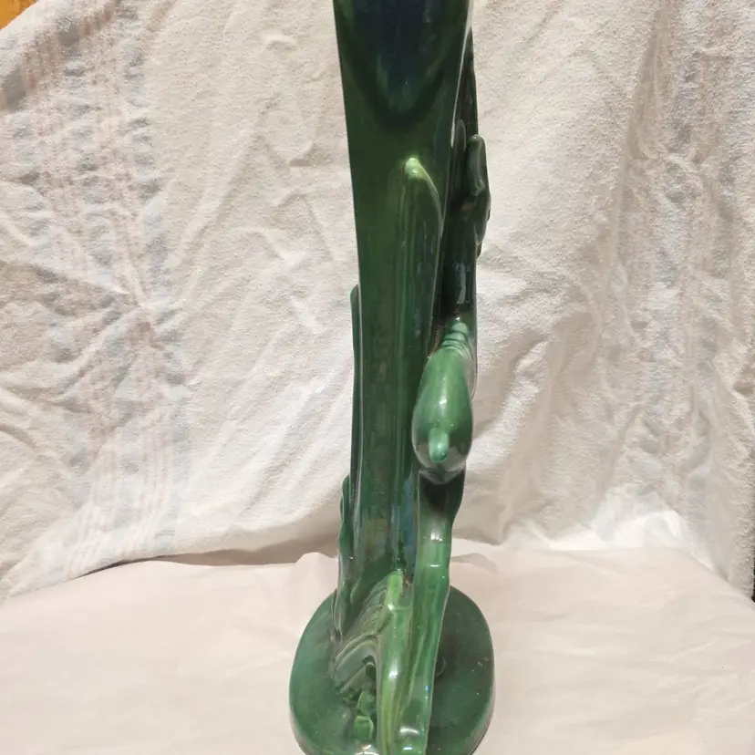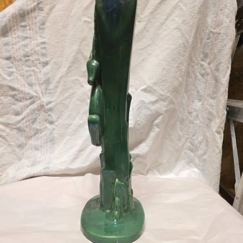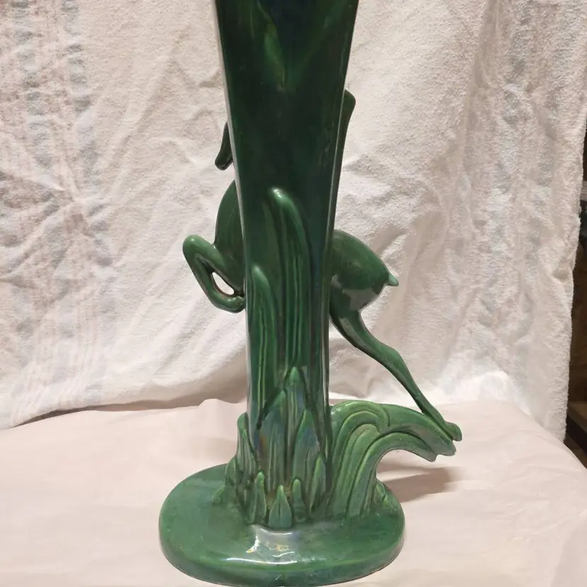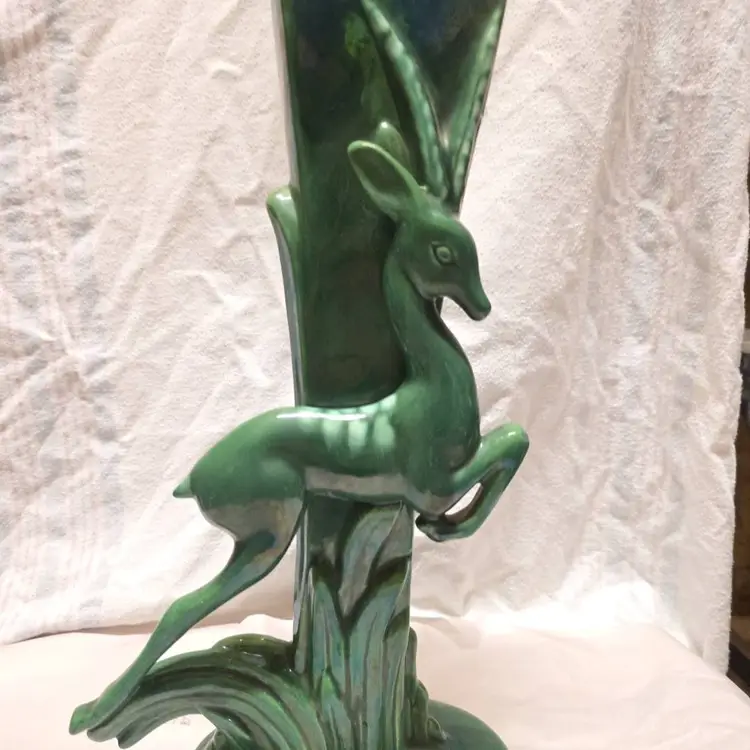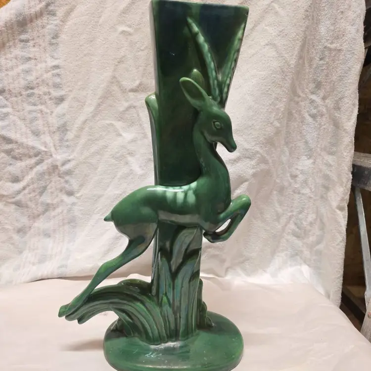The Vintage Mid Century Modern Royal Haeger Green Blue Oryx Gazelle Vase is a stunning piece of art pottery from the mid-20th century. Standing at 15 inches tall, this original production style vase features a leaping gazelle pattern in a vibrant green color. Crafted from clay and ceramic, this glossy finish vase captures the essence of the Mid-Century Modern era with its 3D effect and decorative appeal. Signed by Royal Haeger, this vintage piece is a unique addition to any art pottery collection, reflecting the creativity and craftsmanship of that time period.