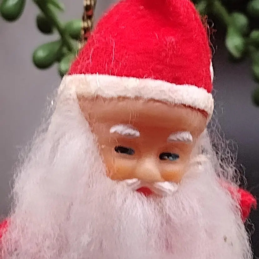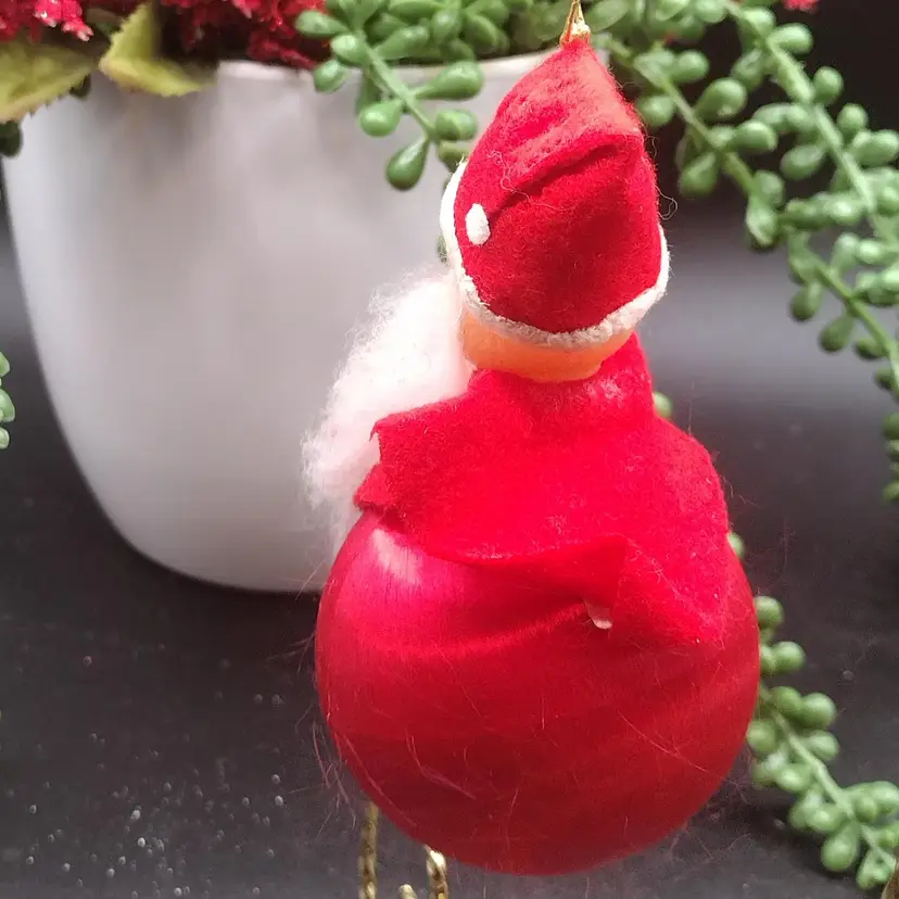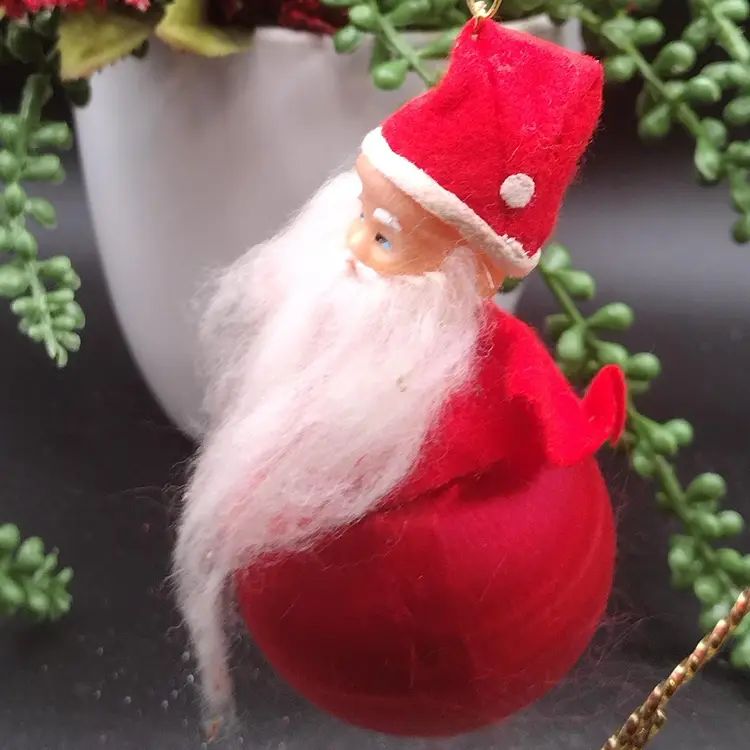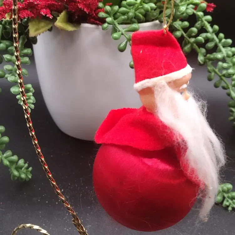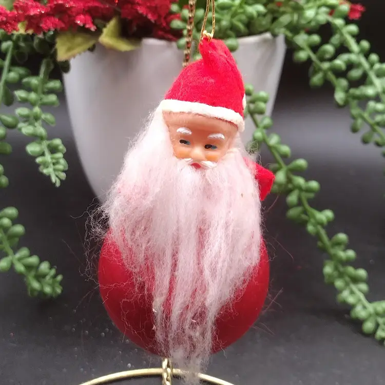 This unique vintage MCM ornament features a red satin ball with a soft rubber face and a beard. Made in Japan in the 1960s, this rare piece is perfect for any Christmas tree or holiday display. Measuring at 4 inches in height, it is a great addition to any collector's collection. The ornament is in great shape and has a charming vintage aesthetic. The piece is perfect for those who appreciate mid-century modern style and Christmas theme. The set includes one ornament with a Santa character, making it a great gift for any collector or holiday enthusiast. Add this one-of-a-kind piece to your collection today!