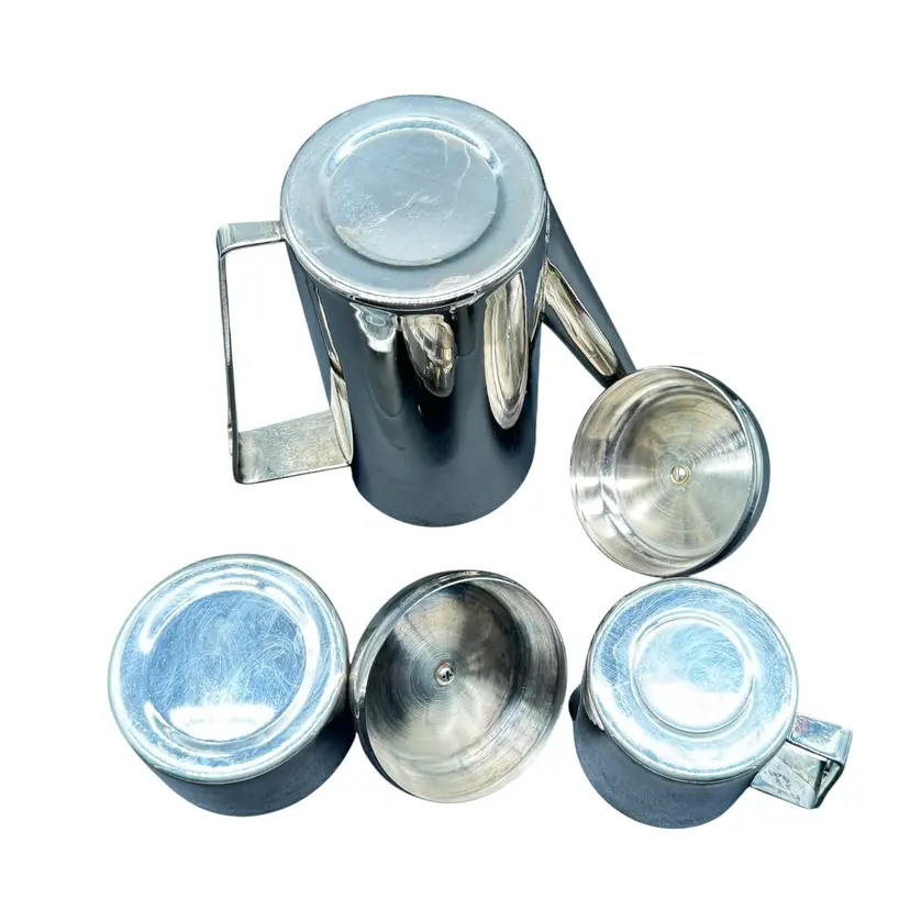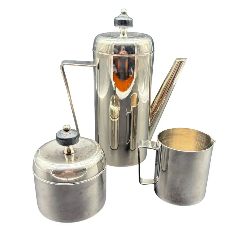 • Includes coffee/tea pot, creamer, and sugar container with lids • Durable stainless steel construction • Sleek mid-century modern design • Easy-grip handles • Ideal for entertaining or everyday use Coffee Pot is 8" Tall