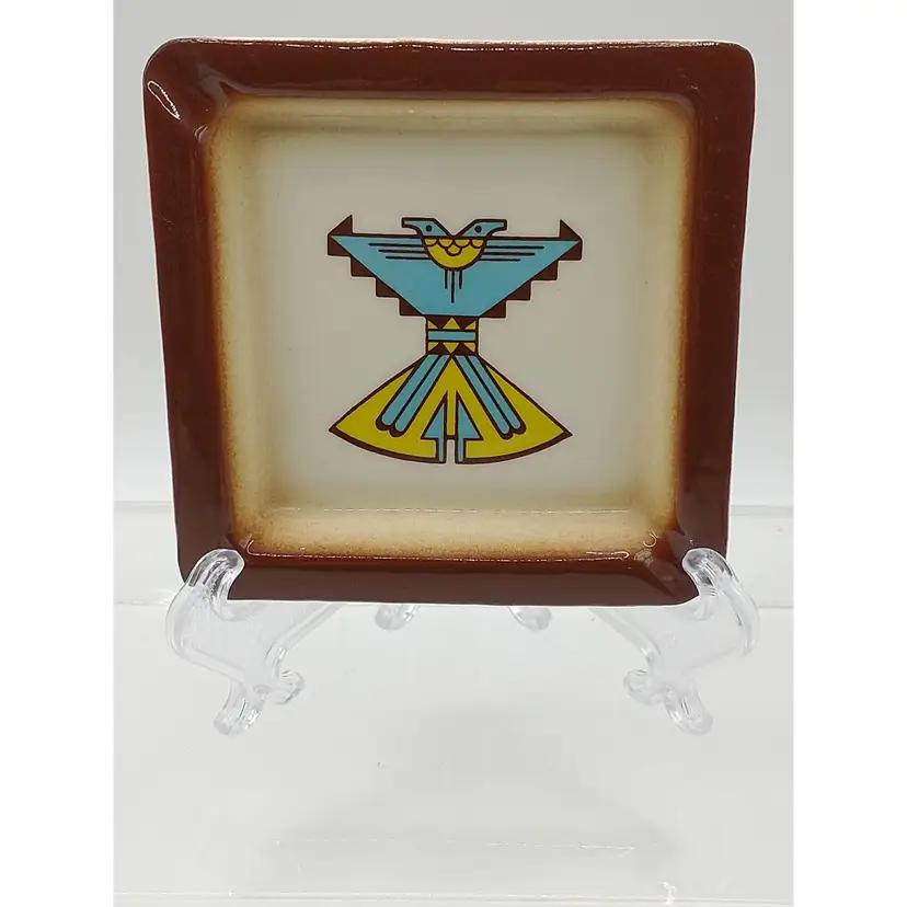 This is a vintage mid-century modern Sims California Pottery Ashtray. It features a Thunderbird in Turquoise and Yello and is trimmed in brown. It is 4X4" and there are no chips or cracks. This piece can be used as an ashtray or trinket dish and the colors are very vibrant.