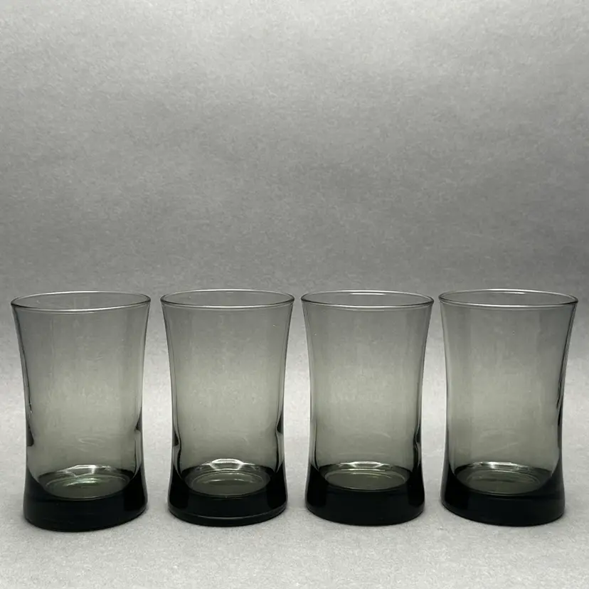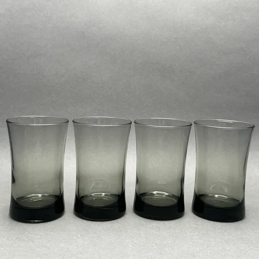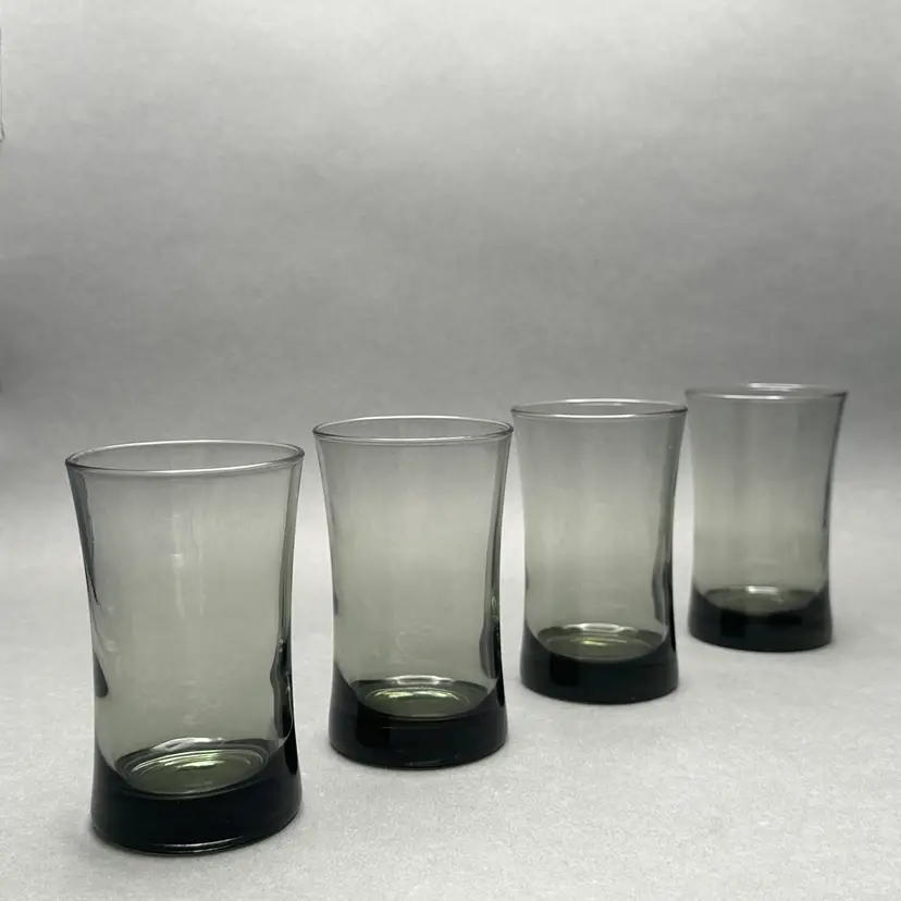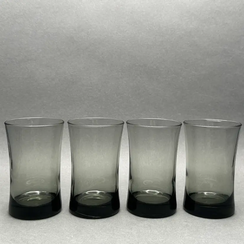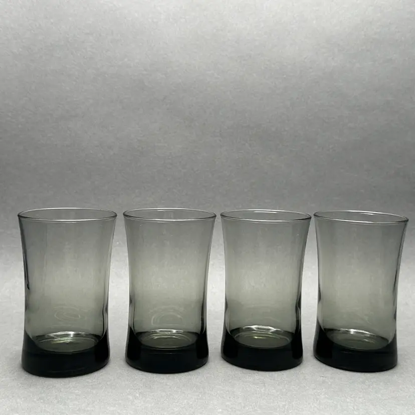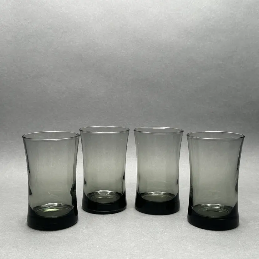 Vintage set of 4 MCM smoke gray juice glasses. They have a minimalist form with a slight flare leading up to the top rim.