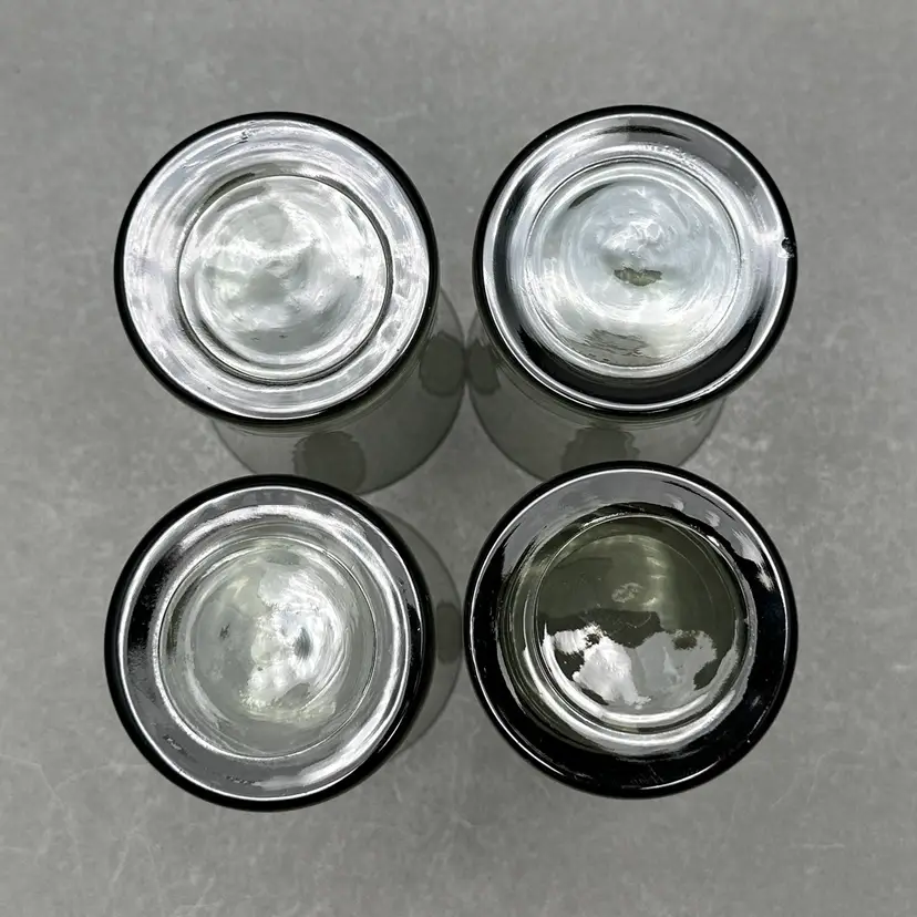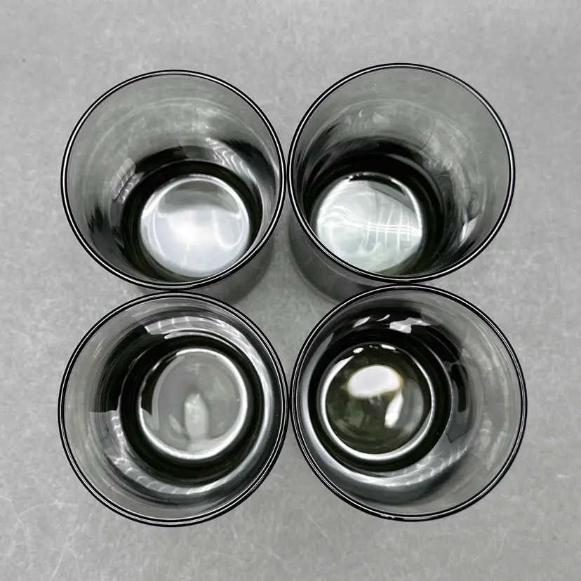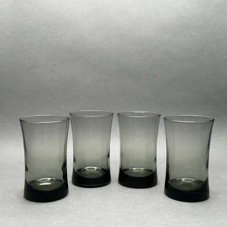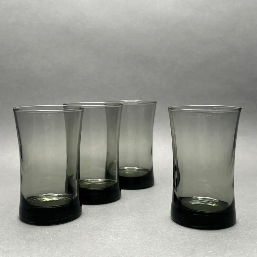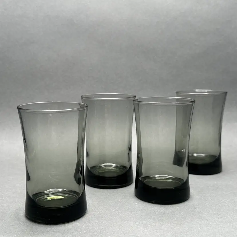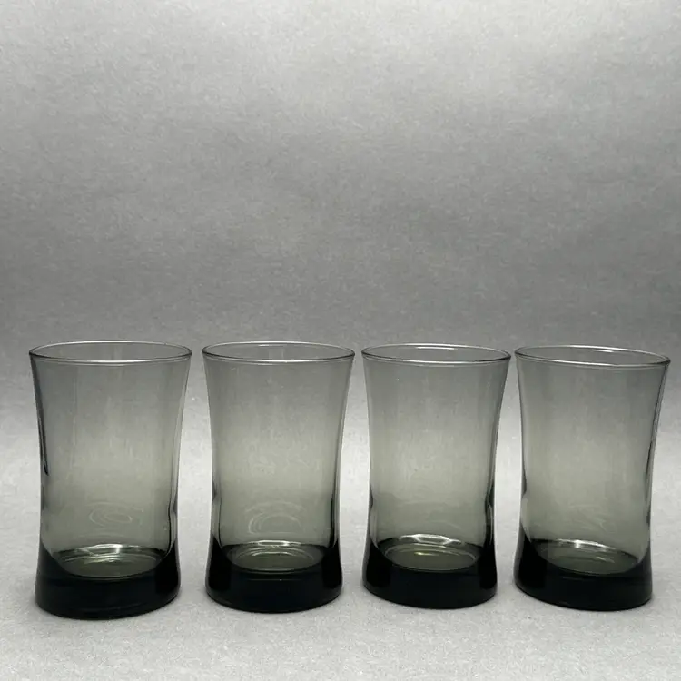 Vintage set of 4 MCM smoke gray juice glasses. They have a minimalist form with a slight flare leading up to the top rim.