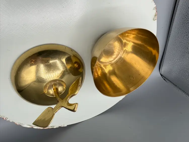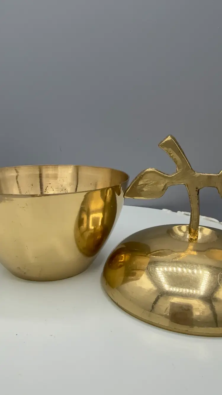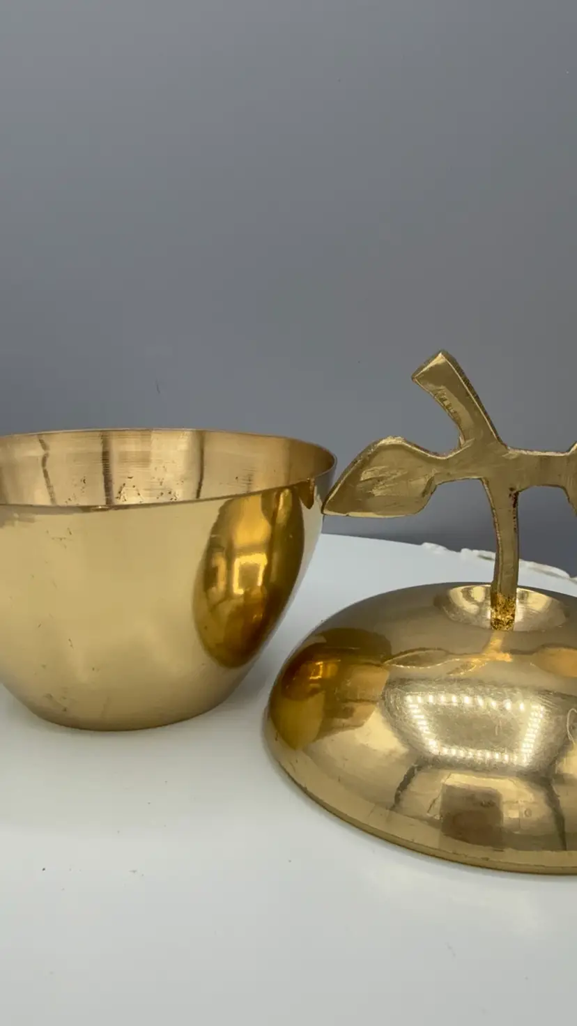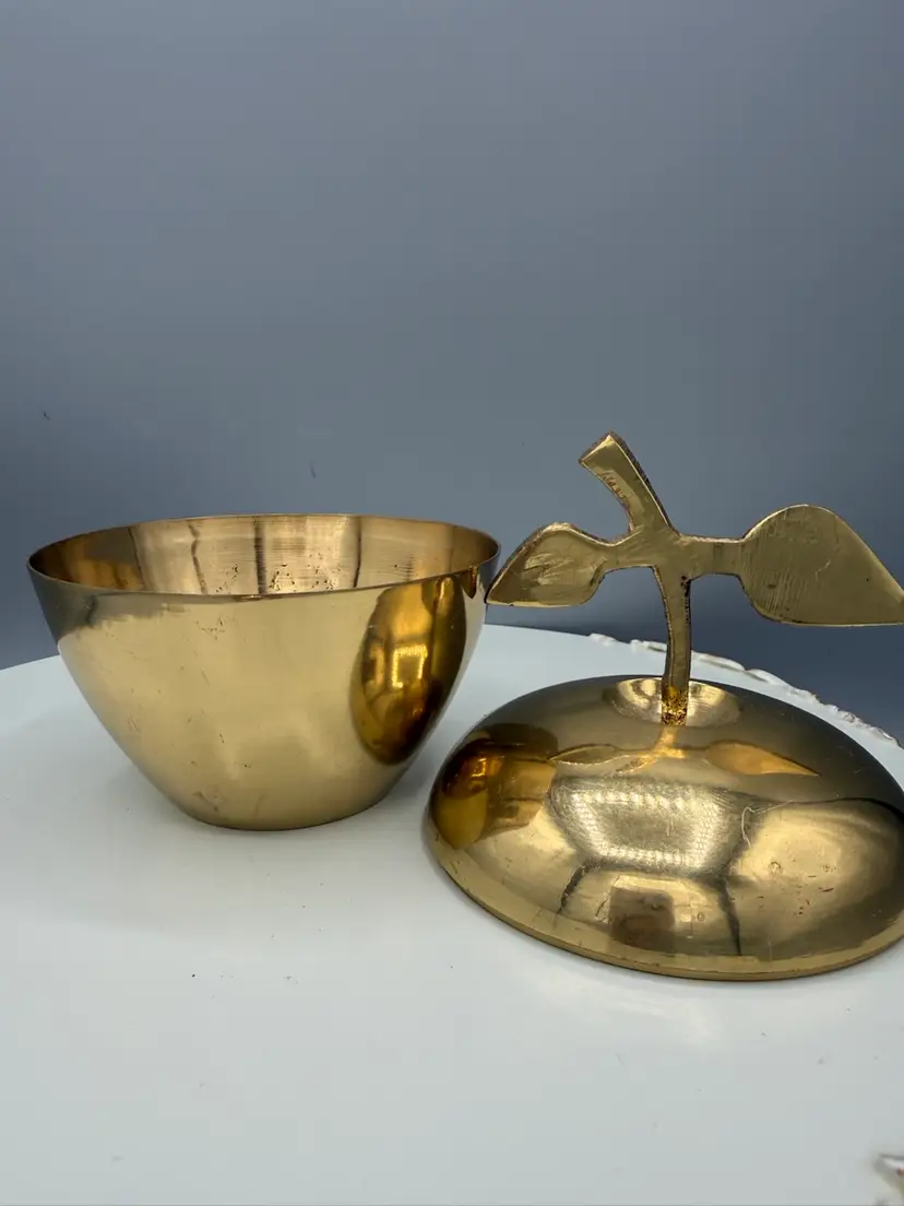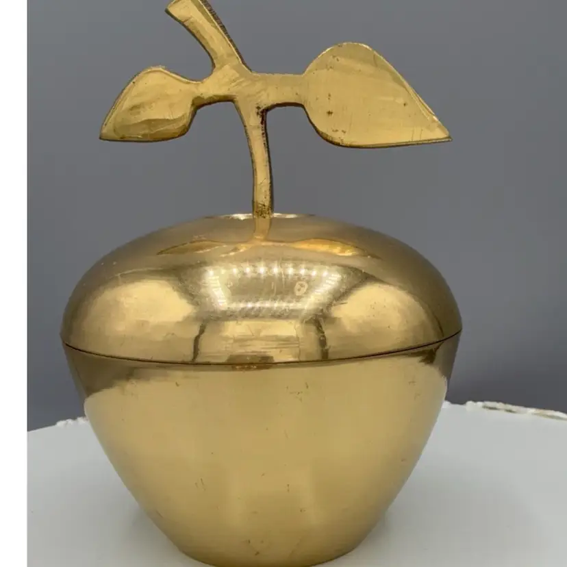 Charming, apple-shaped container features a removable lid topped with a sculpted stem and two leaves. A perfect small container for jewelry, rings, coins, keys, or office supplies. Decorative Accent: It adds a warm, metallic glow and a touch of vintage elegance to a desk, bookshelf, vanity, or coffee table. Candy Dish: It can be used as a unique and stylish dish for holding small candies.