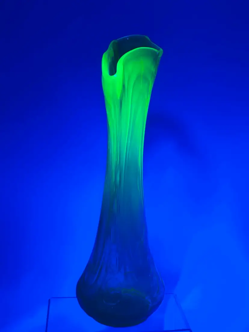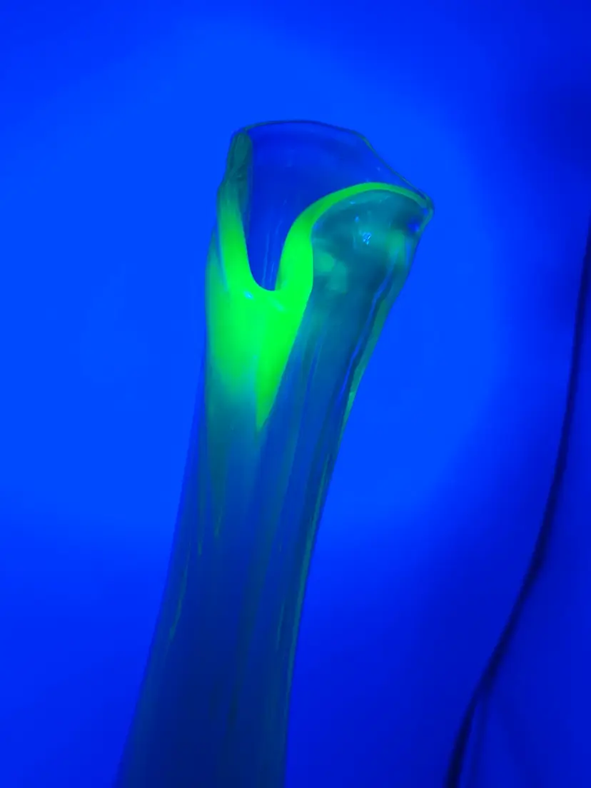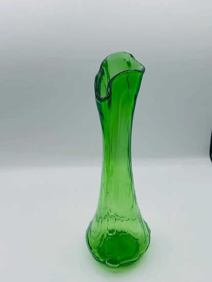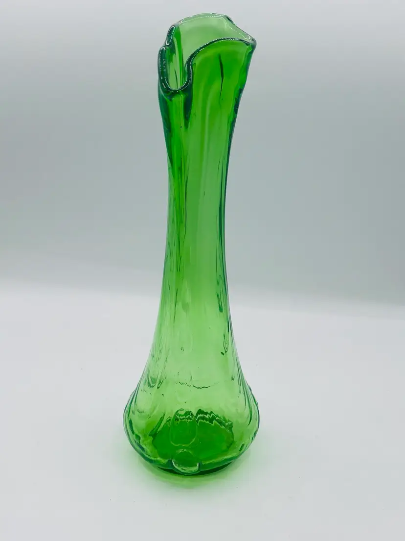 This is a vase is something I’ve never seen before. It’s got an amazing dimples on the side in person. They’re pulled all the way up to the tip of the vase unmarked unknown who makes it but it’s amazing. Stands 11 inches tall widest part of base is 4 inches wide..