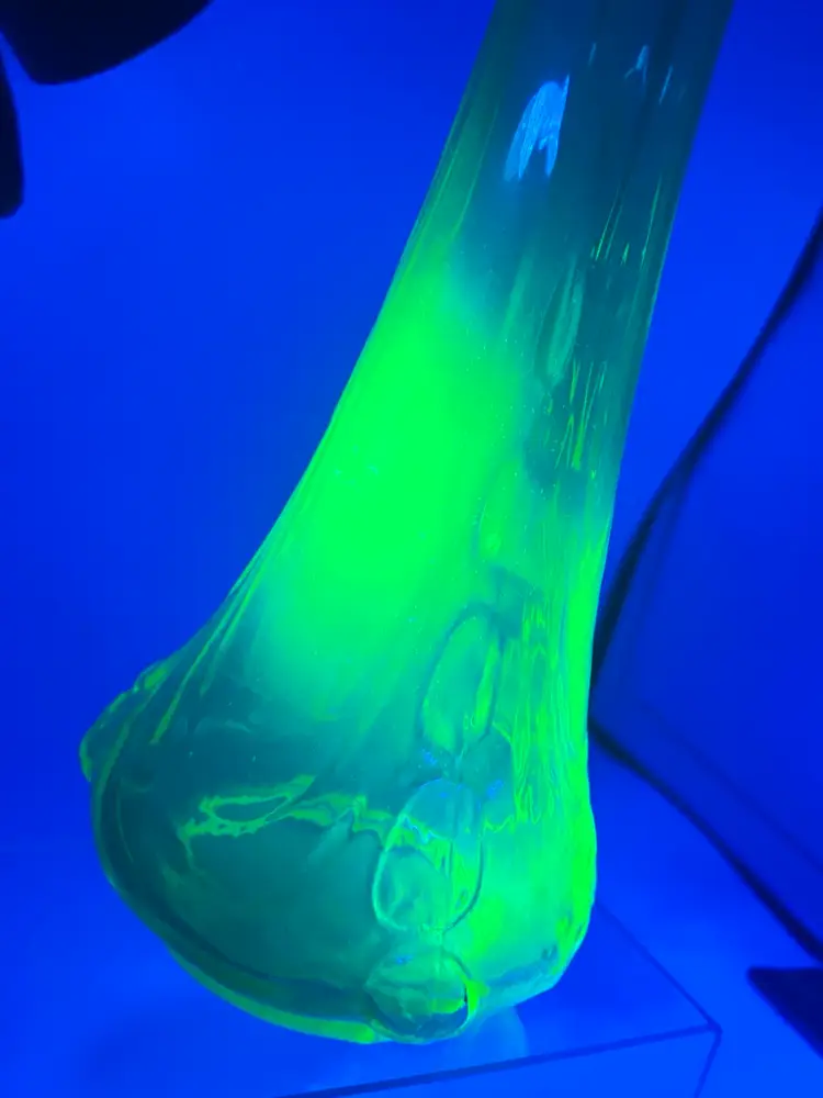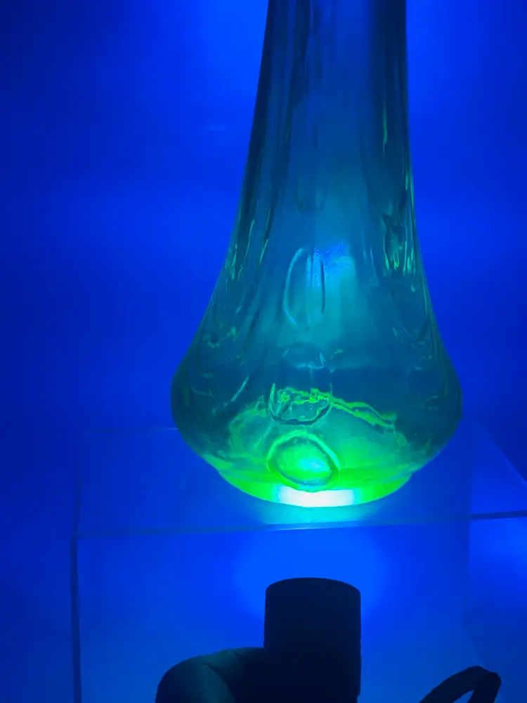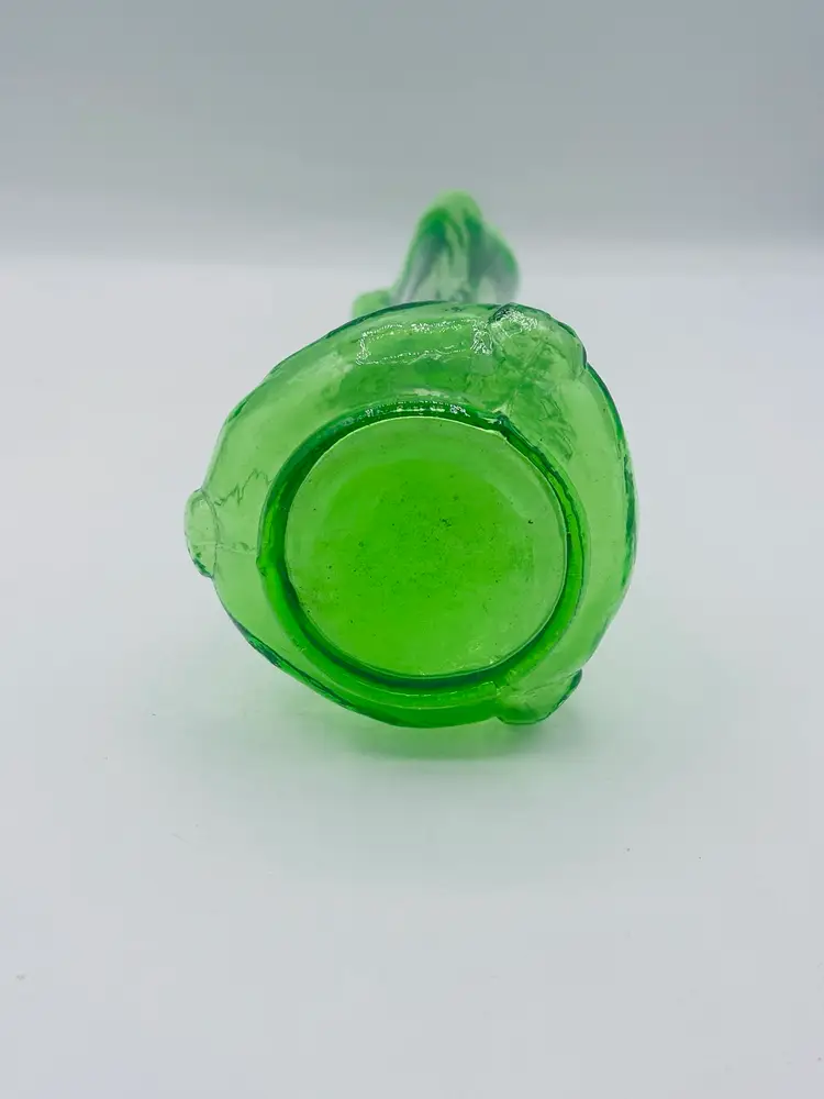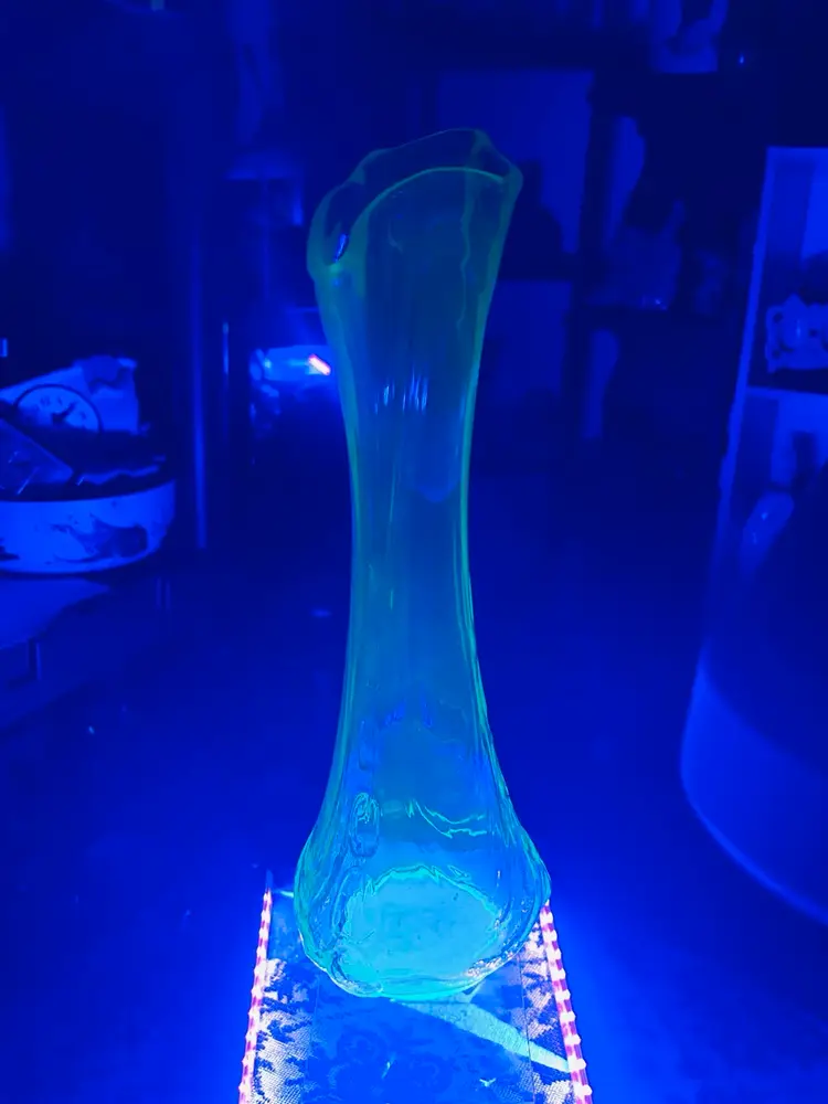 This is a vase is something I’ve never seen before. It’s got an amazing dimples on the side in person. They’re pulled all the way up to the tip of the vase unmarked unknown who makes it but it’s amazing. Stands 11 inches tall widest part of base is 4 inches wide..