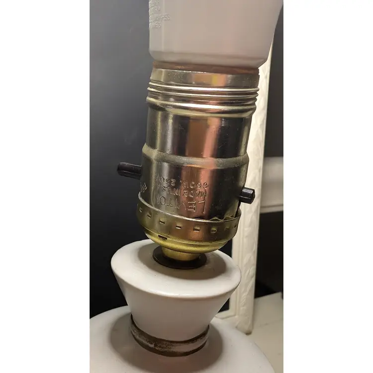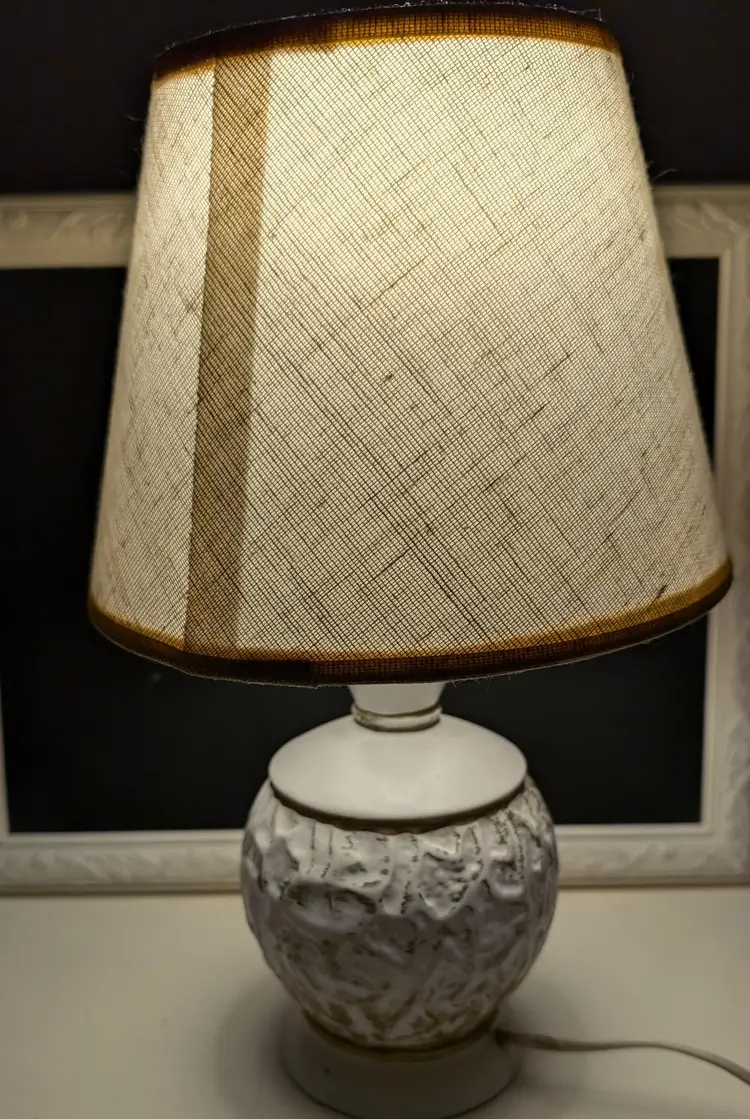 Charming vintage Leviton table lamp with a textured ceramic base and a classic fabric shade. This piece is in Excellent working condition, perfect for adding a touch of retro style to any room. The lamp stands approximately 14 inches tall with lamp shade on with a approximately 4 inches width for lamp and 8 inches width on the shade and is ideal for a cozy reading nook or bedside table. Light bulb NOT INCLUDED