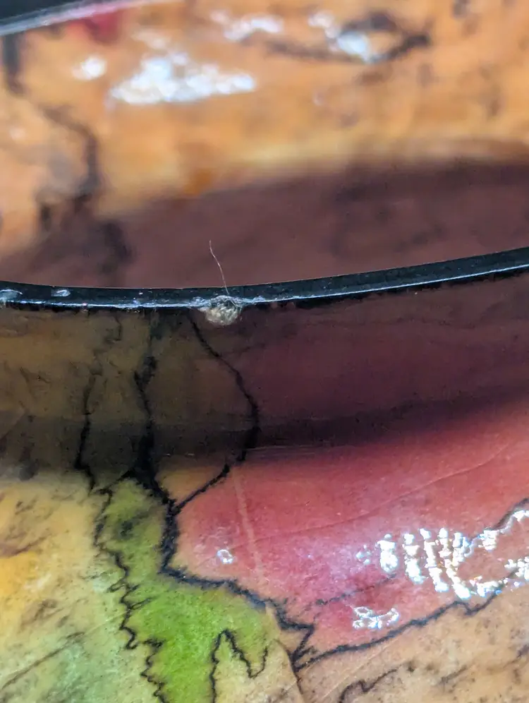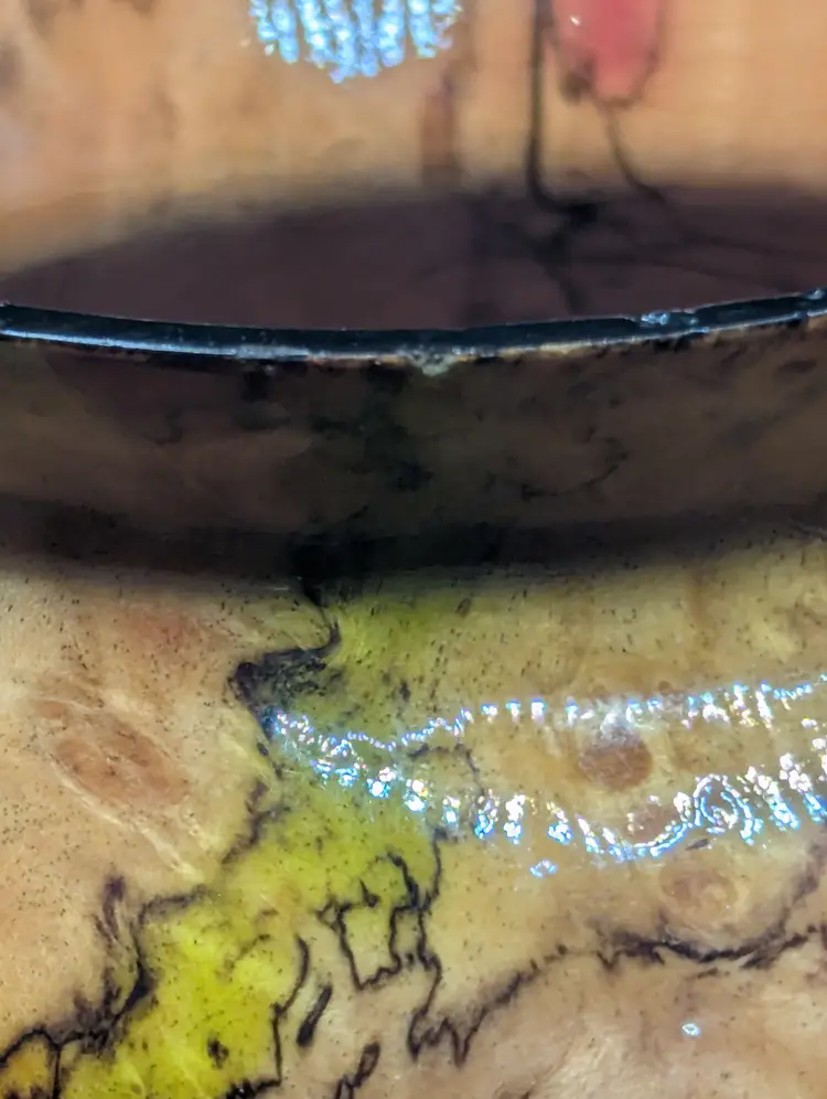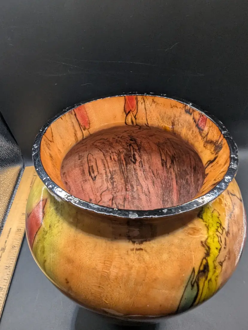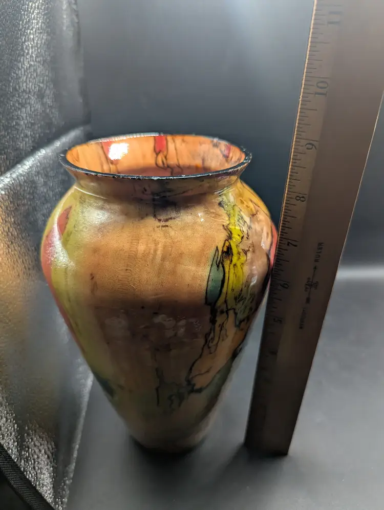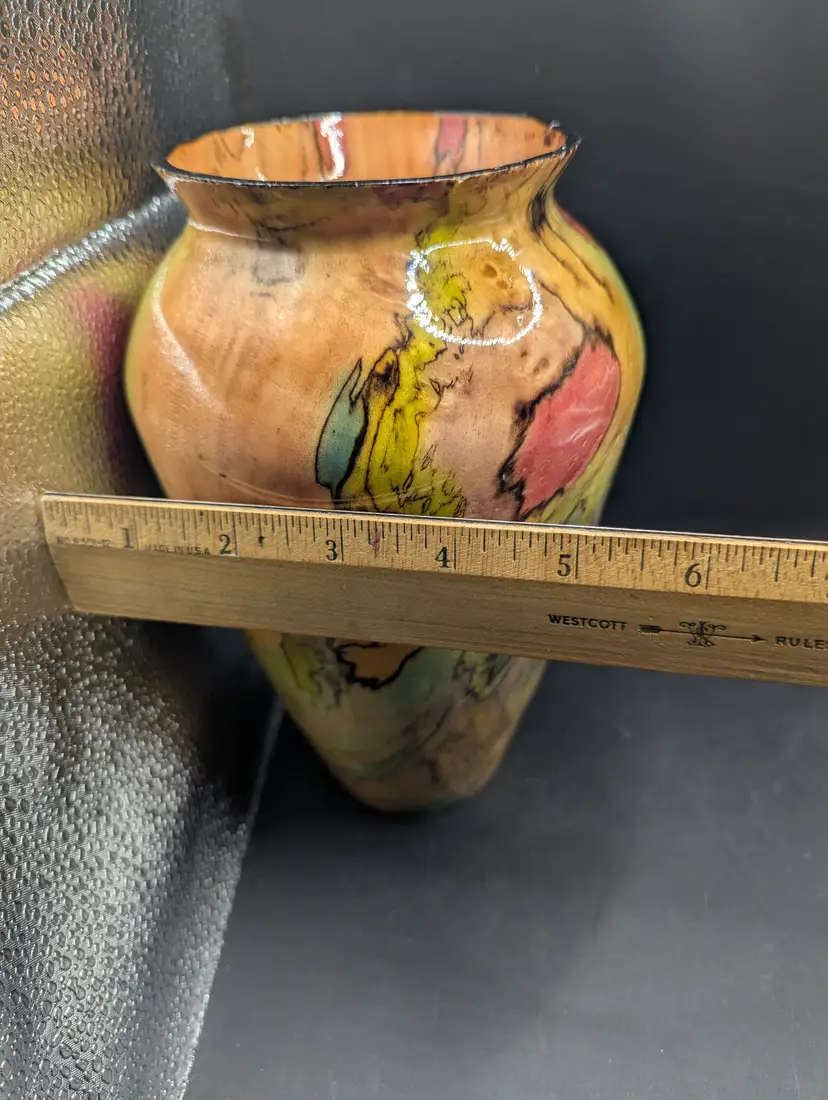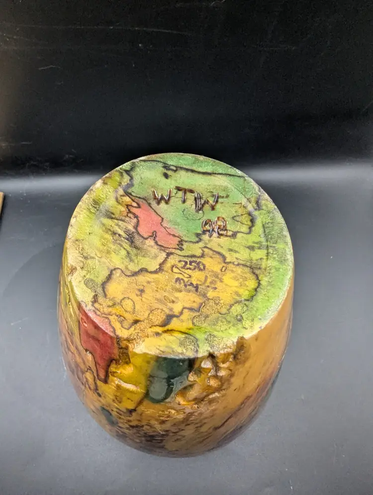 This is a lovely Vintage MCM Thin Wood Vase Possibly Teak or Burl Hand Turned Signed Dated Numbered. It has an amazing modern glaze with various swirl colors. The rim does have some small chips as seen in last three pictures. It measures 6 inches in diameter and stands almost 9 inches tall. Please see all pictures for condition and measurements.