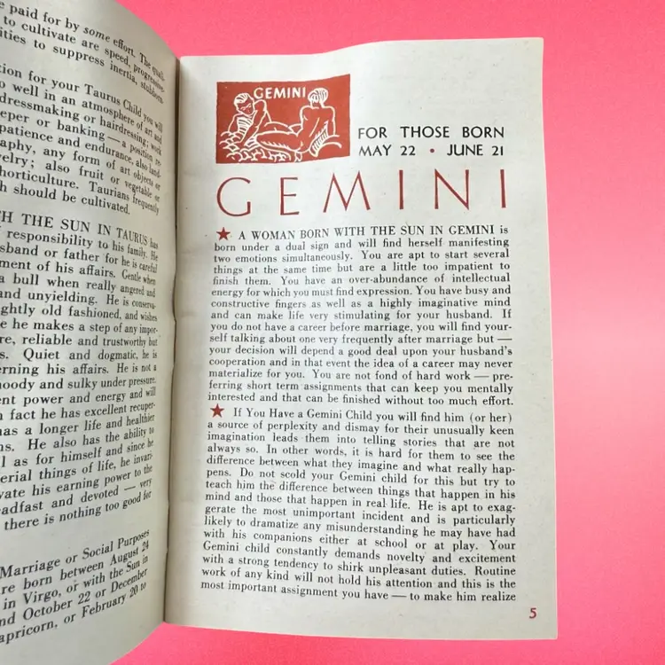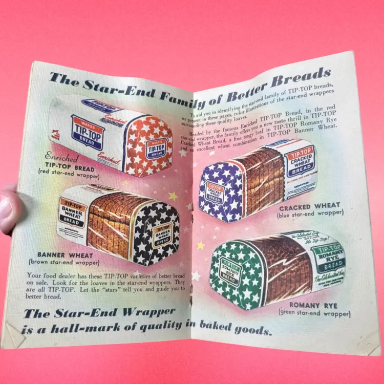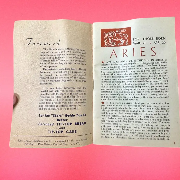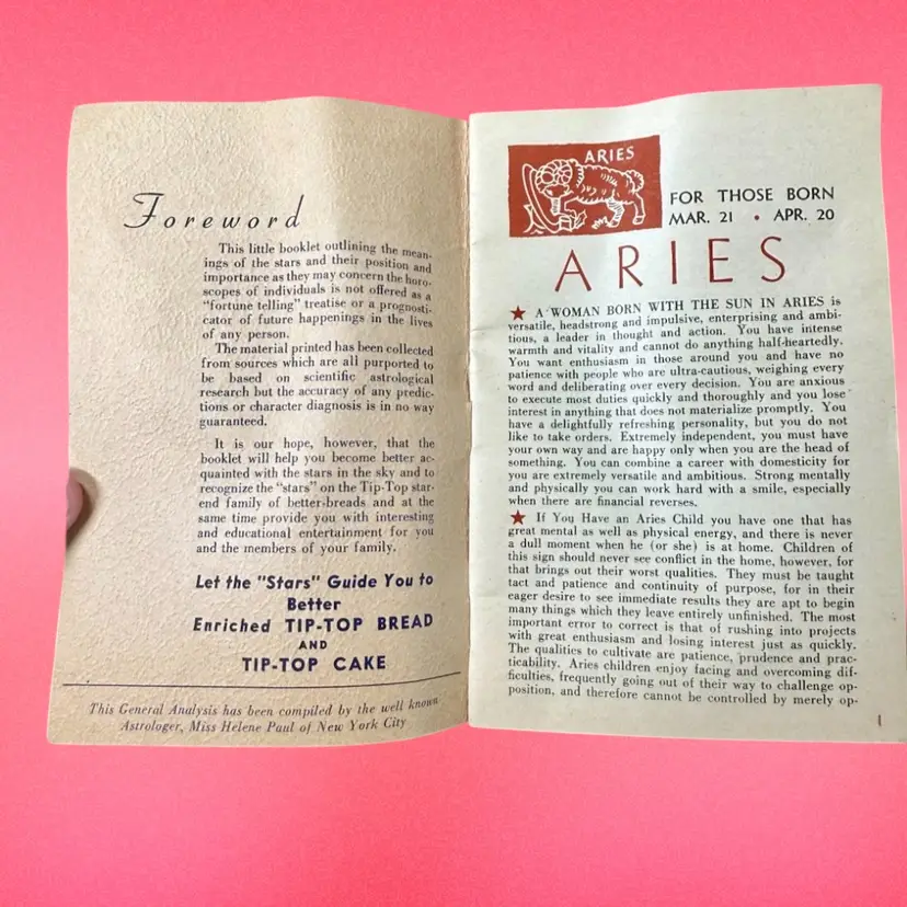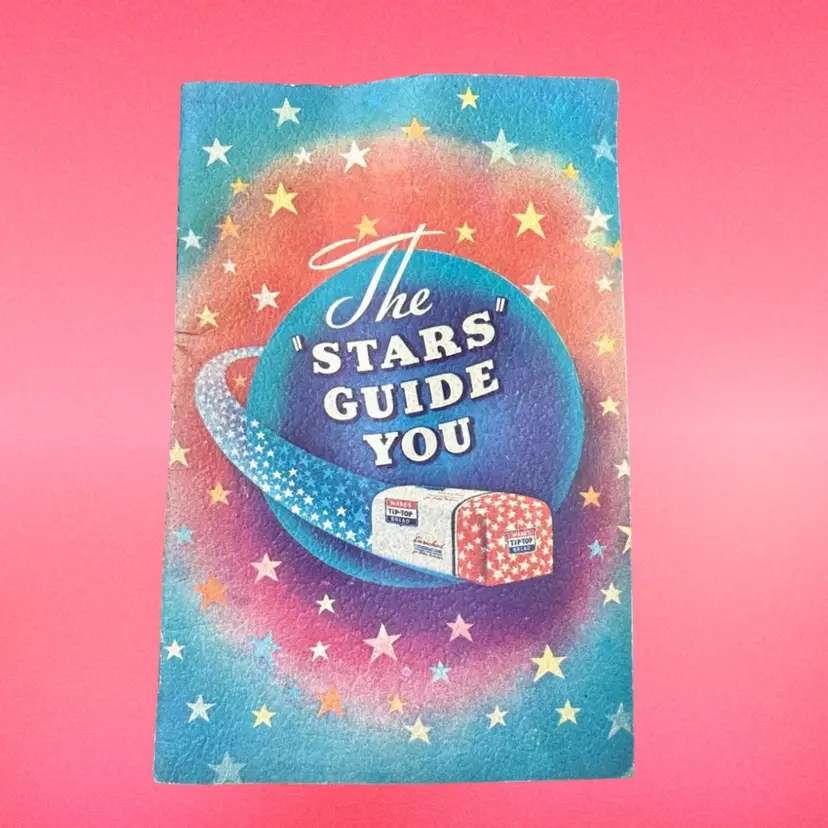 Small mid century promotional paperback booklet, distributed by Tip-Top bread. Has an amazing cover, some fun graphics inside, as well as astrology readings. **NOTE due to age and wear, booklet is a bit darkened and pages are a little warped (doesn’t lay perfectly flat). May be able to combat that a little by placing it under some heavy books for a period of time to flatten.