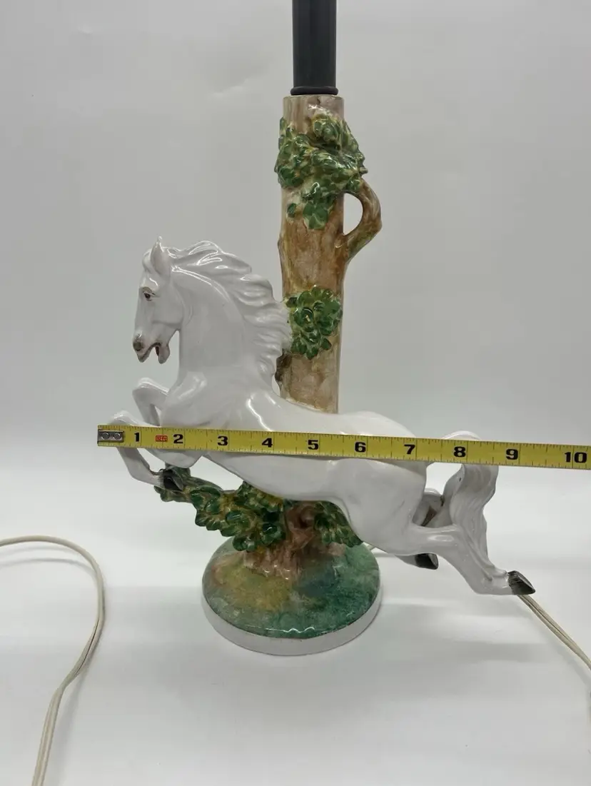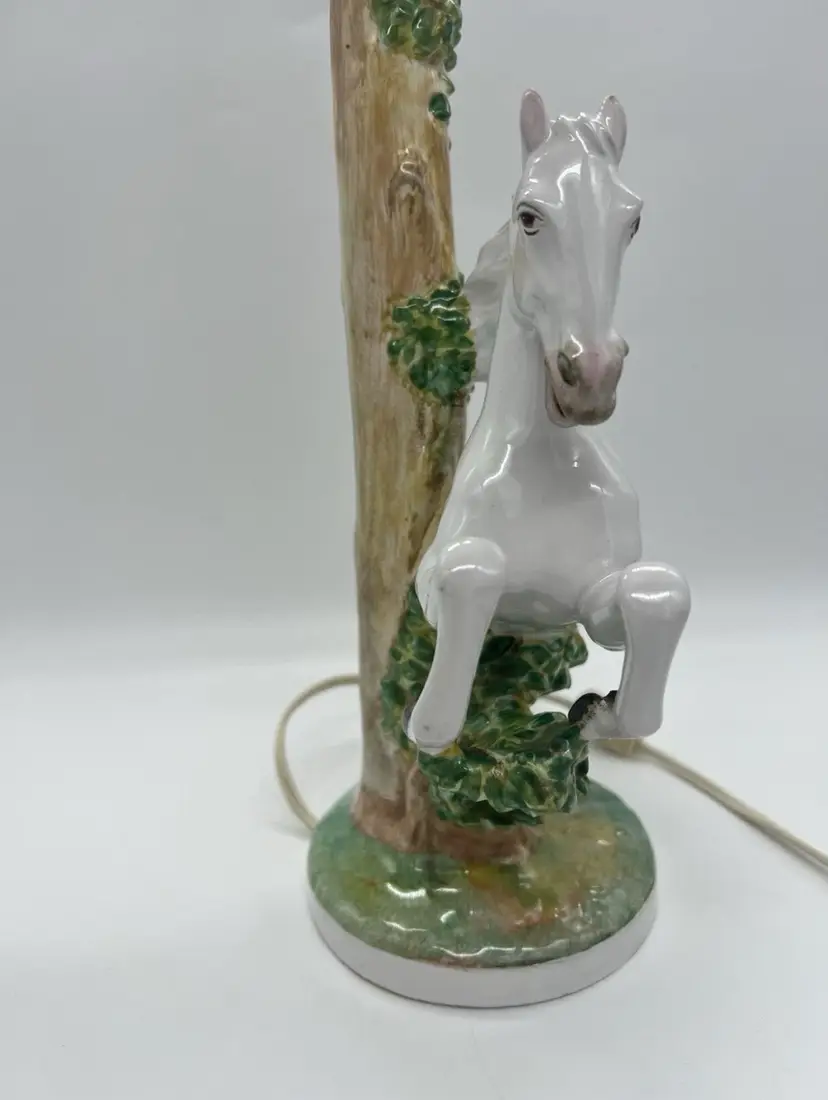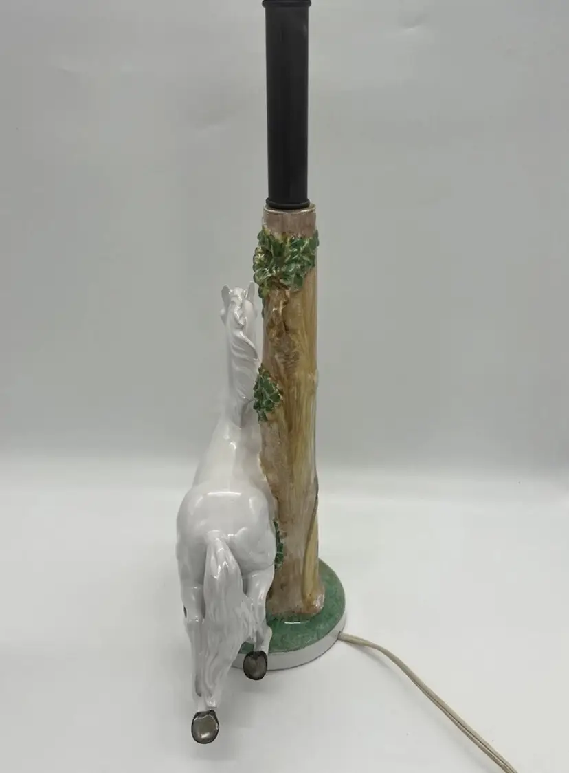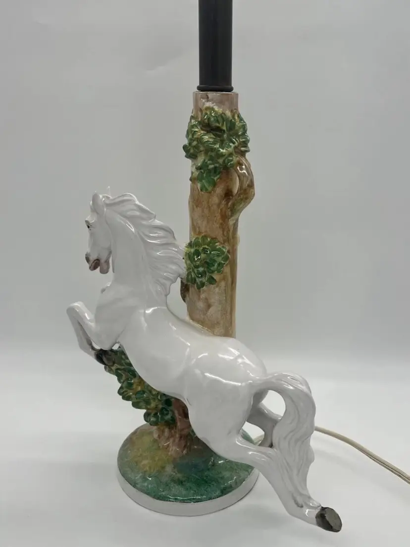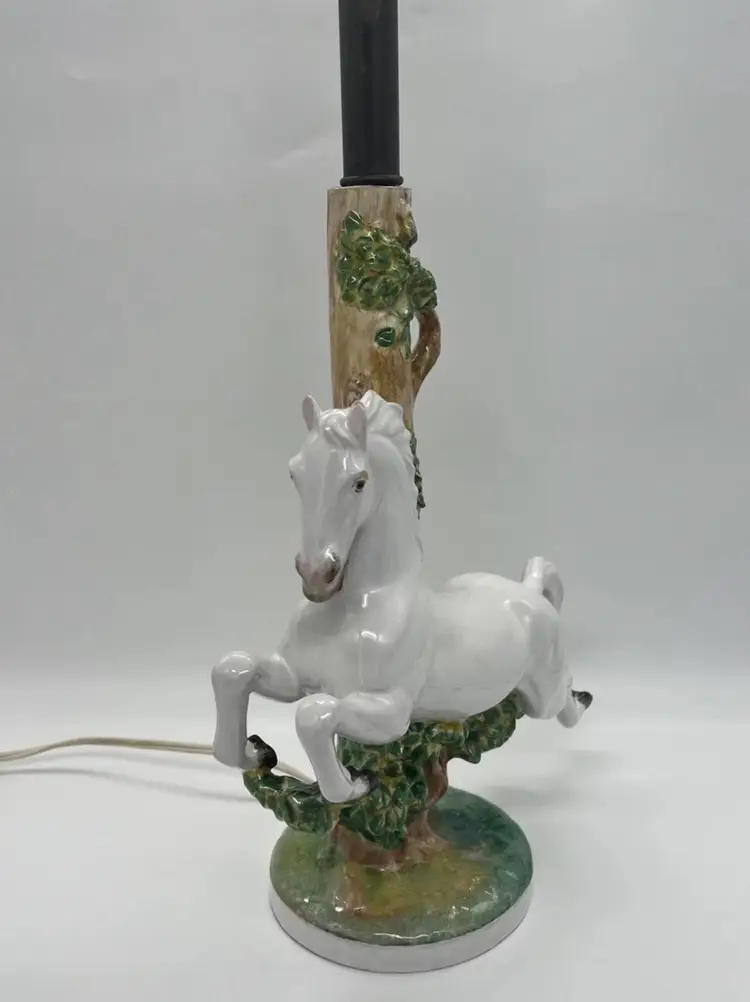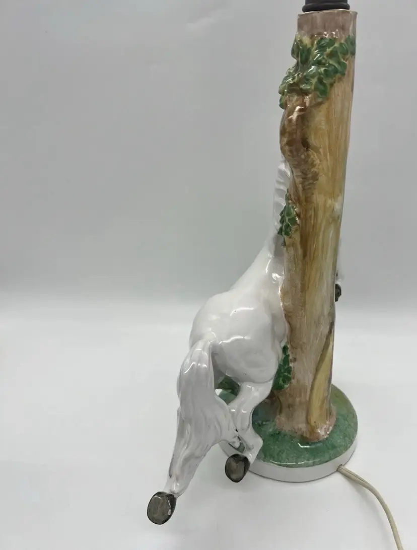 Add a touch of Italian craftsmanship to your home with this stunning vintage MCM Ugo Zaccagnini table lamp. The lamp features a figural design of a white horse, with intricate details that showcase the exquisite artistry of Italian pottery. The lamp stands at 18 1/2" in height and is an original piece from Italy.