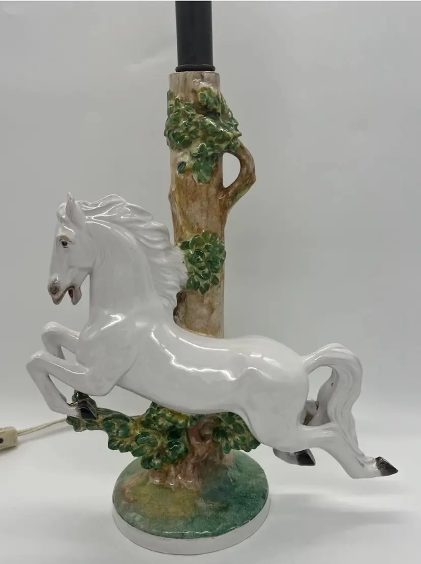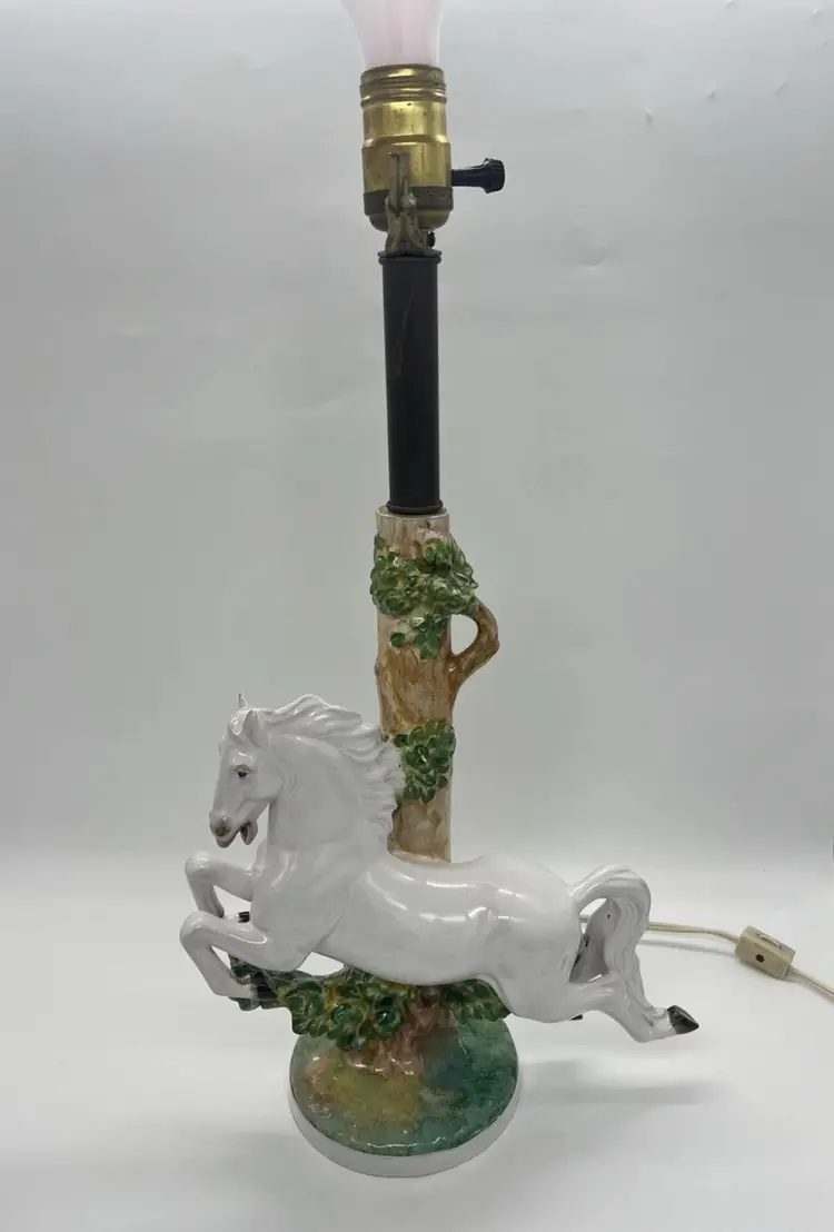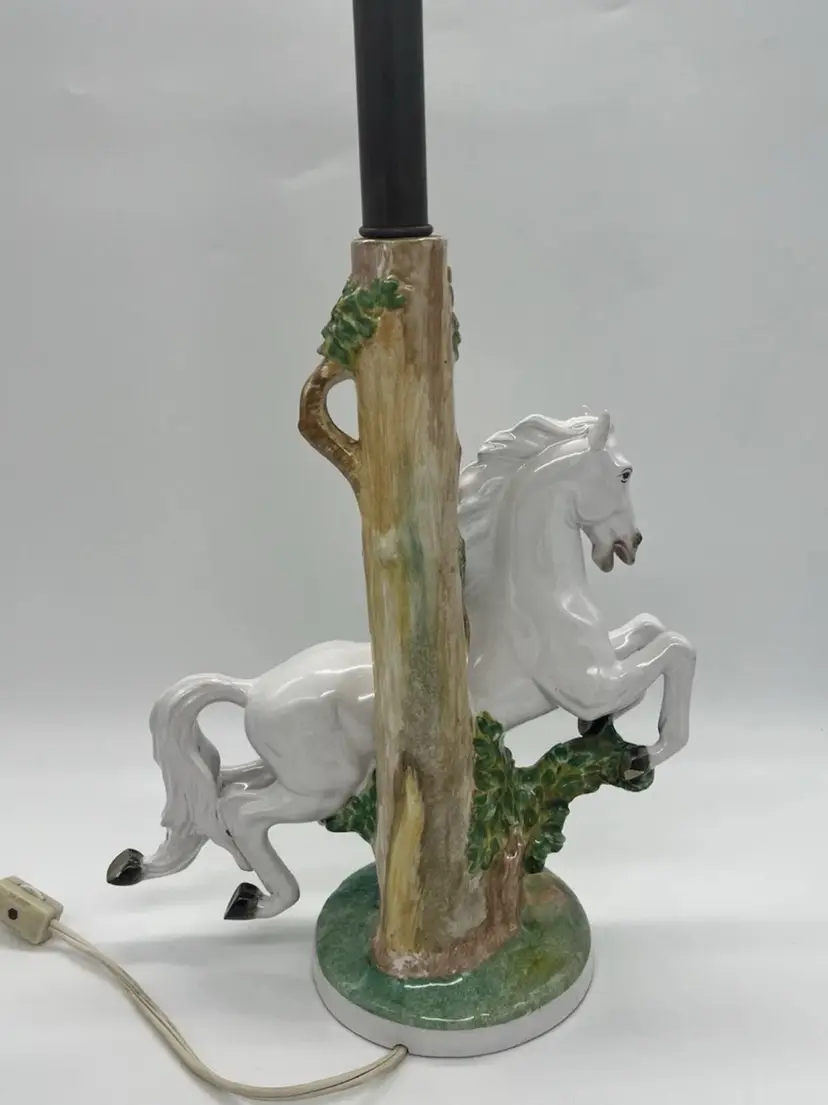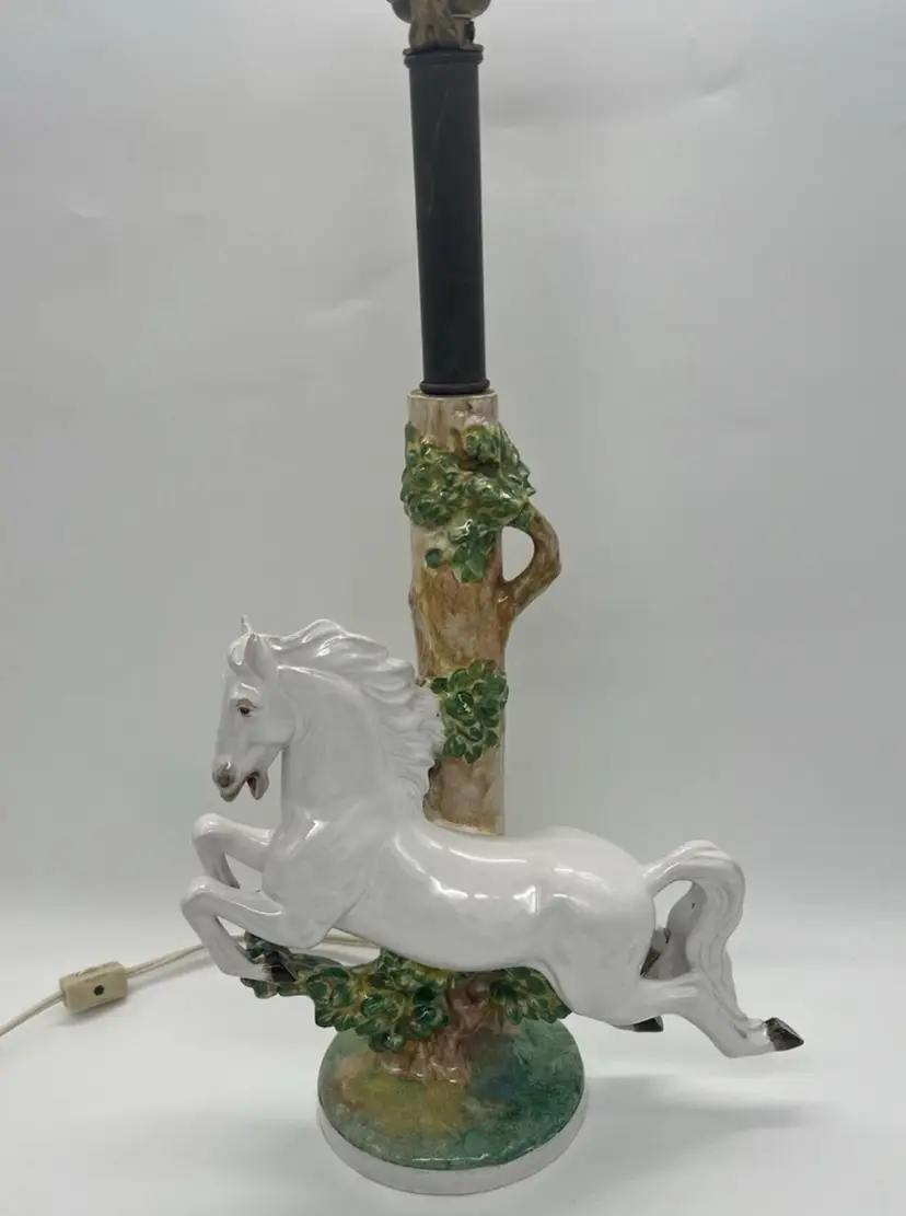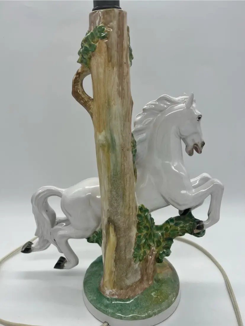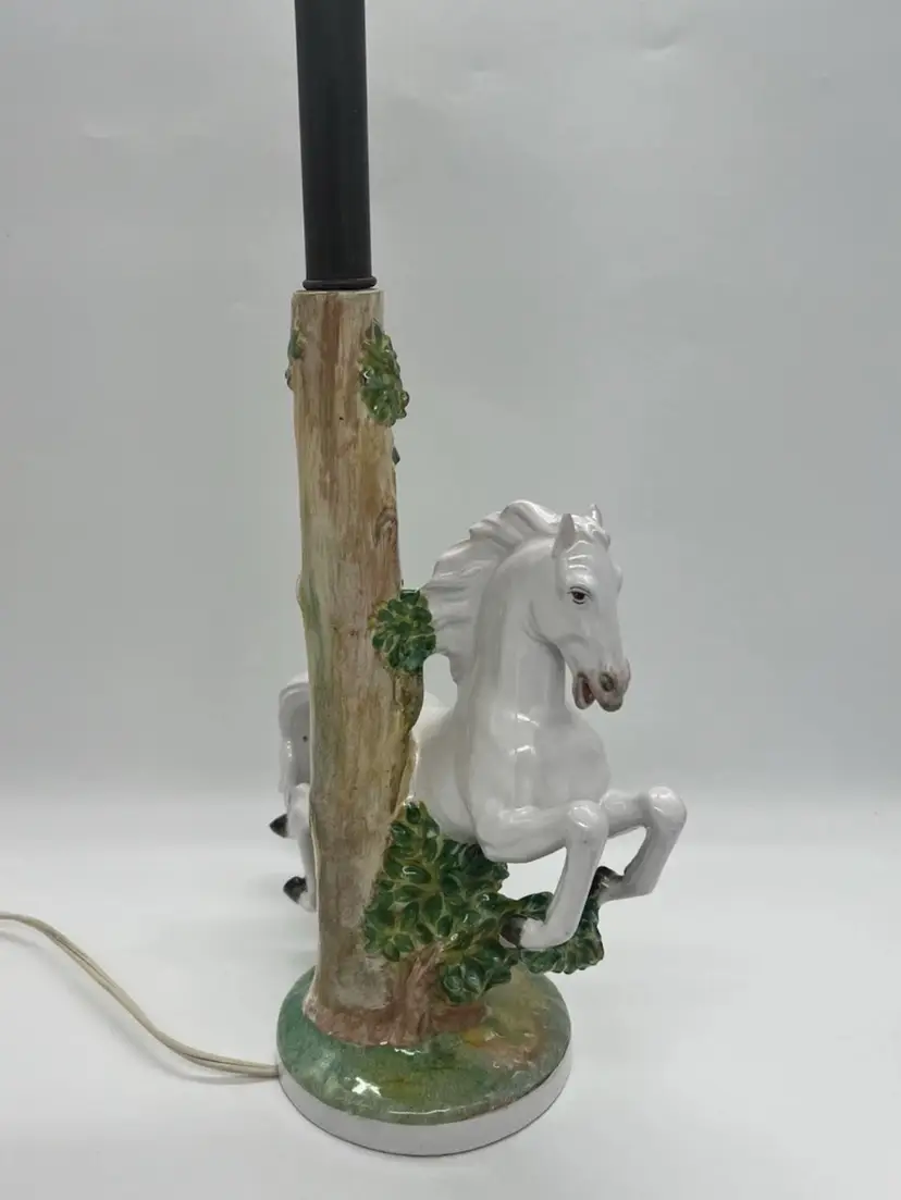 Add a touch of Italian craftsmanship to your home with this stunning vintage MCM Ugo Zaccagnini table lamp. The lamp features a figural design of a white horse, with intricate details that showcase the exquisite artistry of Italian pottery. The lamp stands at 18 1/2" in height and is an original piece from Italy.