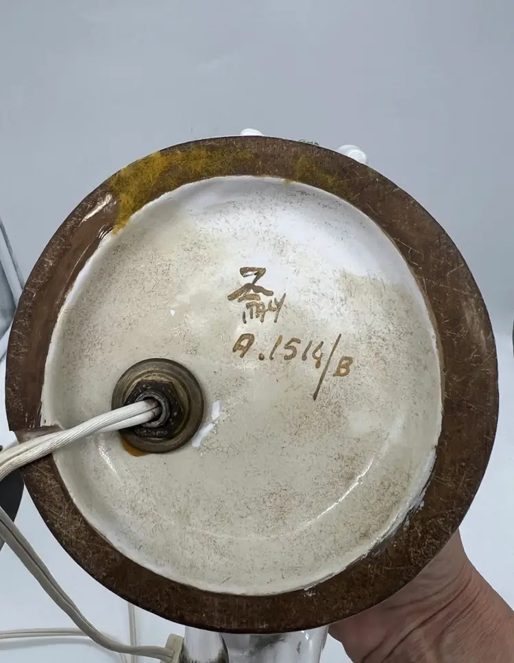Good vintage condition. There are a few chips as pictured. No cracks. The lamp does work, but I recommend rewiring before regular