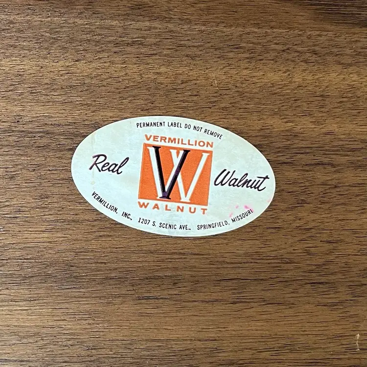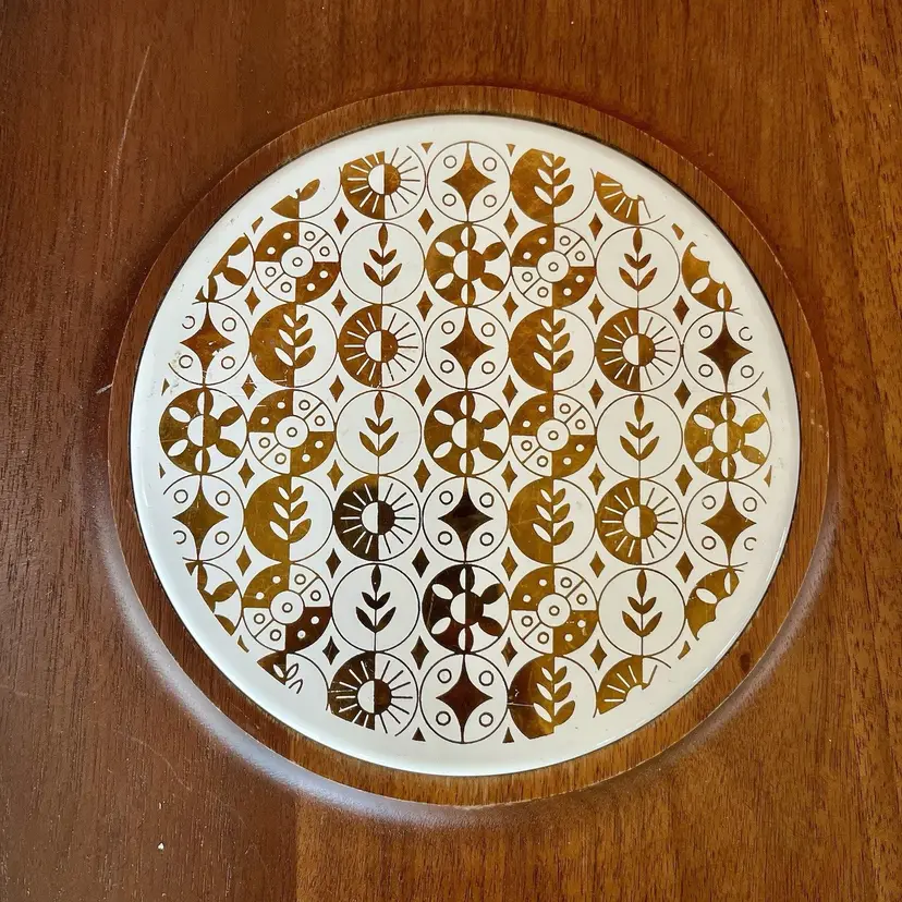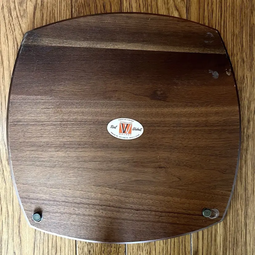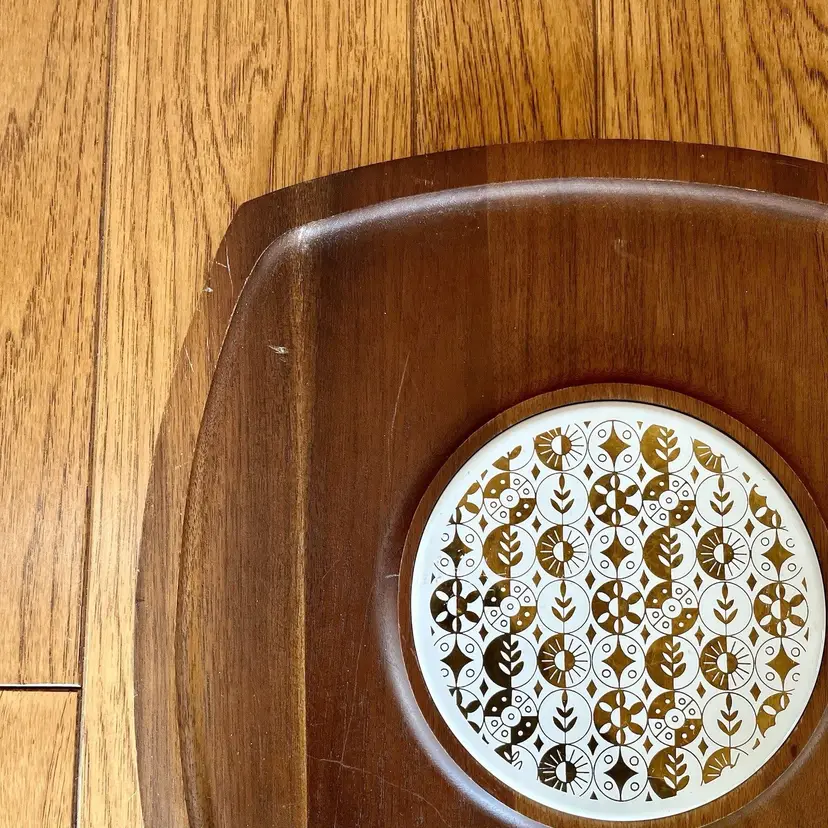 This listing is for a large Vermillion walnut serving board. Features an inlaid ceramic tile with a Mid Century gold design. Wood has scratches as pictured, may come out with a good refinishing. Measures about 14" across.