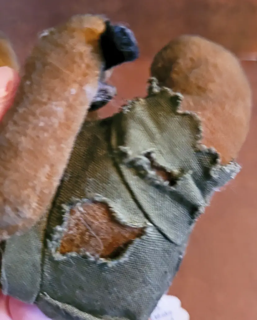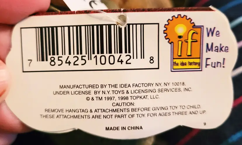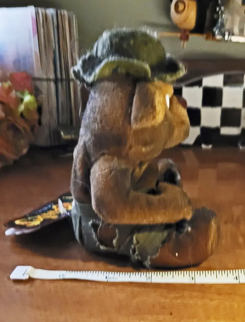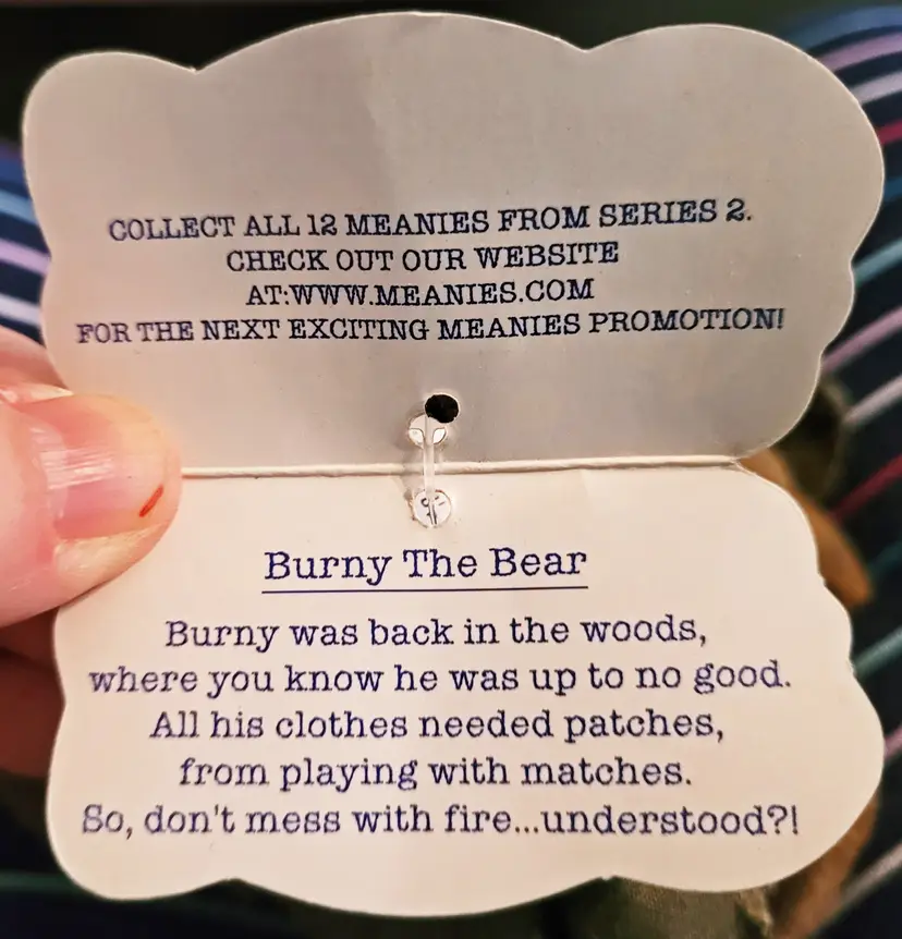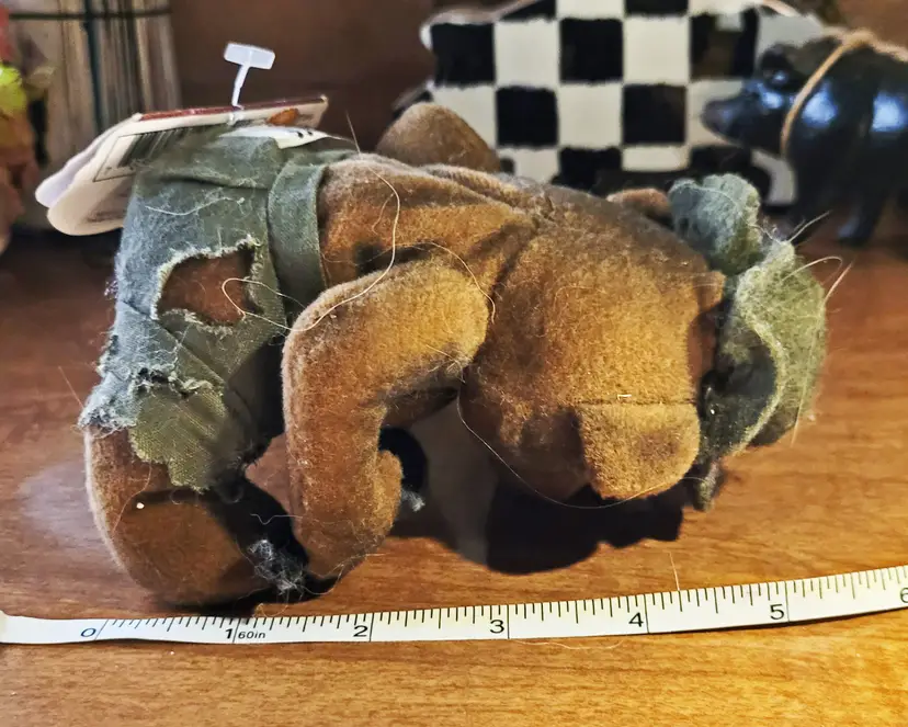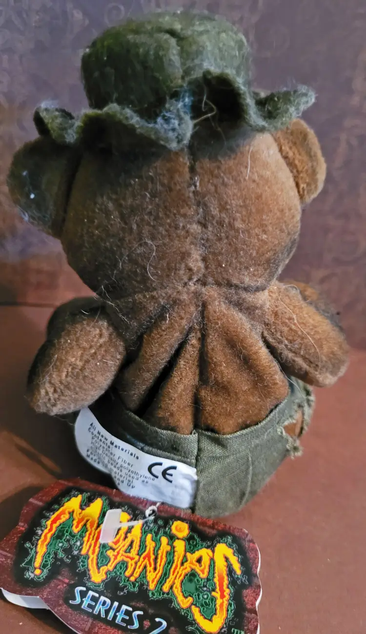 Vintage Meanies Series 2 Plush 'Burny The Bear' by The Idea Factory c.1997 Topkat, LLC. Made in China. Note- the ripped clothing is supposed to be there Approx. 3.5x5.5x3.5