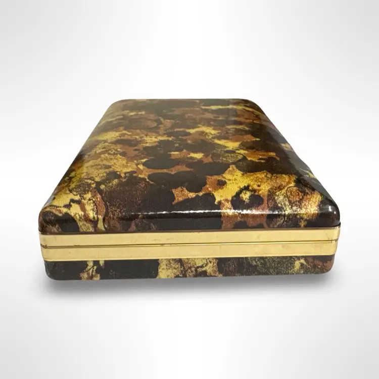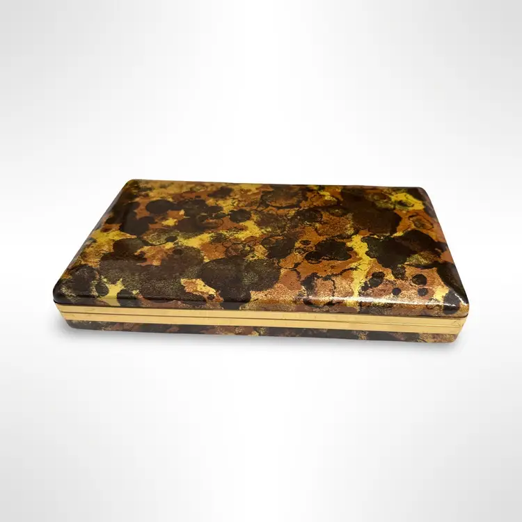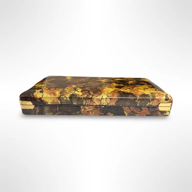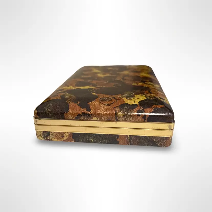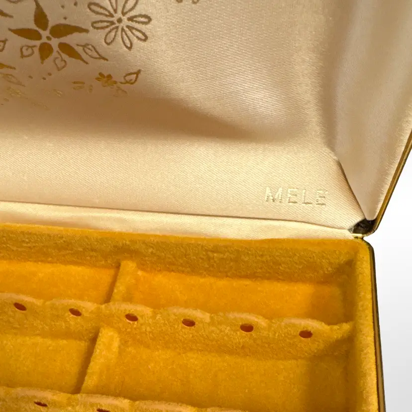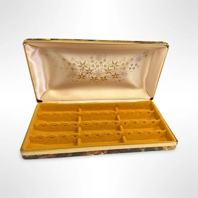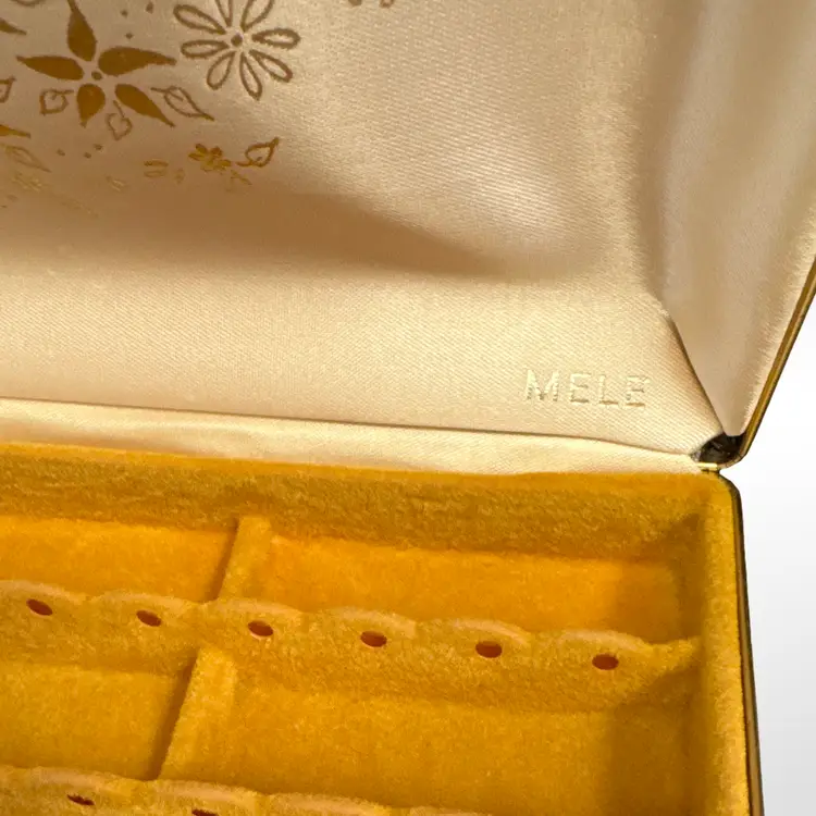Great vintage Mele hard case tortoise shell earring case jewelry box. In good vintage condition with some light scratching to the outer surfaces that is only really visible in certain light. Measures approximately 8.5” L x 5” W x 1.75” H