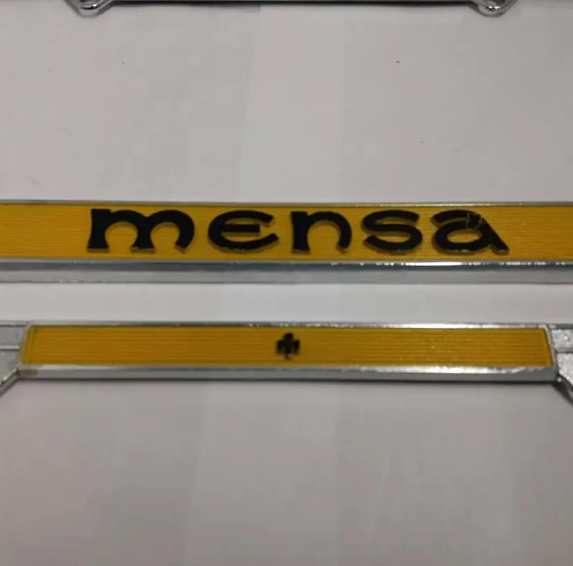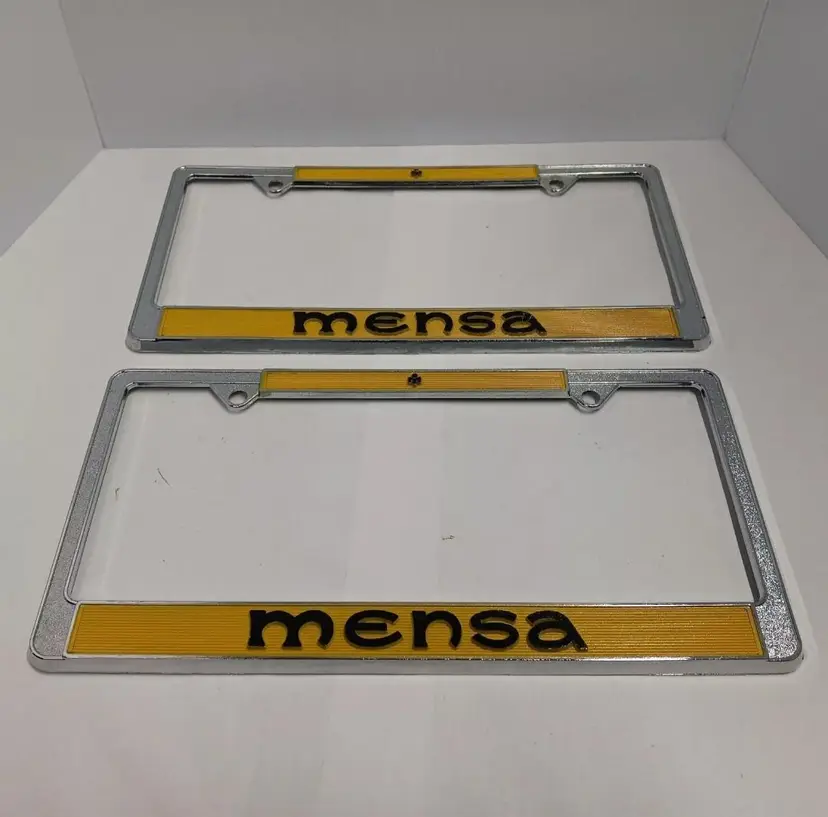 This vintage license plate frame was manufactured in the United States and is a great addition to any collector's collection. The MENSA Booster design is highly sought after and these frames are in pristine condition. Sold as a set of two, these metal frames are unused and in excellent shape. The perfect way to show off your IQ and add some unique flair to your vehicle.