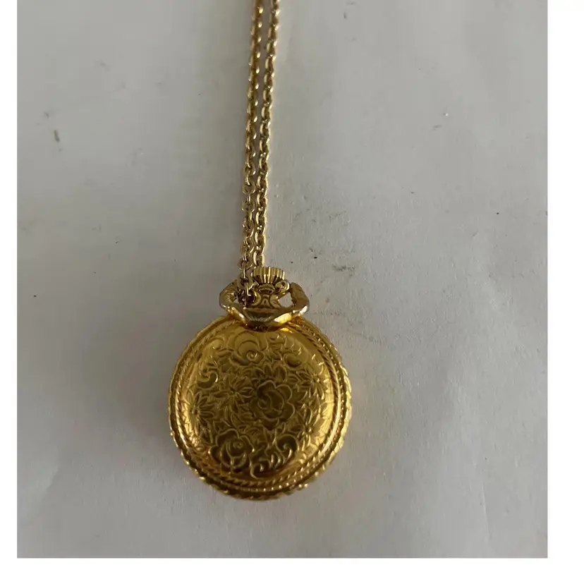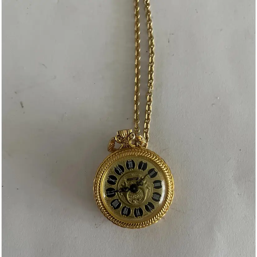 Vintage Mentor brand Watch on gold colored chain 30" 17 Jewels Swiss Made Back is beautifully embossed Non-working but may be able to fix Fast shipping