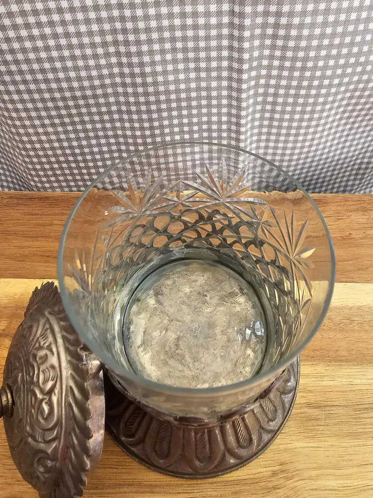 Elegant vintage candle holder featuring a beautiful combination of metal and cut glass. Perfect for adding a touch of classic charm to your home decor. Does have 2 flea bites at top of glass. Not visible once lid is on it.