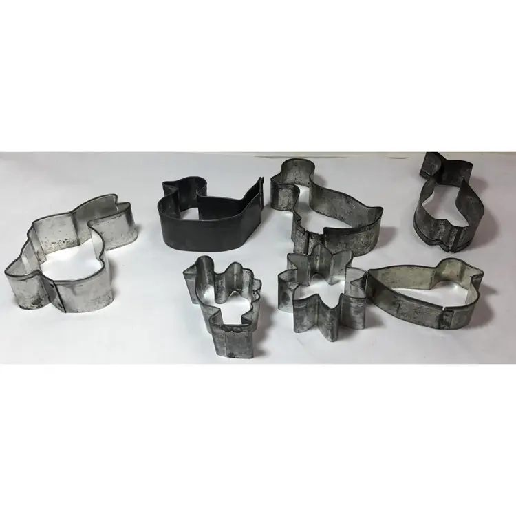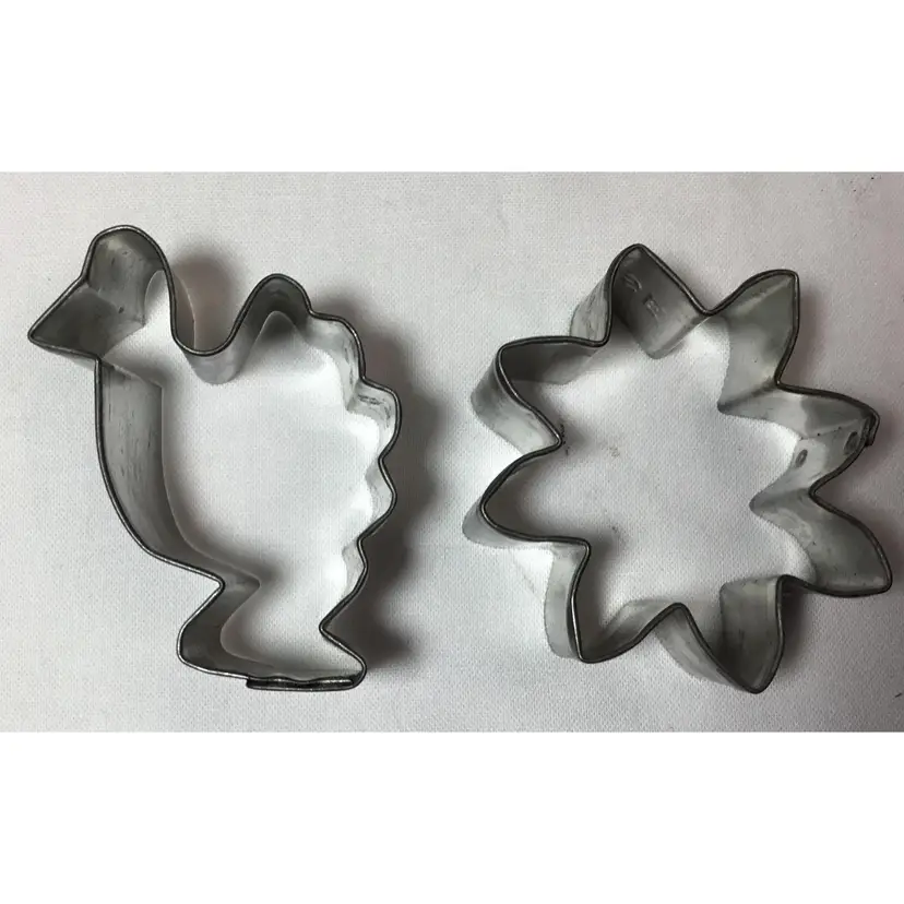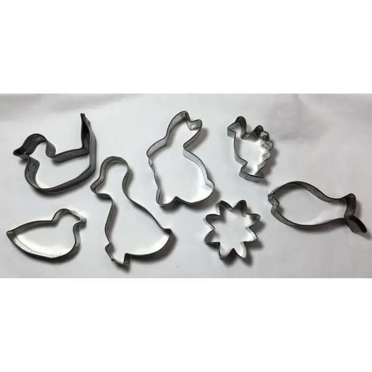 2 - 4 inches tall 2- 3 inches wide, Lot of 7 small to medium metal cookie cutters, Rabbit, turkey, flower, ducks, chick, fish.Most are unbranded, 2 small ones are Foose brand, flower and turkey. Great for vintage display. Good condition, spots are tarnished/discolored, minor bits of rust along edges (See all photos)