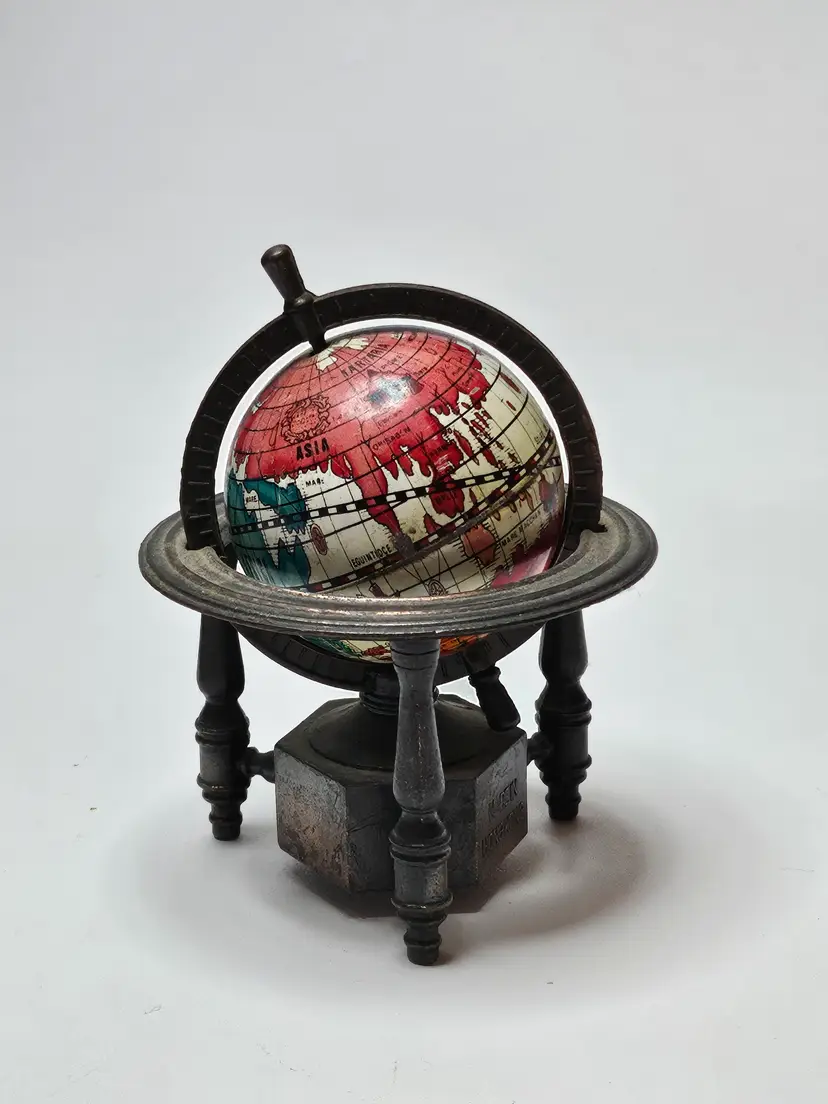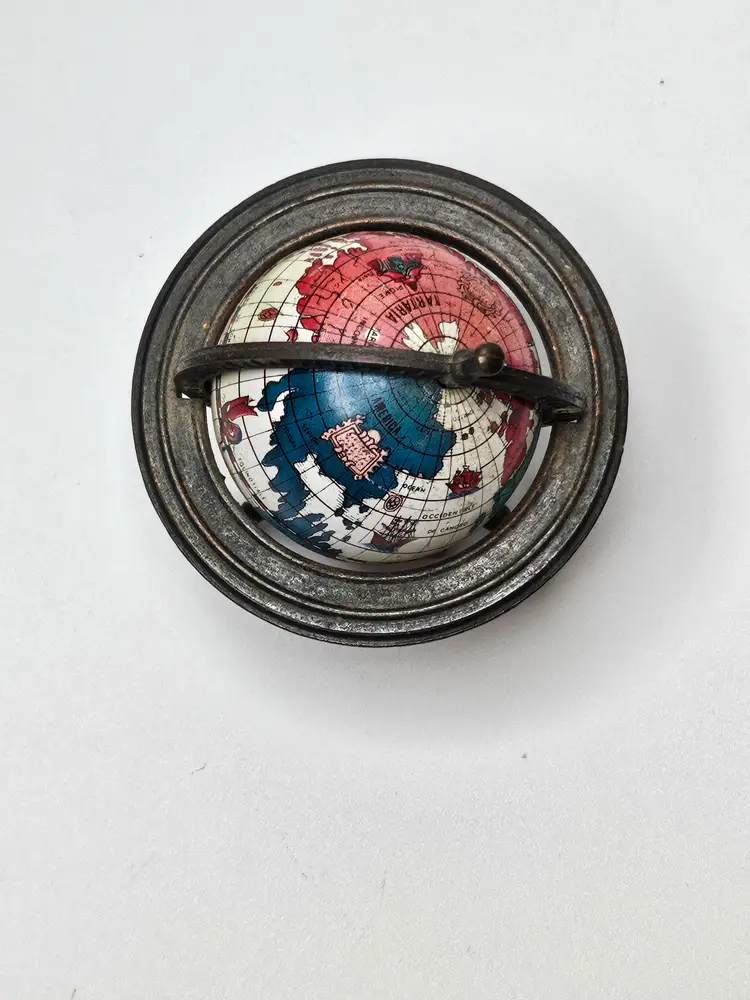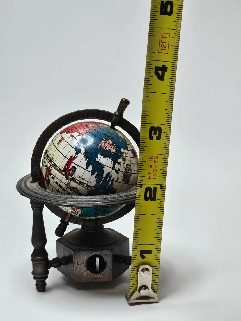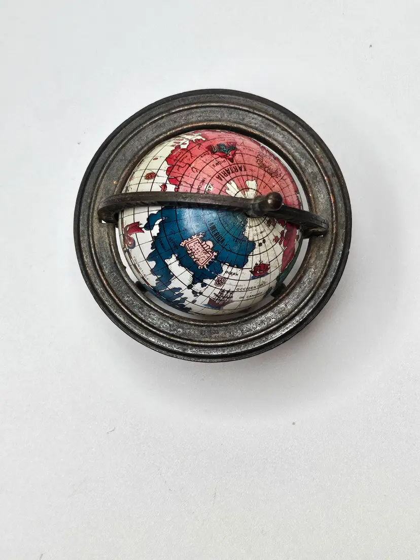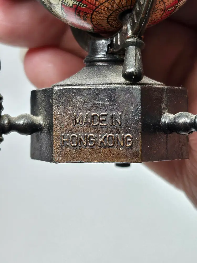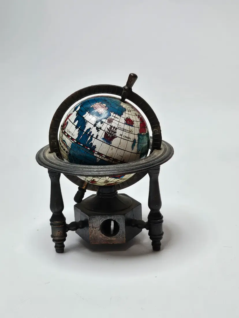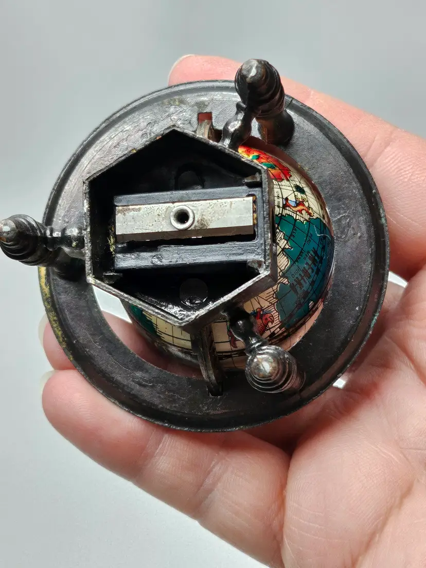 This vintage metal die-cast miniature replica spinning world globe pencil sharpener is a must-have for any collector. Crafted in Hong Kong, this unique piece features intricate details and is made of high-quality materials, making it a durable addition to any collection. The sharpener will make a great addition to any desk or display.