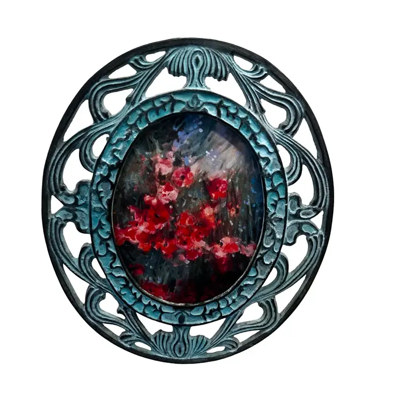 The frame is painted by me, and I added the art. There is one mark on the back of the bottom of the frame approximately 4 inches tall.