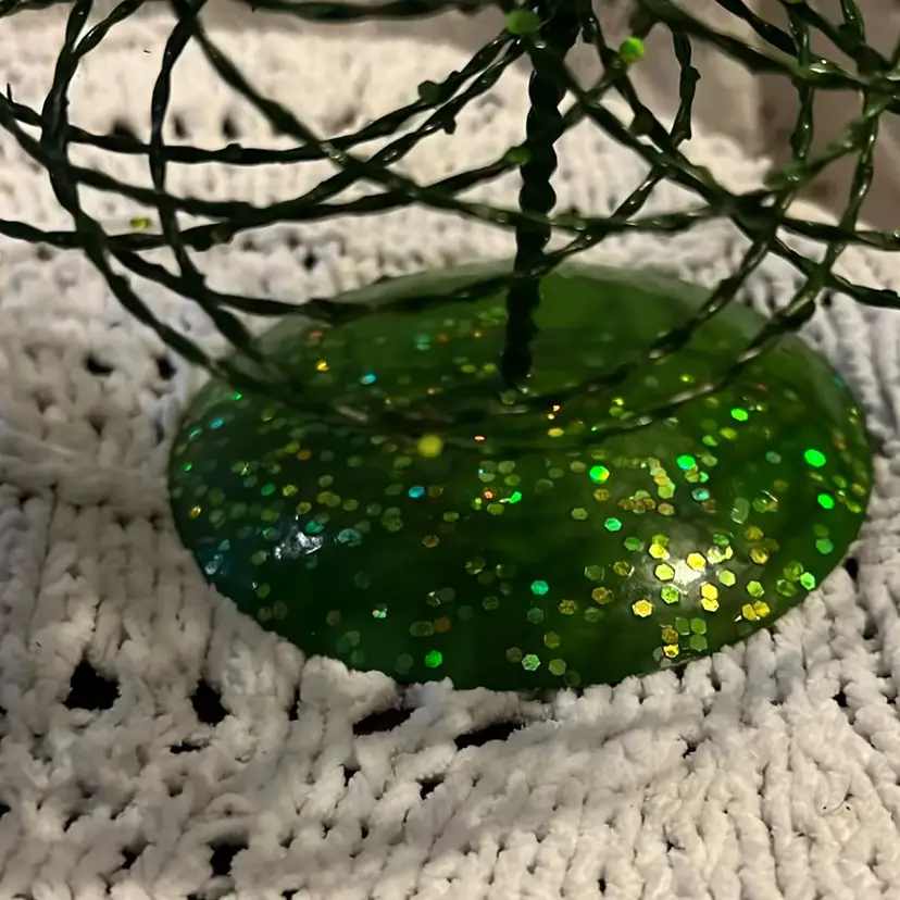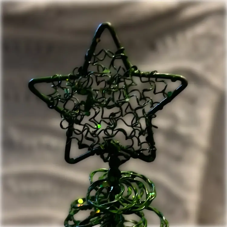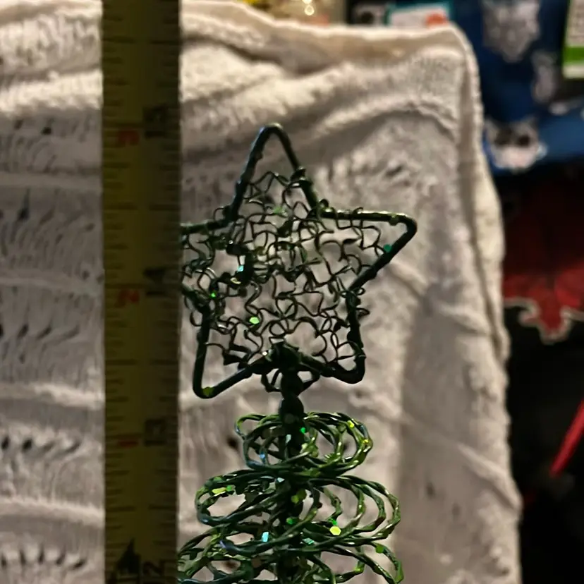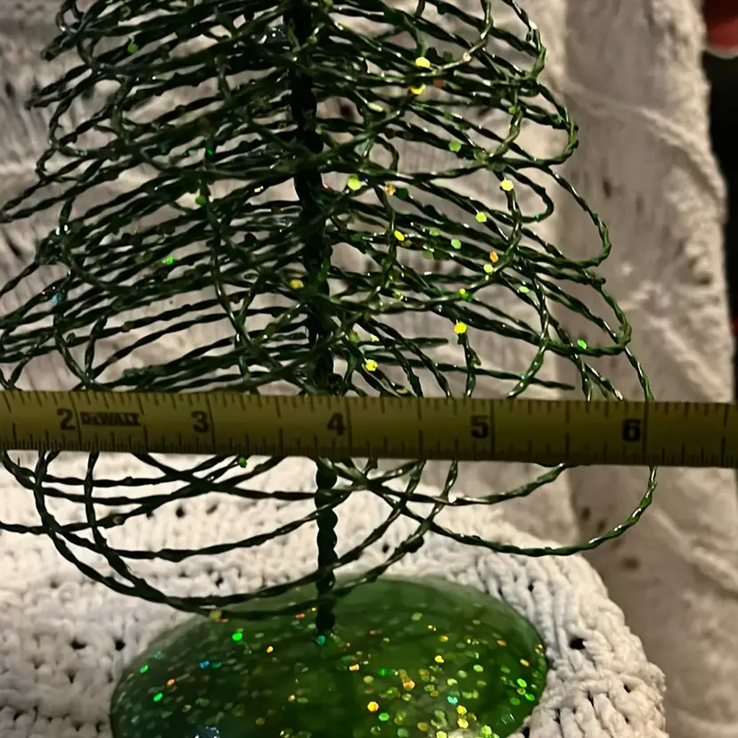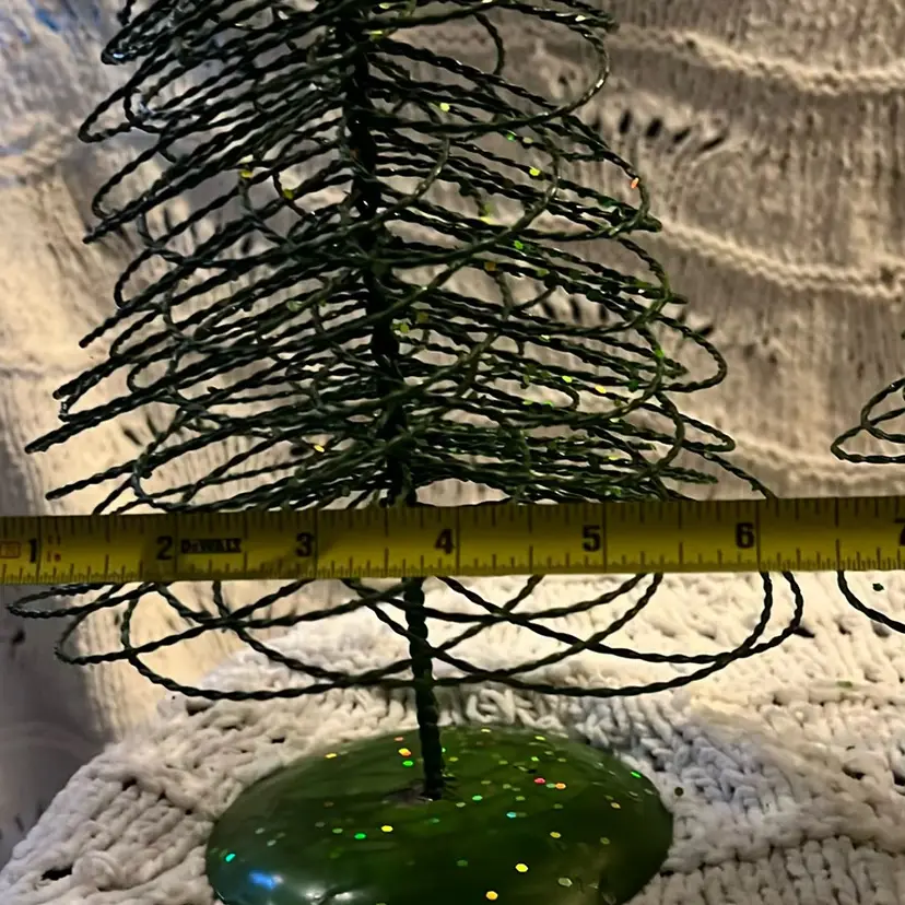 Two vintage metal wire Christmas tree from Pier 1 Imports. It features a green glittery finish and a star tree topper. 15 inches tall and about 7.5 inches wide.