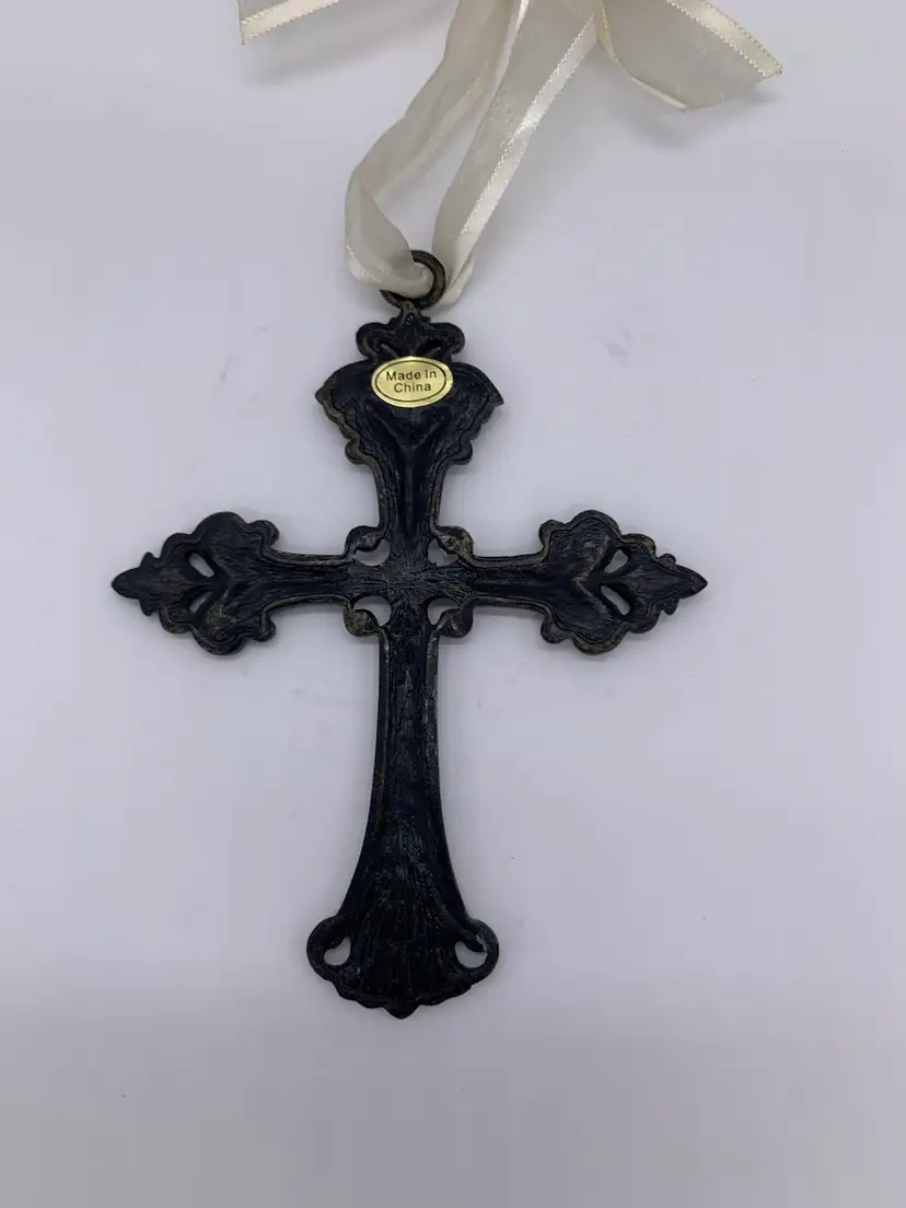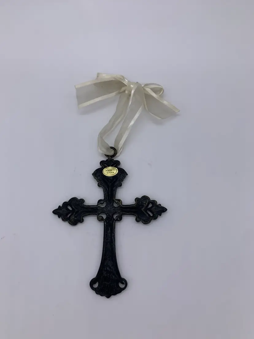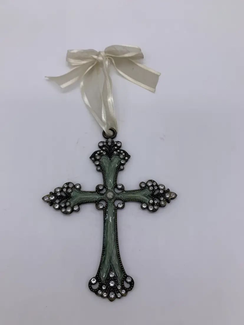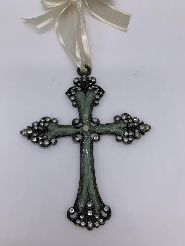 This vintage hanging cross ornament is a beautiful addition to any collection. The intricate metal design is highlighted with a beautiful organza ribbon for hanging on a wall, window, tree or a decorative tabletop piece. The cross has a seafoam green color with a marble swirl enamel design featuring 68 diamond rhinestones with a faux Pearl in the center section of the cross adding a touch of elegance to the piece. Measuring at 5.5 “ in height, hanging approximately 9” long with its ribbon, & 4” wide. it is the perfect size for display on a necklace as well!