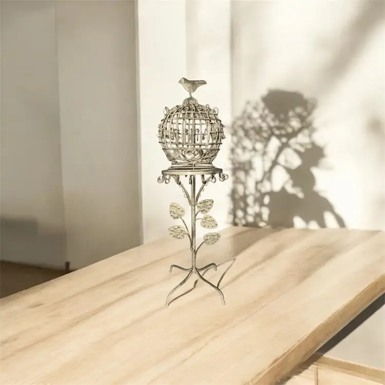 Expertly crafted from vintage metal, this shabby bird cage jewelry holder is the perfect accessory for any jewelry collection. Standing at 17 inches tall, this holder has ample room for all your earrings, bracelets, and necklaces. Complete with a charming bird perched inside, it's a unique and functional addition to any room.