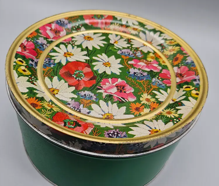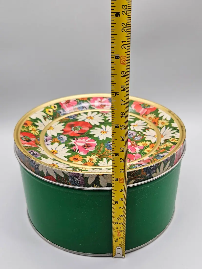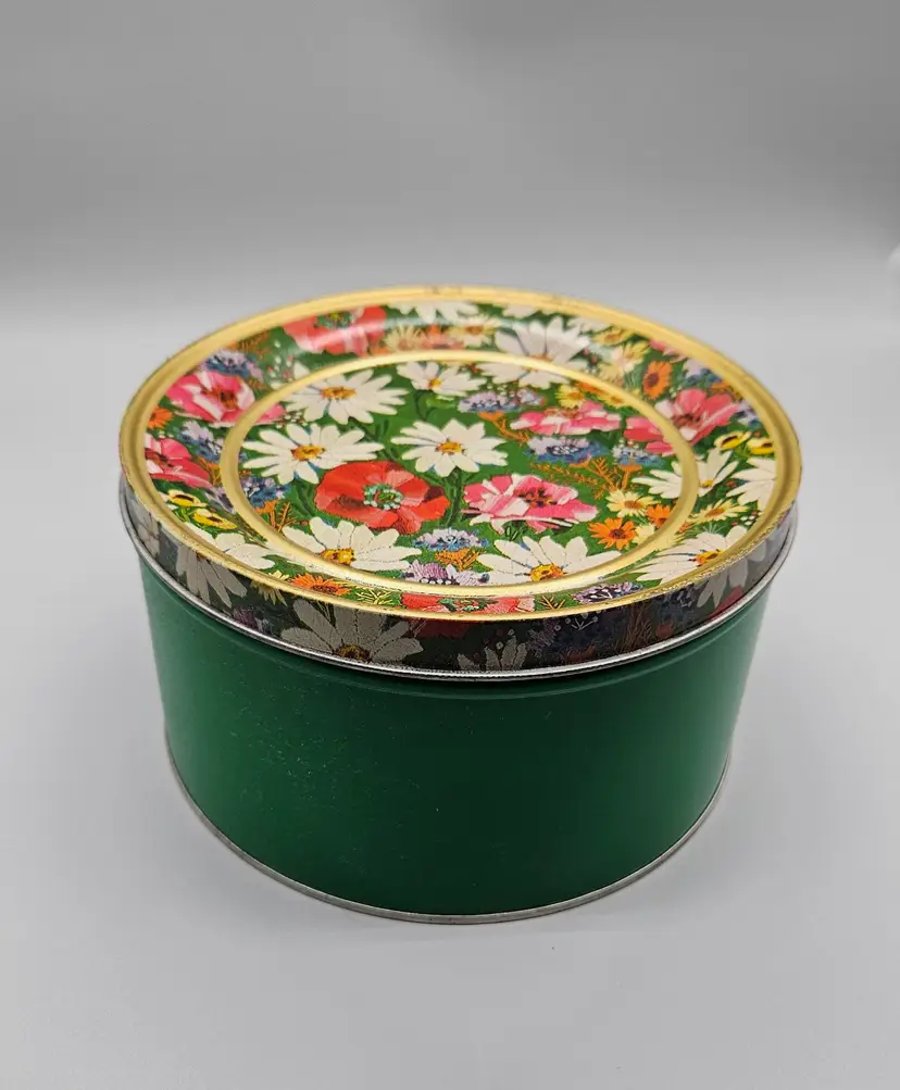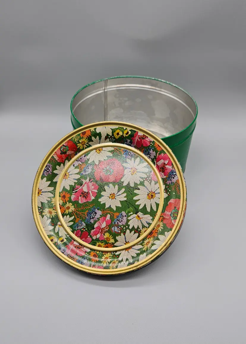 A vintage storage tin with a green bottle and a lid with bold colorful flowers. It is approximately 7 1/2" wide and 4 1/4' tall. It is in Good, Pre-owned condition, showing minimal wear from previous use. There is no makers mark.
