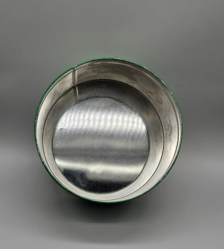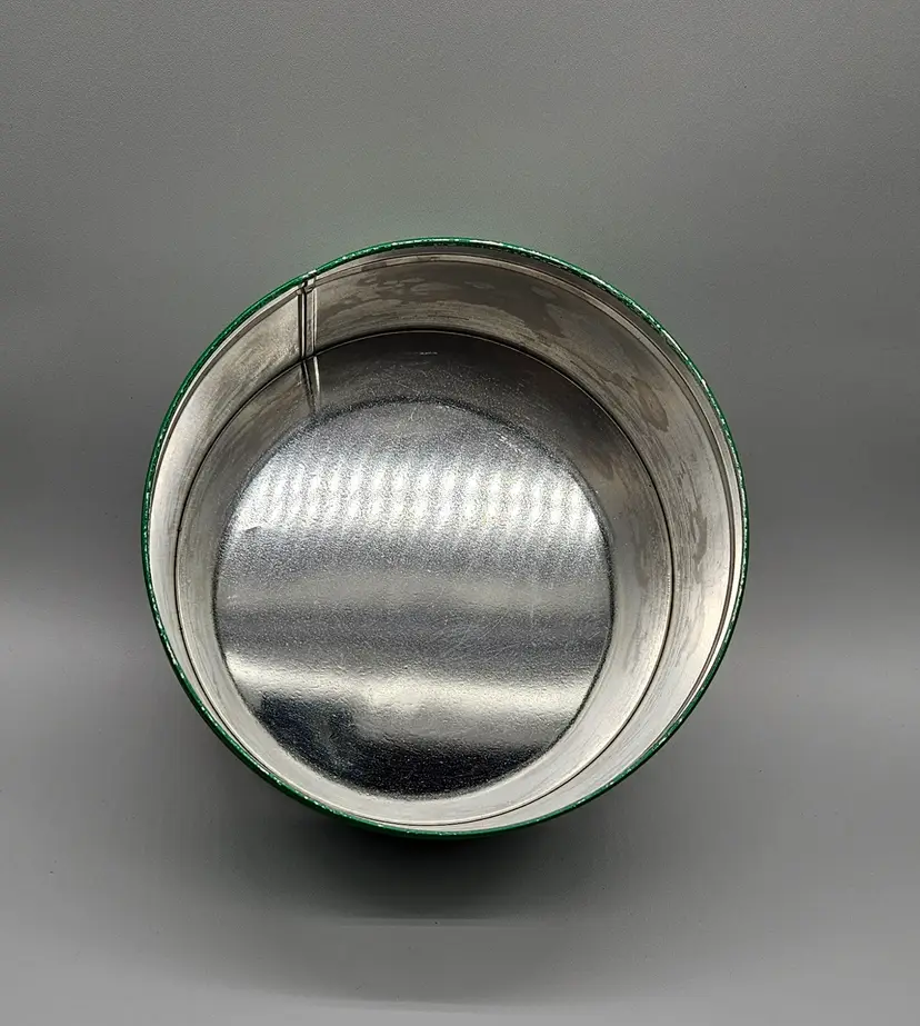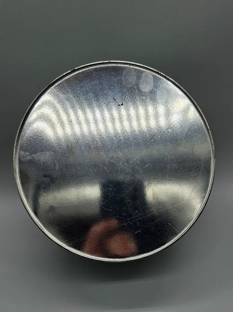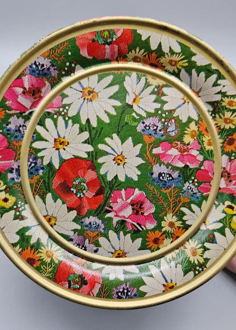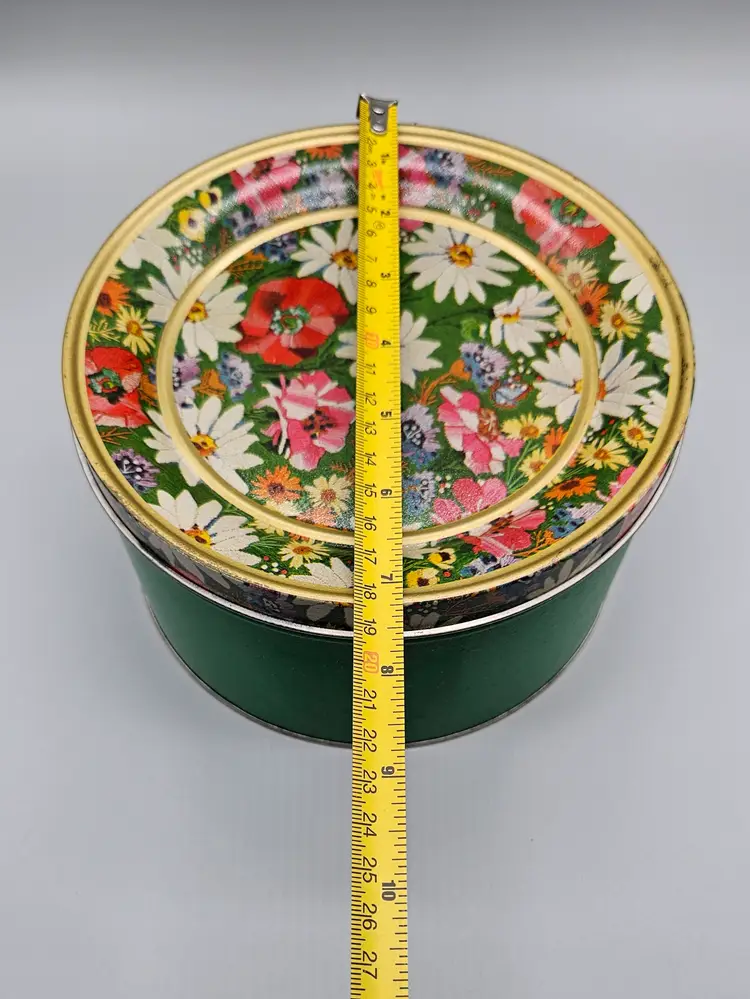 A vintage storage tin with a green bottle and a lid with bold colorful flowers. It is approximately 7 1/2" wide and 4 1/4' tall. It is in Good, Pre-owned condition, showing minimal wear from previous use. There is no makers mark.