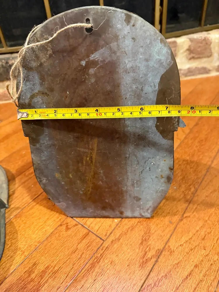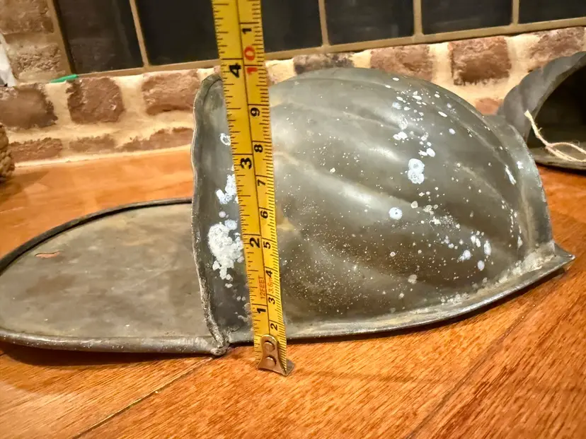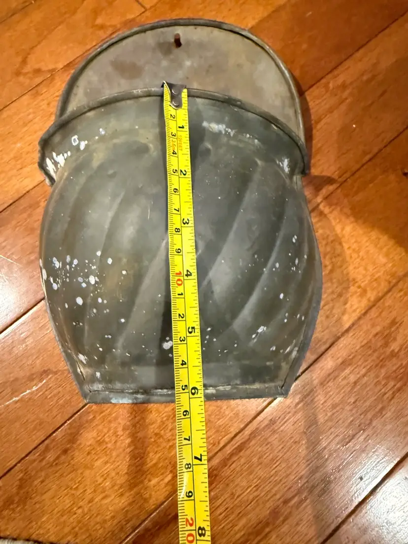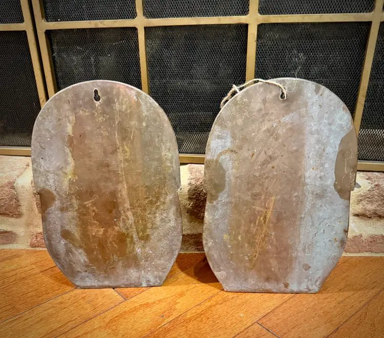 Set of 2 matching wall pockets Material: Galvanized metal/tin Measurements (each): • Height: ~11.5” • Width: ~7.5” • Depth: ~3.5” Pre-drilled holes for easy wall hanging Naturally aged patina with minor oxidation and wear consistent with age