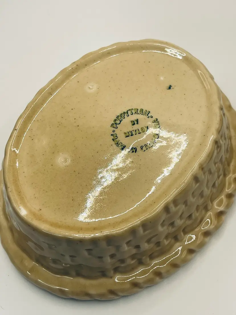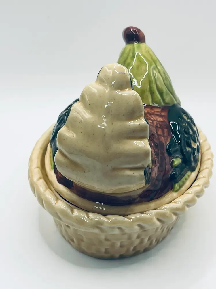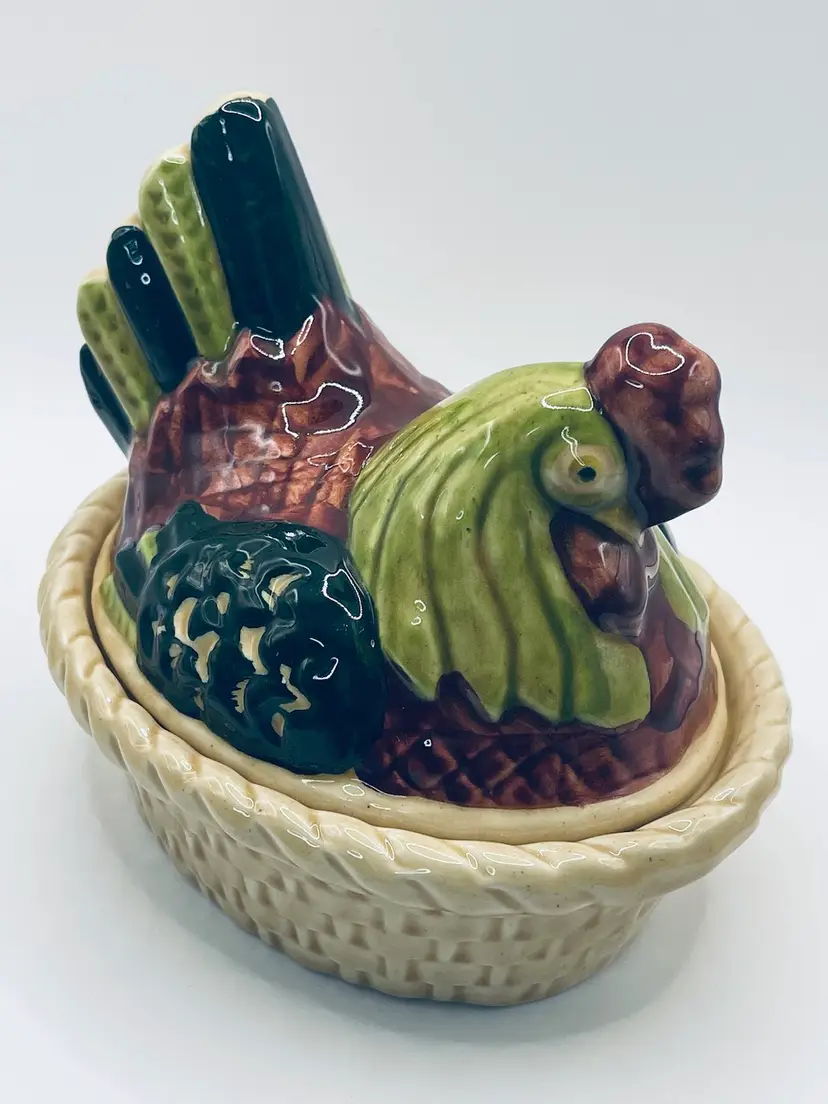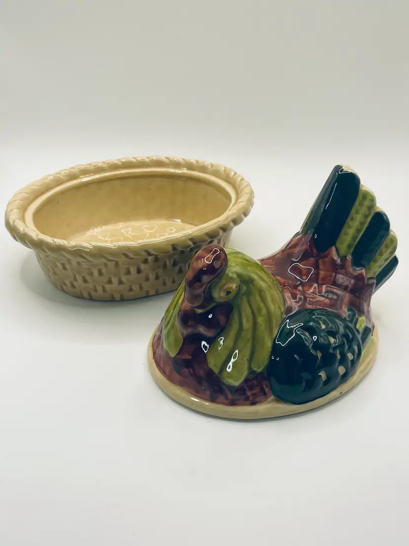 Vintage (1950s?) ceramic, Metlox Poppytrail Hen on Nest. Part of the Homestead Provincial collection, and was made in California, this beauty is a must for any collection! This measures approximately 6 inches tall and approximately 6 and a quarter inches wide. There are no chips or cracks, there is a glaze defect on the bottom that is shown in the last photo.