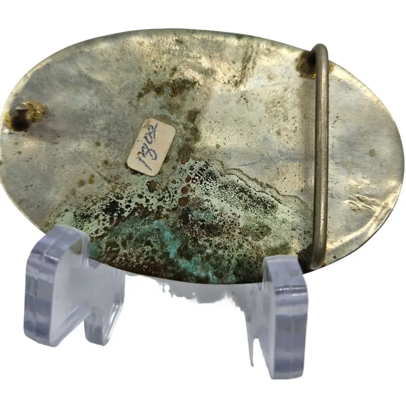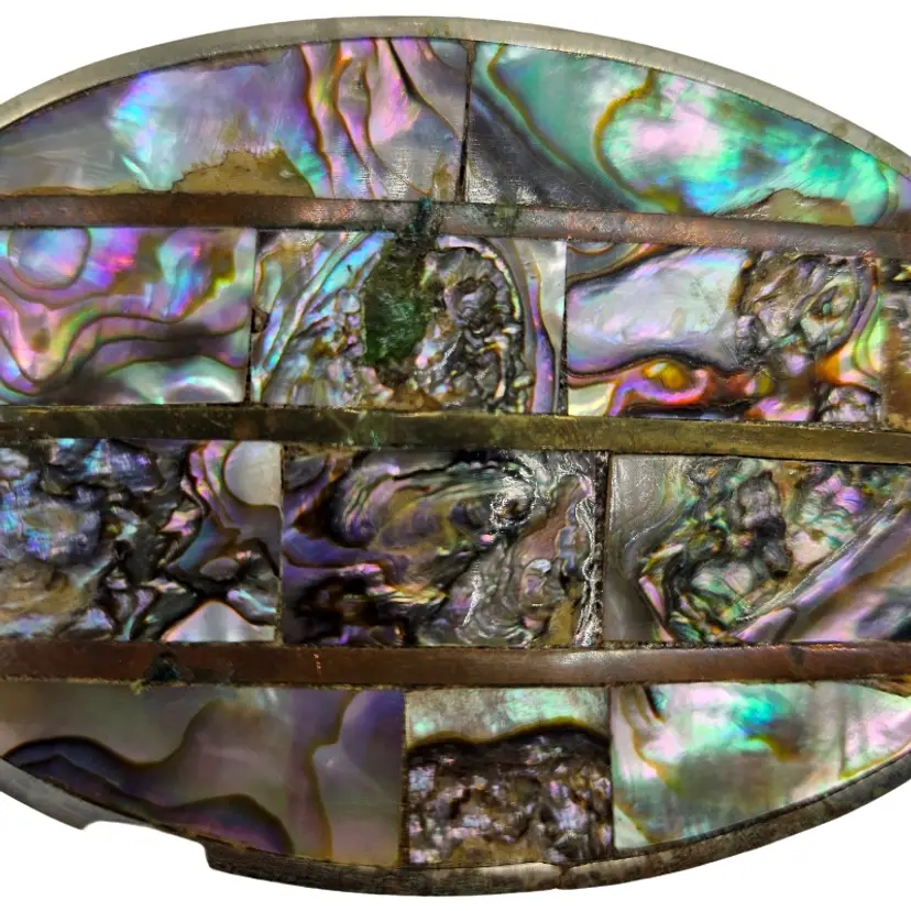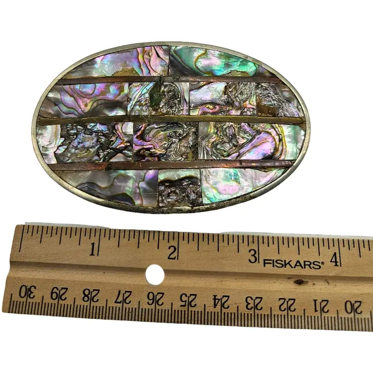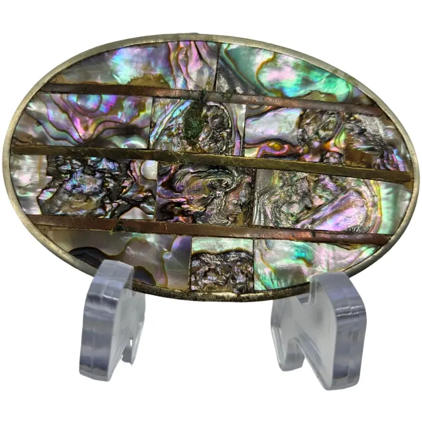 This Vintage Mexican Abalone Shell Inlaid Belt Buckle features a beautiful silver tone metal construction with intricate shell detailing.