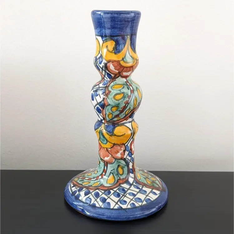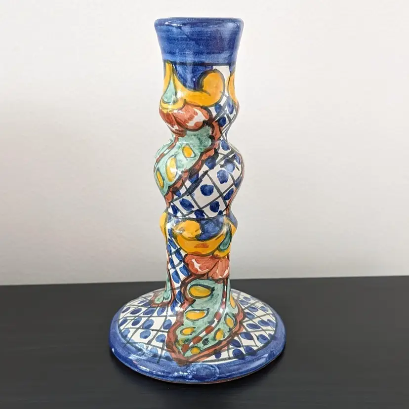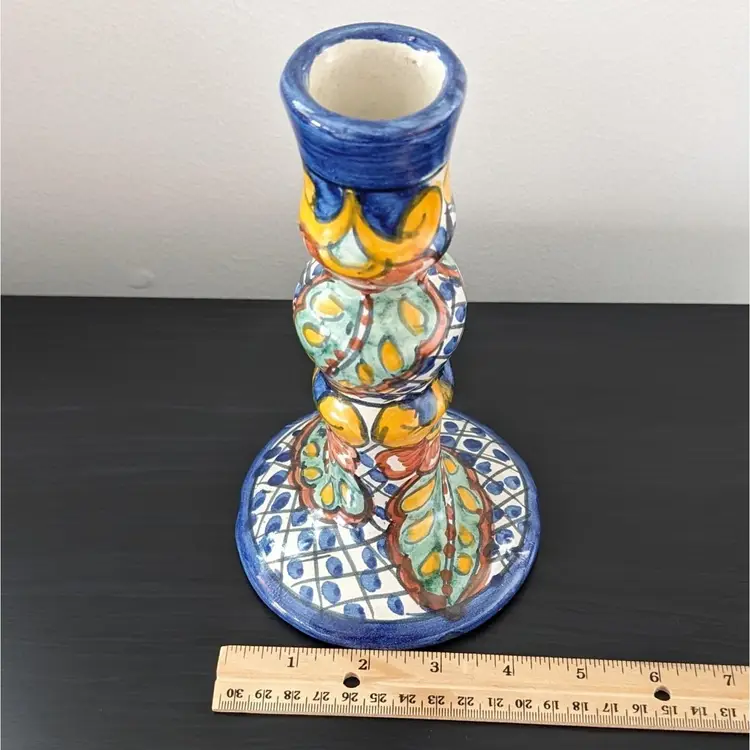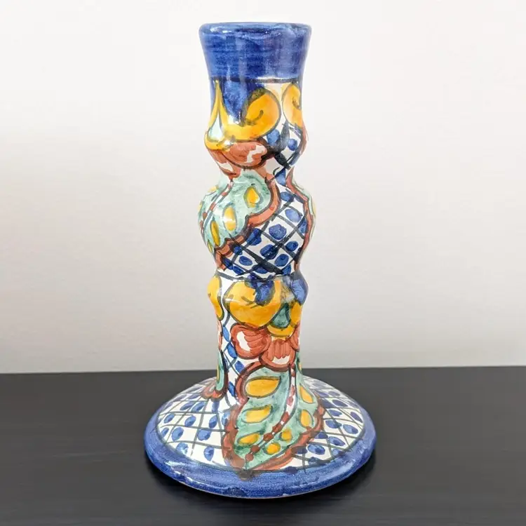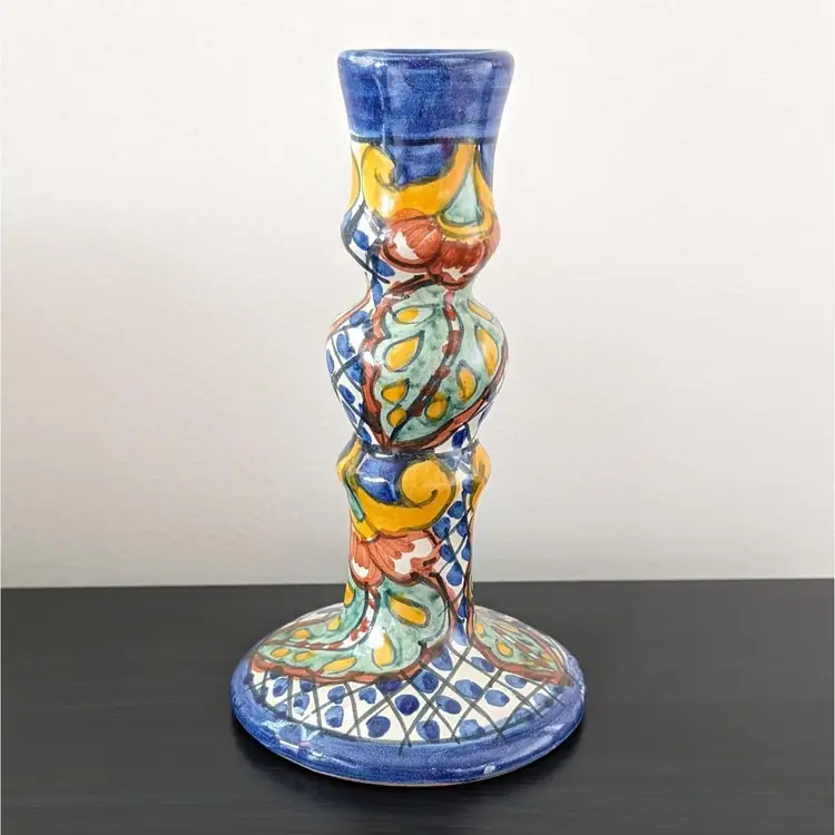 Beautifully painted candlestick that is hollow and fits a variety of taper candles. There is a little wax residue but otherwise in great condition (see pictures).