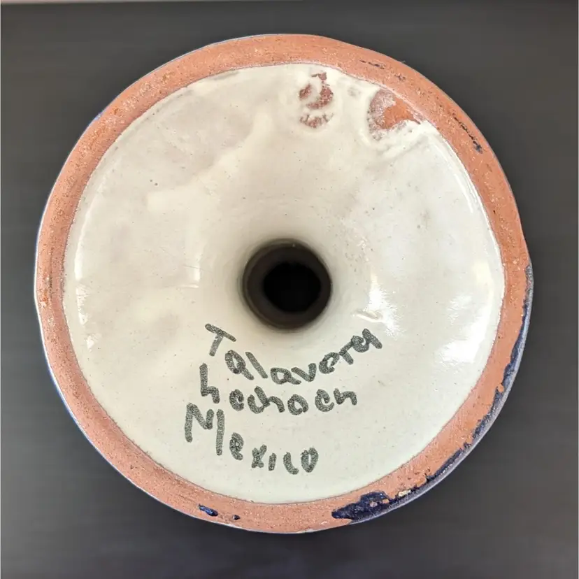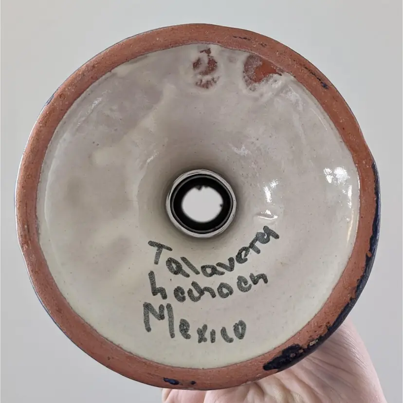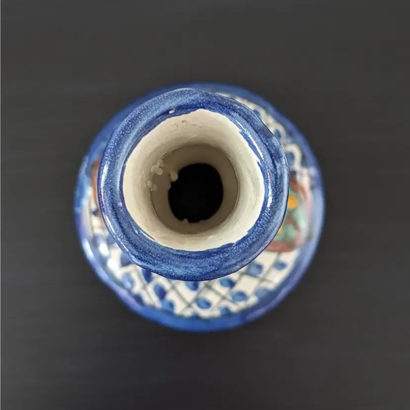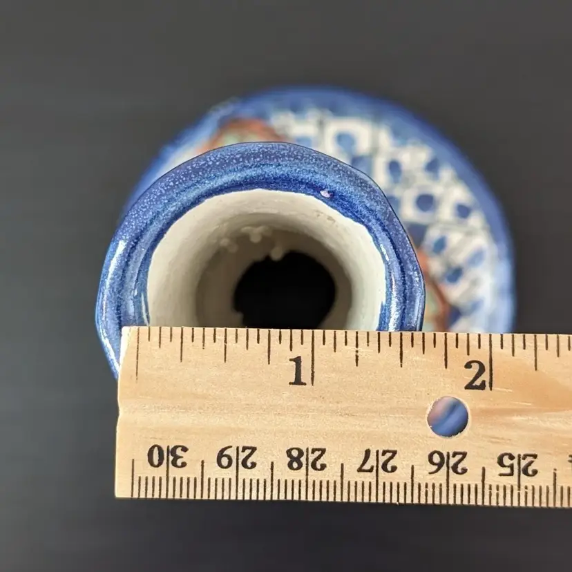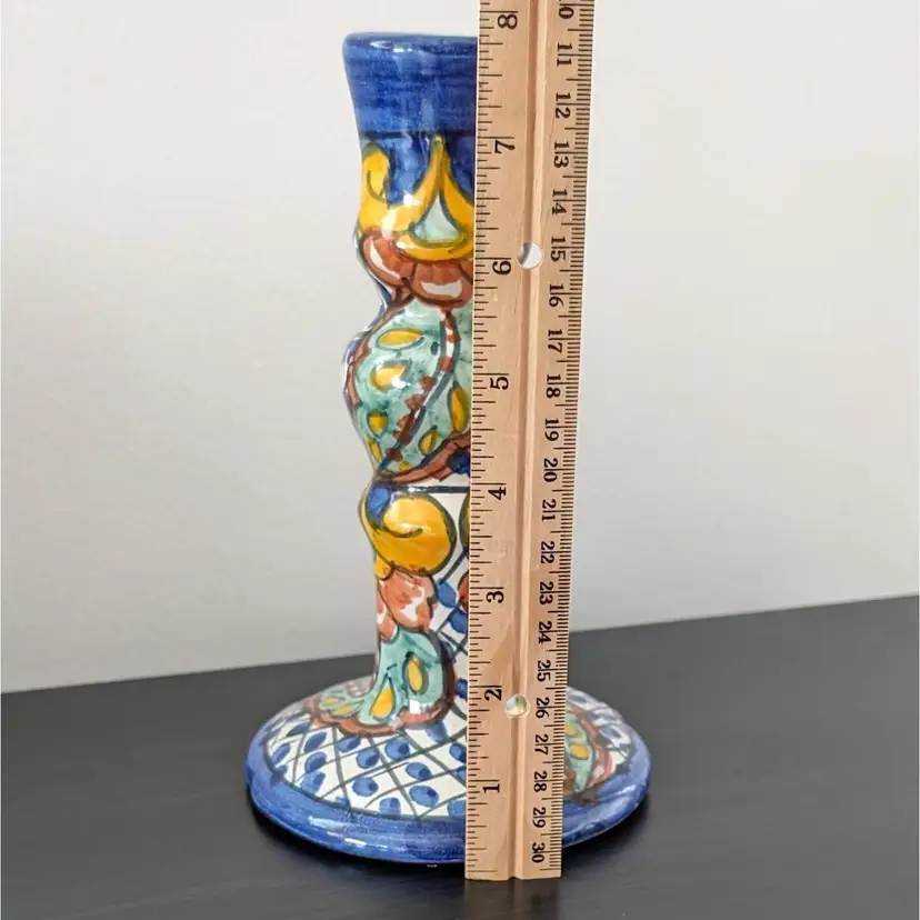 Beautifully painted candlestick that is hollow and fits a variety of taper candles. There is a little wax residue but otherwise in great condition (see pictures).