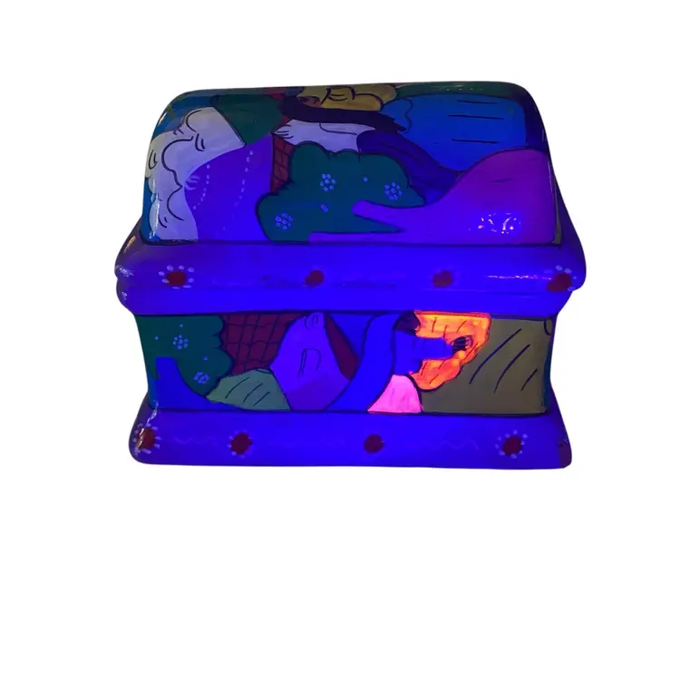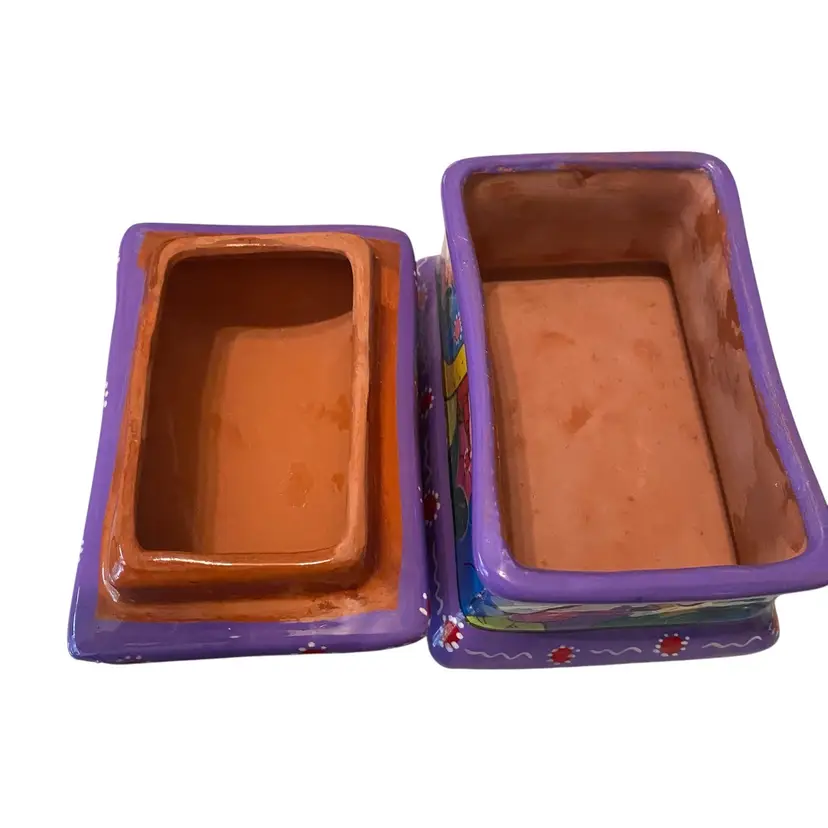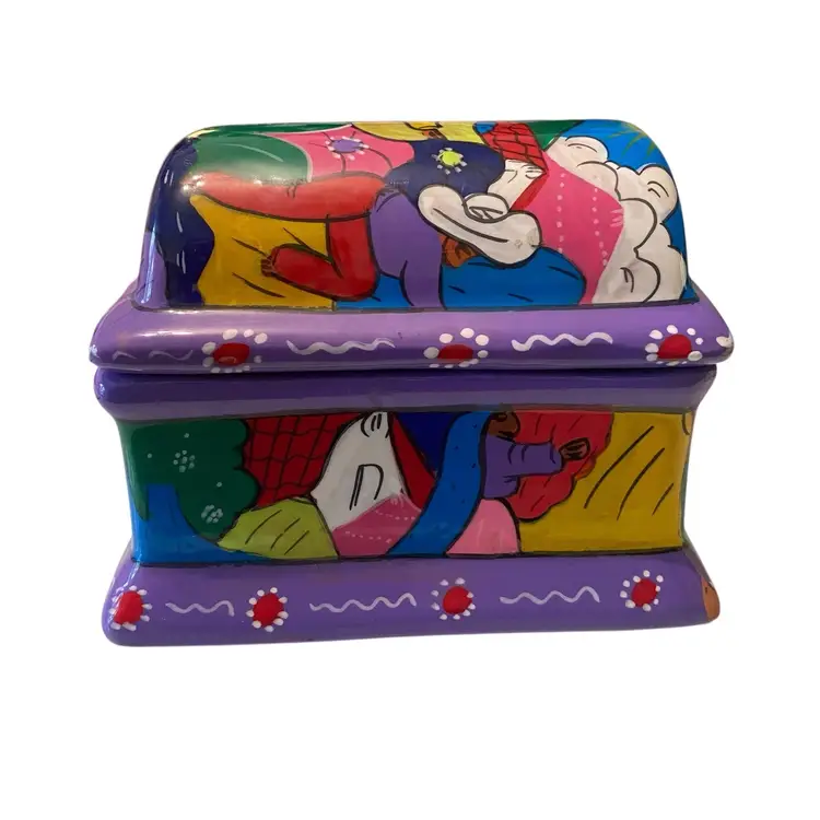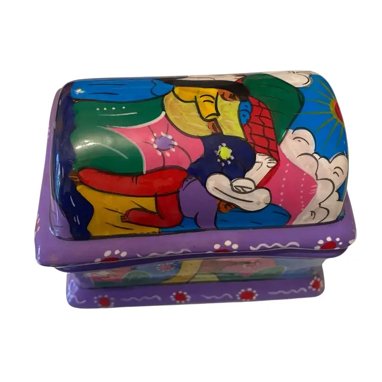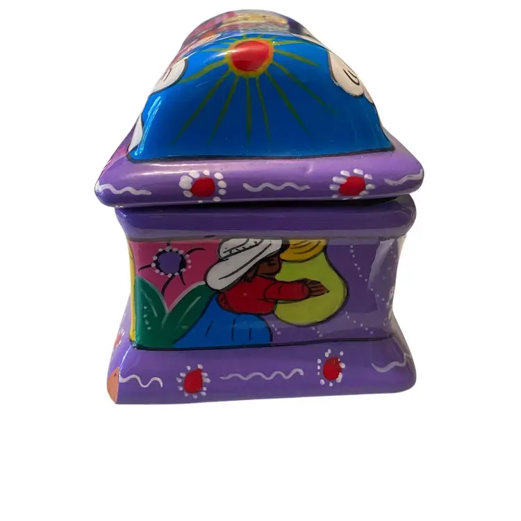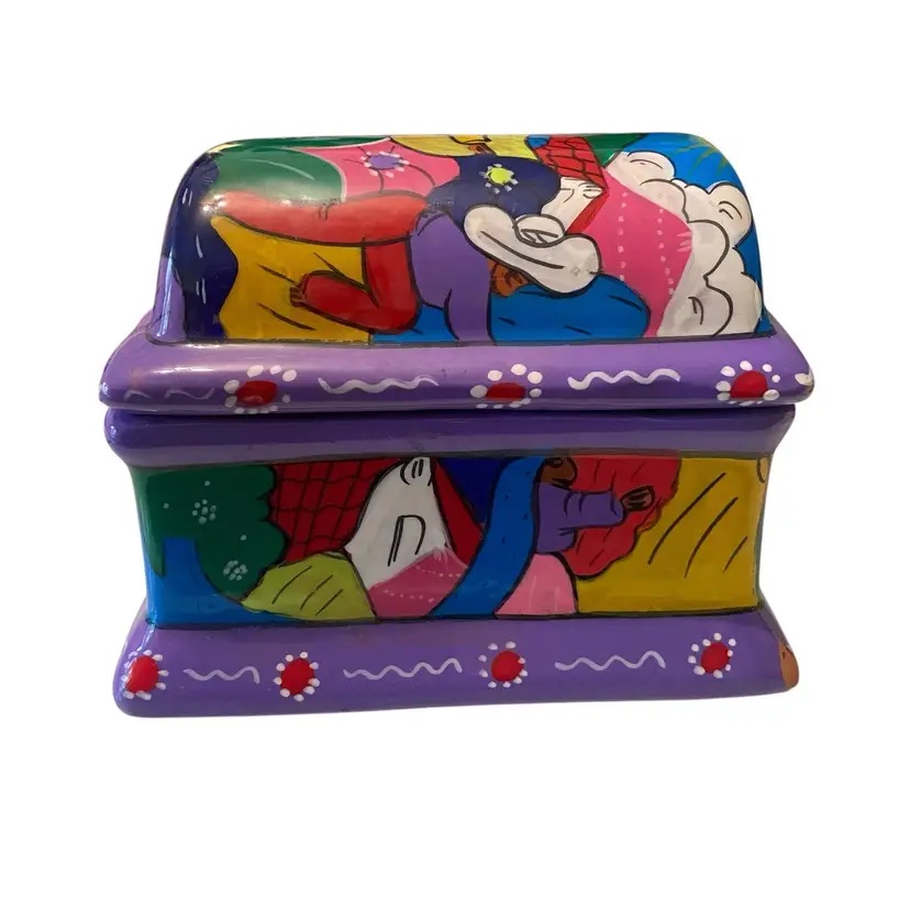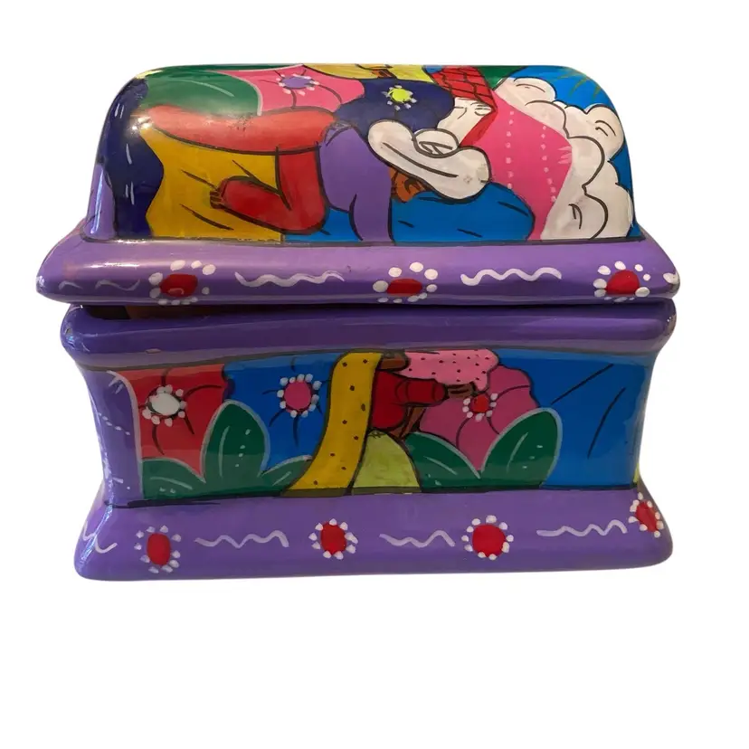 Vintage Mexican Folk Art Hand-Painted Terra Cotta Trinket Box with FloralPeople Design - Unique Keepsake Box 4.75x3x3.5