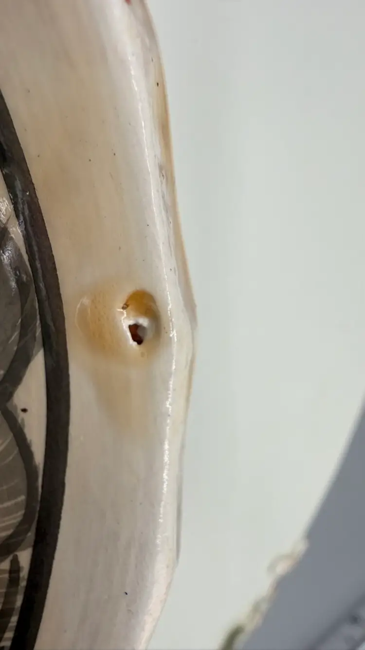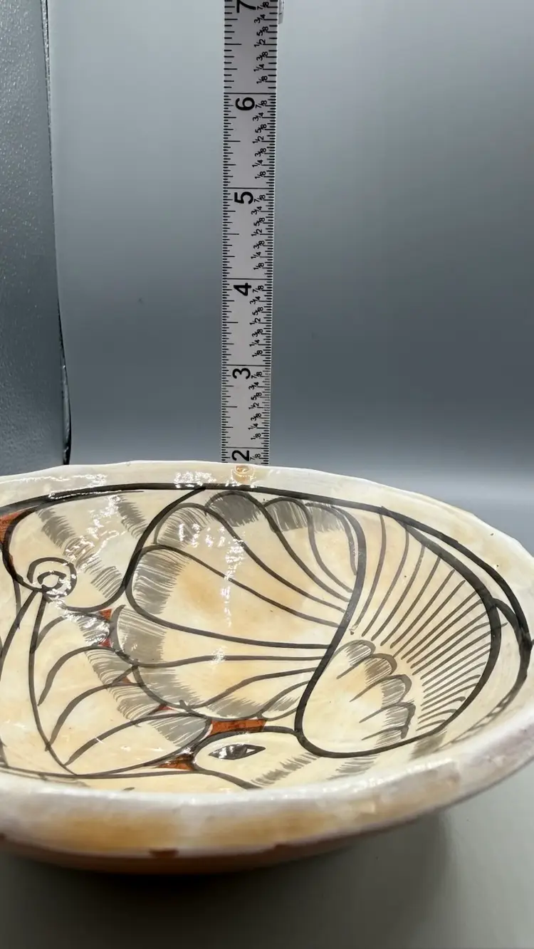 What looks like a chip is a design flaw that is glazed over. Crafted from traditional redware (terracotta) clay with a glossy glaze, it features a distinctive black-lined illustration of a stylized bird and abstract botanical motifs. Commonly associated production from the Michoacán or Tonalá regions. Excellent preowned condition.